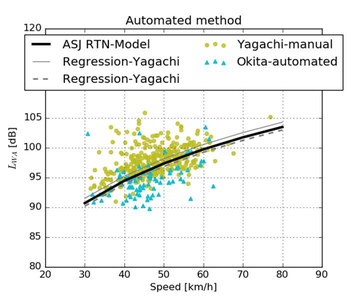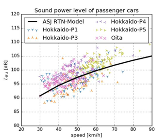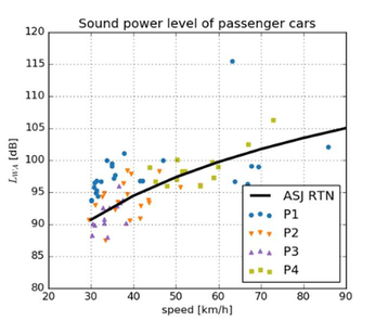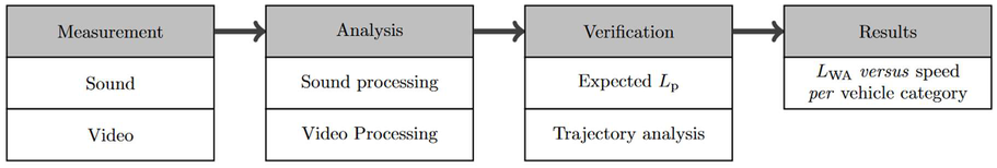 A A A Volume : 44 Part : 2 Automating the assessment of sound power levels of running vehicles using information extracted from a static video Marjorie Takai 1 The University of Tokyo, Graduate School of Engineering 7-3-1 Hongo, Bunkyo-ku, Tokyo 113-8656, Japan Hyojin Lee 2Seoul National University #220 Liberal studies, Seoul National University, 1 Gwanak-ro, Gwanak-gu, Seoul, Korea zipcode 08826 Miki Yonemura 3 , Shinichi Sakamoto 2The University of Tokyo, Institute of Industrial Science 4-6-1, Komaba, Meguro-ku, Tokyo 153-8505, JapanABSTRACT Noise has become a ubiquitous pollutant in big cities, especially Road Traffic Noise compared with other means of transportation. Several countries/regions have developed road noise prediction mod- els based on local measurements, adjusting their requirements and goals for evaluating this pollutant. Differently than most developed countries, industrializing countries have different characteristics of noise generation due to implied differences, such as degree of maintenance (both vehicle and road conditions) and the driving behavior, for instance. The data acquisition needed for evaluating the vehicle fleet's sound power emission is expensive and time-consuming. This research proposes using a video camera close to the microphone to automate the data gathering and analysis. Using a Python script, this system extracts the sound pressure, estimates the running speed, assesses the distance from the receiver point, and classifies the vehicle under investigation. In addition, to discard inaccu- rate data, the expected trajectory and sound pressure are evaluated. The proposed system's perfor- mance was compared against manual measurements. The resulting sound levels differ less than 0.2 dB for most cases. Thus, acquired 3.4 times the amount of data in the same time interval. After this verification, measurements in different conditions and vehicle fleet were tested in Hokkaido, Oita, and São Paulo cities.1. INTRODUCTIONRoad Traffic Noise (RTN) is considered the major contributor of noise in cities [1][2] even when comparing with other means of transportation, such as trains or airplanes, due to the number and the proximity of this source surrounding us. In Europe, several countries developed their RTN prediction models, based on local measurements, adjusting to their requirements and objectives for noise eval- uation. Even with the publication of CNOSSOS [3] in 2012, by the European Union, as an attempt1 takai@iis.u-tokyo.ac.jp, 2 leehj@iis.u-tokyo.ac.jp, 3 m-yone@iis.u-tokyo.ac.jp, 4 sakamo@iis.u-tokyo.ac.jpi, orn inter.noise 21-24 AUGUST SCOTTISH EVENT CAMPUS ? O? ? GLASGOW to standardize the methodology, some countries still use their models locally, like Germany, publish- ing their latest model in 2019 [4]. Thus, the different available methods in the literature, are mostly based on data acquired in measurements locally, as the base for the modeling, integrating several characteristics beyond the interaction of the vehicle and road in the sound source model.Differently than most developed countries, industrializing countries have different characteristics of road traffic noise generation, even with the same physical mechanisms of noise generation, other differences, such legislation, degree of maintenance (both vehicle and road conditions), behavior of the driver - cultural stances, are not addressed in the actual standardized models used in these places because they were created in other countriesi, orn inter.noise 21-24 AUGUST SCOTTISH EVENT CAMPUS ? O? ? GLASGOWThis research attempts to propose a method with automatization of data collection for RTN source modeling to address the lack of characterization of the sound emission regionally, either to a better understanding of understudied places or to update existing databases to comfort new technologies of vehicles and new types of road surfaces.2. SOUND POWER LEVEL ESTIMATIONThe sound pressure level measurement of free running vehicles at constant speed is done from a known perpendicular distance d’ of a strait road section, where the sound level meter (SLM) is posi- tioned at height h show a schematic drawing where R represents the reception point (microphone) position, d is the distance between R and the center of lane, in other words, the minimum distance between R and the moving vehicle, v is the speed of vehicle during the measurement. With this infor- mation, under the assumption of point source emission, the sound power is estimated according to Equation (1).Figure 1: (Right) schematics of sound power level measurements, which shows the position of the microphone ( R ), the receiving point, relative to the vehicle ( s ), the sound source and its ideal sound pressure level, during a vehicle passage in front of the microphone. (Left) example of measurement setting.𝐿 = 𝐿 ,,୫ୟ୶ + 20 log ଵ 𝑑+ 8 (1)Each vehicle passage, is composed by the maximum A-weighted sound pressure level L A,F,max , corresponding to the value when the vehicle is closest to R , speed and vehicle type. Usually, speed, category and distance of each event are obtained during the sound pressure measurements, requiring a person to gather this information. In this research, the characterization of each event is done byarty siese using the information extracted from video recorded by a static video camera placed close to the SLM, as explained in next section.3. AUTOMATION OF DATA GATHERINGThe data gathering process can be time consuming, expensive and prone to human error due to inter- pretations of the executors. In an attempt to improve the data collection, in this research, part of the needed data collection is automated using information from a static video camera, processed using a Python script, reducing the amount of resources, as described below.i, orn inter.noise 21-24 AUGUST SCOTTISH EVENT CAMPUS ? O? ? GLASGOW3.1. Proposed system The measurements were performed using a RION NL-52 SLM and a video camera