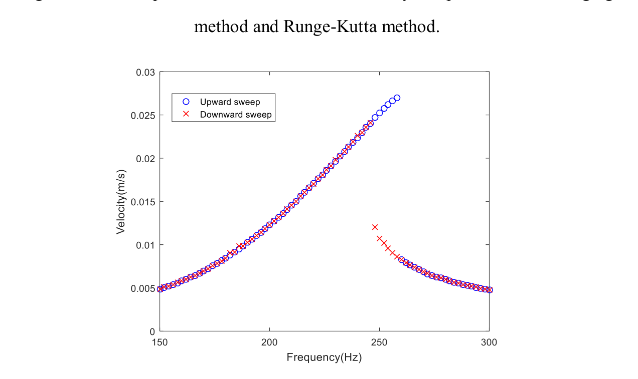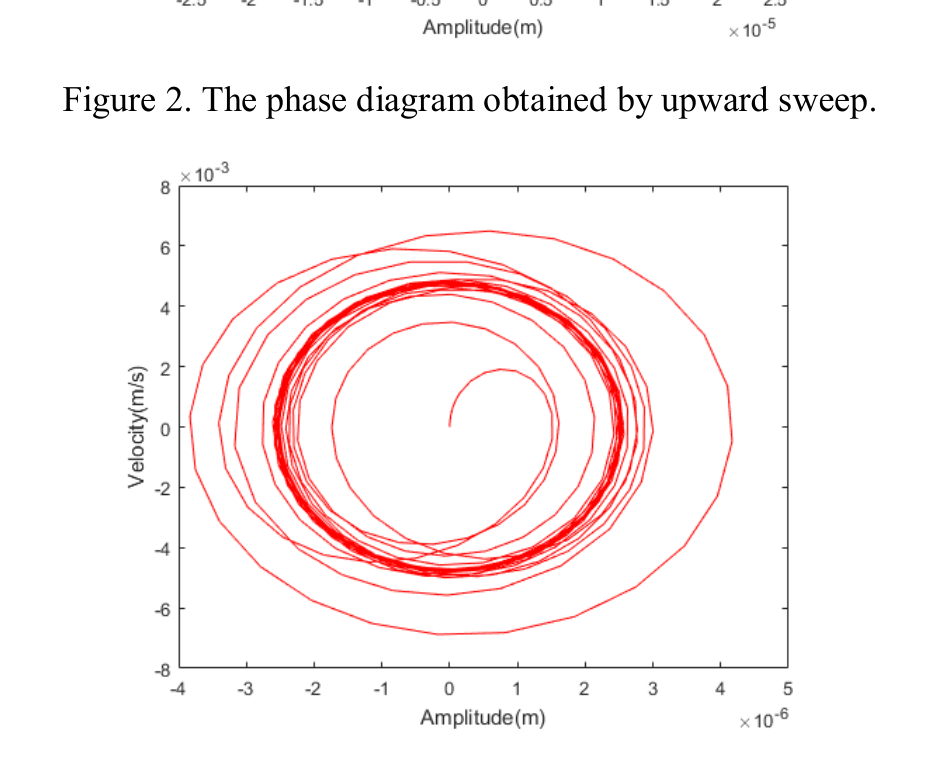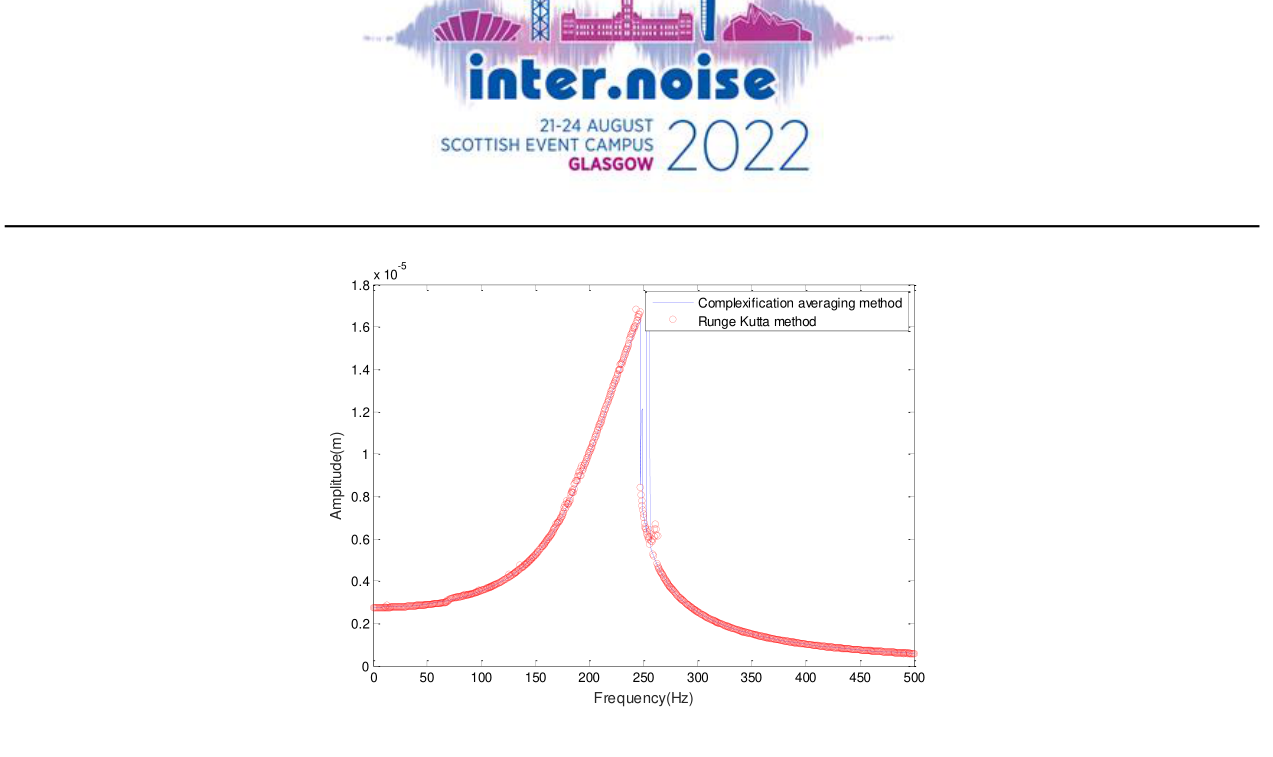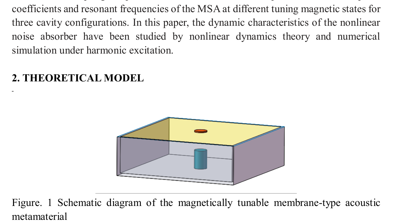A A A Volume : 44 Part : 2 Dynamic analysis of negative stiffness noise absorber withmagnetMin Yang 1 , Weiming Xiao, Erjing Han, Junjuan Zhao, Wenjiang Wang, Yunan Liu Beijing Key Lab of Environmental Noise and Vibration, Institute of urban safety and environmental science, Beijing academy of science and technology No.55, Taoranting Road, Xicheng, Beijing, 100054, ChinaABSTRACT In the paper, the negative stiffness membrane absorber with magnet has been taken as a nonlinear noise absorber. The dynamic characteristics of the nonlinear noise absorber have been studied by nonlinear dynamics theory and numerical simulation. The dynamic equations of the system were established under harmonic excitation. The slow flow equations of the system are derived by using complexification averaging method, and the nonlinear equations which describe the steady-state response are obtained. The amplitude frequency diagram and phase diagram are used to study the nonlinear response of structures. The resulting equations are verified by comparing the results which respectively obtained from complexification-averaging method and Runge-Kutta method. It is helpful to optimize the structural parameters and further improve the sound absorption performance to study the variation of the sound absorption performance of magnet negative stiffness membrane absorber system with its structural parameters. 1 INTRODUCTION In recent years, acoustic metamaterials, because of their exotic properties, have received significant attention from physicists as well as acoustical engineers[1-2]. Among these materials, membrane-type acoustic metamaterials (MAMs) are relatively simple and lightweight and possess the ability to realize a subwavelength scale and tunable absorption design [3]. These properties are particularly important for noise control. Ma et al.[4] reported a novel acoustic m etasurface with hybrid resonances that can achieve robust impedance matching and perfect absorption. However, this type of metasurface has an extremely narrow absorption bandwidth as a result of the causality constraint on the minimal structural thickness [5]. To implement a compact sound absorber and expand bandwidth as much as possible in the low frequency, Zhao et al. [6] propo sed a membrane sound absorber (MSA) with a magnet. The study mainly focused on the absorption of a single state, did not further consider the continuously tunable characteristics and frequency-tuning range of the structure, and, specifically, did not provide a precise theoretical model to quantitatively calculate and predict the1 yangmin@bmilp.com absorption properties. Zhao et al. [7] p resented a theoretical model based on a multi- mechanism coupling impedance method. The model predicts the absorption coefficients and resonant frequencies of the MSA at different tuning magnetic states for three cavity configurations. In this paper, the dynamic characteristics of the nonlinear noise absorber have been studied by nonlinear dynamics theory and numerical simulation under harmonic excitation. 2. THEORETICAL MODELom ega1=Figure. 1 Schematic diagram of the magnetically tunable membrane-type acoustic metamaterialStructurally, a membrane sound absorber consists of three parts: a rectangular membrane with a small cylindrical magnet A , and a cylindrical magnet B to generate a magnetic field, and a cylindrical cavity formed between the solid support frame and membrane; see Fig. 1.This section presents the derivation of a theoretical model to calculate the absorption coefficients using the mode-superposition method. The methods of determining and analyzing the parameters of the theoretical mode superposition model are also described.The equation of motion of the membrane is given by [8] 3 322 f d x t dx t M C Kx t p t S dt d x t k t (1),0 / i i M M , 2 2 i i C M c S andwhere the dot denotes the time derivative, 2the magnetic force between the proof mass and the external magnets is approximatedby 3 1 3 f k x k x , 2 2 21 / i K M c s D k .Complexification averaging method can be used to solve the equation. By introducing a complex function i ti t x t i x t t e(2) x t i x t t e where t denotes the complex conjugate of t , i is an imaginary number sign , is frequency. We can obtain from Eq.(2) i t i te e x i e e x2 i t i t(3)2 i t i tx e i e i xIntroducing Eq.(3) into Eq.(1) , Algebraic equations are obtained3 3 1 3 2 2 2 8 2 k C K SP i i i M M M M 2 3(4)We expressre im i (5)Introducing Eq.(5) into Eq.(4) , Eq. (4) can be divided into its real and imaginary part 3 1 2 2 2 8 2 3 1 2 2 2 8k R SP M MC M M k R 2 2 3NL re re im im re im im(6) 2 2 3NL im im re re re im reM MC MConsidering the steady-state response of the system, we have the following equation 3 1 0 4 3 1 0 4k R SP M MC M M k R M MC M 2 2 3NL re im im re im im(7) 2 2 3NL im re re re im reSubstituting equation Eq. (5) into Eq.(3), the expression of amplitude is2 2 re im x (8)3. NUMERICAL SIMULATION In order to verify the correctness of the derivation process, the results obtained by complexification averaging method and Runge-Kutta method are compared, as shown in Figure 2, which is in good agreement. We choose M =0.0027, C ms = 0.2185mmN -1 , S =0.0032, K = 2.2143, k 3 = 5.5849*10 13 .The velocity and phase diagram of upward sweep and downwarp sweep are shown in Figure 3, Figure 4 and Figure 5. -5x 101.8Complexification averaging method Runge Kutta method1.61.41.2Amplitude(m)10.80.60.40.20 50 100 150 200 250 300 350 400 450 500 0Frequency(Hz)Figure 2. The comparison between results obtained by complexification averagingmethod and Runge-Kutta method.Figure 3. The comparison between velocity results obtained by upward sweep anddownwarp sweep. Figure 2. The phase diagram obtained by upward sweep.Figure 2. The phase diagram obtained by downwarp sweep.4. CONCLUSIONIn the paper, the negative stiffness membrane absorber with magnet has been taken as a nonlinear noise absorber. The dynamic characteristics of the nonlinear noise abso