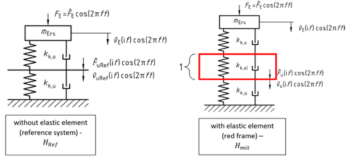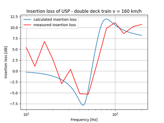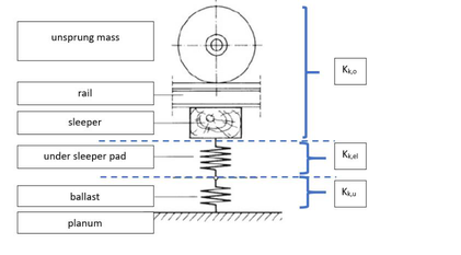 A A A Volume : 44 Part : 2 Modeling the Influence of Under-Sleeper Pads on the Vibration Emis- sions from Railway Traffic Nils Mahlert 1 DB Systemtechnik GmbH Völckerstraße 5, D - 80939 Munich, Germany Sascha Hermann 2 DB Systemtechnik GmbH Völckerstraße 5, D - 80939 Munich, Germany Dr. Haike Brick 3 German Centre for Rail Traffic Research August Bebel-Straße 10, D - 01219 Dresden, Germany Rüdiger Garburg 4 Deutsche Bahn AG Europaplatz 1, D - 10557 Berlin, GermanyABSTRACT One of the aims of the European research project FINE-2 is to contribute to reducing noise and vibrations caused by railway traffic. In this context, the development of models describing the influence of relevant parameters on the excitation of train-induced vibration emissions were investigated in the “Ground Vibration” work package (WP 8), which is led by DB Systemtechnik. Here, resilient track components and especially under-sleeper pads were con- sidered by a new modelling approach. The model is based on the German standard DIN 45673- 4, which describes an approach to compute the insertion loss of under-ballast mats by using an impedance model. It is highly dependent on the dynamic stiffness of the relevant superstructure components. The paper shows a general description of the model, the steps taken to adapt the existing model to consider under-sleeper pads instead of under-ballast mats as well as results validated by using existing measurements. 1. INTRODUCTIONFor planning new lines or upgrading existing lines, ground vibrations caused by railway traffic must be taken into account. The European research project FINE-2 contributes to reducing the annoyance caused by vibrations by developing calculation methods and software solutions for predicting vibra- tion emissions from railway traffic. The FINE-2 project is divided in different work packages (WP). Within the “Ground Vibrations” work package (WP 8), mathematical models describing the influence of relevant parameters on the excitation and transmission of vibrations were developed [6]. This in- cluded investigating the influence of elastic elements as under-ballast mats and under-sleeper pads1 Nils.Mahlert@deutschebahn.com 2 Sascha.Hermann@deutschebahn.com 3 BrickH@dzsf.bund.de 4 Ruediger.Garburg@deutschebahn.comworm 2022 on railway-induced vibrations. For this purpose, an impedance model based on the dynamic stiffness characteristics of the individual superstructure components according to DIN 45673-4 [1] was used. The procedure described in the standard was originally proposed for under-ballast mats but can be used also for the computation of the efficiency of under-sleeper pads.This paper explains the general model description of the standard DIN 45673-4 [1] for under- ballast mats and the steps taken to adapt the existing model to consider under-sleeper pads. In addi- tion, the results of the developed model are presented and compared with existing measurements. 2. EXISTING MODEL FOR UNDER-BALLAST MATSUnder-ballast mats are elastic elements situated below the ballast. In order to model their influence on the railway-induced vibration, the modelling approach of the standard DIN 45673-4 can be used [1]. The approach calculates the insertion loss by considering an equivalent mass-spring-system with one degree of freedom and subtracting the transfer function of the system with the elastic element 𝐻 𝑚𝑖𝑡 from the transfer function of the system without the elastic element 𝐻 𝑅𝑒𝑓 (Figure 1).j ferheostans — TF agincostant keg ‘TL Atlifcostanen [Fara costanen hey ‘without elastic element (reference system) - Hey {| Fe=Fecos(2ntey 4 FF eineostonen Fi Mae pincstetn Paimeesanrh Ln with elastic element (ced frame) ~ HoeFigure 1: Equivalent mass-spring-system with and without the elastic element [1].The insertion loss 𝐷 𝐹 ሺ𝑓ሻ is defined as the quotient of both transfer functions in a logarithmic representation:(1)𝐷 𝐹 ሺ 𝑓 ሻ = 20 log 10 ቤ 𝐻 𝑅𝑒𝑓 ሺ𝑖𝑓ሻ𝐻 𝑚𝑖𝑡 ሺ𝑖𝑓ሻ ቤThe formula for the transfer function 𝐻 𝑅𝑒𝑓 ሺ𝑖𝑓ሻ of the reference system without the elastic element is defined as follows:(2)𝐻 𝑅𝑒𝑓 ሺ𝑖𝑓ሻ= 𝑘 𝑅𝑒𝑓 ሺ𝑖𝑓ሻ 𝑘 𝑅𝑒𝑓 ሺ𝑖𝑓ሻ−ሺ2𝜋𝑓ሻ 2 𝑚 𝐸𝑟𝑠with 𝑓 frequency 𝑚 𝐸𝑟𝑠 dynamic mass of the vehicle and the track(3)𝑘 𝑅𝑒𝑓 ሺ 𝑖𝑓 ሻ = ሺ 1 𝑘 𝑘,𝑜 ሺ𝑖𝑓ሻ + 1 𝑘 𝑘,𝑢 ሺ𝑖𝑓ሻ ሻ −1 = 𝑘 𝑘,𝑜 ሺ𝑖𝑓ሻ∙ 𝑘 𝑘,𝑢 ሺ𝑖𝑓ሻ𝑘 𝑘,𝑜 ሺ𝑖𝑓ሻ+ 𝑘 𝑘,𝑢 ሺ𝑖𝑓ሻworm 2022 𝑘 𝑘,𝑜 ሺ𝑖𝑓ሻ complex dynamic stiffness of the upper part system (includes the superstructure com- ponents above the elastic element) 𝑘 𝑘,𝑢 ሺ𝑖𝑓ሻ complex dynamic stiffness of the bottom part system (includes the superstructure com- ponents under the elastic element) The formula for the transfer function 𝐻 𝑚𝑖𝑡 ሺ𝑖𝑓ሻ of the system with the installed elastic element is defined as follows:𝐻 𝑚𝑖𝑡 ሺ𝑖𝑓ሻ= 𝐹 𝑢 ሺ𝑖𝑓ሻ(4)= 𝑘 𝑚𝑖𝑡 ሺ𝑖𝑓ሻ 𝑘 𝑚𝑖𝑡 ሺ 𝑖𝑓 ሻ − ሺ 2𝜋𝑓 ሻ 2 𝑚 𝐸𝑟𝑠𝐹 𝐸with𝑘 𝑚𝑖𝑡 ሺ𝑖𝑓ሻ= ሺ 1 𝑘 𝑅𝑒𝑓 ሺ𝑖𝑓ሻ + 1 𝑘 𝑘,𝑒𝑙 ሺ𝑖𝑓ሻ ሻ −1 = 𝑘 𝑅𝑒𝑓 ሺ𝑖𝑓ሻ∙ 𝑘 𝑘,𝑒𝑙 ሺ𝑖𝑓ሻ𝑘 𝑅𝑒𝑓 ሺ𝑖𝑓ሻ+ 𝑘 𝑘,𝑒𝑙 ሺ𝑖𝑓ሻ (5)𝑘 𝑘,𝑒𝑙 ሺ𝑖𝑓ሻ complex dynamic stiffness of the elastic element 3. ADAPTED MODEL FOR UNDER-SLEEPER PADSAn under-sleeper pad is an elastic intermediate layer installed underneath a concrete sleeper, i.e. above the ballast For the pads, various materials as polyurethane, rubber or cork with different mate- rial properties were used in the past. Their field of application lies primarily in the reduction of vi- 
