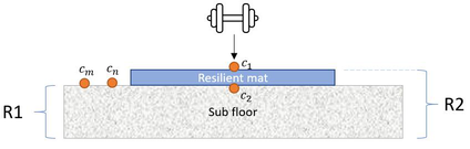 A A A Volume : 44 Part : 2 Prediction of impact noise from gym sources on resilient matting Nikhilesh Patil 1 Hoare Lea 601 Royal Exchange, Manchester, M2 7FL Martin McNulty 2 Hoare Lea 601 Royal Exchange, Manchester, M2 7FLABSTRACT Controlling impact noise from heavy weight drops continues to be a challenging design issue in new and existing gyms. Within the design and prediction phases, in-situ measurements on bare slab and flooring test samples are often required to reduce uncertainty. However, these can be intrusive, and there is no consistent test methodology within the industry as of yet. This is further complicated by the nature of problem – a large number of source mass and height combinations and potential floor- ing test samples to be tested with such source combinations. Emerging guidance within the UK is likely to fill gaps on predictions for typical gym floors with reliance on engineering grade assump- tions and empirical limits. However, this does not necessarily subside the need for robust in-situ test data to complement such predictive approaches. As such, there is a need for a methodology which bridges the gap between prediction and in-situ test elements which is reliable, time efficient and can be used for predictions on wider source cases and in varied locations or structures. The paper dis- cusses potential ways of simplifying prediction and testing strategies with a view to estimating the noise and vibration levels from gym floors with resilient layer. It is shown that if certain quantities can be independently characterized in a laboratory, then this would avoid the need of weight drop testing in-situ.1. INTRODUCTIONControlling impact noise from gyms continues to be a design challenge to acoustic consultants world- wide and the adverse health effects are becoming well documented [1]. Whilst gyms have been iden- tified as a wish-list item in choosing a residential apartment, this driver has not done enough to push designers towards a robust approach in predicting its impact. To date, there is no consistent or ac- ceptable standard to predict gym impact noise that can be readily applied in early stages of design. The onus is rather put on control stage in a rather heavy-handed approach of high-performance heavy mass floating floors. This still requires a level of iterative testing on smaller samples and offers little room for optimization. For example, the architectural, cost allowance may not allow for the best floating floor and end user expectations may deviate from what a mitigation system (e.g., floating floor) has been designed in for.1 nikhileshpatil@hoarelea.com2 martinmcnulty@hoarelea.comworm 2022 There is an emerging consensus that such acoustic design issues could be potentially solved with a robust prediction method. When this prediction method (either wholly measurement-base, wholly simulation-based or a combination of the two) can be applied early on in the design process this can highlight expected mitigation or control system to be used on a case-by-case basis.2. IMPACT NOISE FROM GYMSIn typical gym setting, the problem of impact noise has to be dealt with a mitigation solution. This can take form of a floating floor or resilient matting or a combination of the two. Resilient mats can exhibit non-linearity (stiffening) with increased impact loads and can offer added complexity in the predictions. In this paper, we have targeted the problem in the linear range, where the loads do not significantly lead to local stiffening from excessive compression at the impact location.During a testing stage on site to determine the in-situ performance, often a number of matting combinations are tested. This can become cumbersome when a number of mass-height combinations of the weight drops are to be tested manually. The number of unlimited permutations can make it practically impossible to simulate every scenario within a typical test period. A judgement has to be made on part of the consultant and the end user feedback on types or weights and user patterns (if known) to simulate the most likely impact event(s). However, that still does not get rid of the require- ment to test multiple combinations of weights.One potential way of addressing this is a hybrid approach – whereby in-situ data of the re- ceiver (sub floor) and dynamic characteristics of the resilient matting can be combined in a prediction model to enable simulation and prediction for a range of impacts and mats in a time effective manner. This would limit the need of testing multiple weights on site. Furthermore, if a library of laboratory test data of the right dynamic characteristics of the mats is available, the modelling may allow for optimized selection of mats based on predictions. The question now arises as to whether such an approach is feasible and if so, what characteristics can be adequately coupled for the receiver (sub floor) and the isolating material (the resilient matting). To this end, a discussion and methodology is presented in the next section. 3. METHODOLOGYLet us represent the physical system as a source receiver system. For the sub floor, assuming the construction is test ready, the response of the floor to a known force can be established. This can be obtained in terms of an Accelerance (Acceleration/force, A ) or Mobility (Velocity/force, Y ) Fre- quency Response Function (FRF) which characterizes the vibration response of the floor slab to a unit force excitation at an impact location. Note that similarly a vibracoustic FRF (sound pres- sure/force) could also be measured but this is generally sensitive to background noise. If the mat is also considered a part of the receiver, then these FRFs can be measured with the mat included (i.e., with the excitation on top of the mat). Therefore, depending on whether the resilient matting is in- cluded as part of the source we can characterize two forces, namely, Forces above the mat into the mat-floor receiver (R1) Forces below the ma