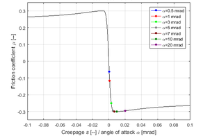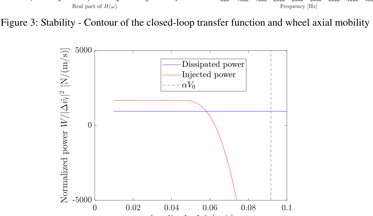 A A A Volume : 44 Part : 2 Modelling of wheel/rail squeal noise in curves from mono-harmonic vibratory limit cycles Olivier Chiello 1 UMRAE, Univ Gustave Eiffel, IFSTTAR, CEREMA, Univ Lyon, F-69675, Lyon, France Rita Tufano, Martin Rissmann 2 Vibratec, Railway Business Unit, 28 chemin du petit bois, 69131 Ecully Cedex, FranceABSTRACT Most of the works in the literature agree to attribute the generation of wheel/rail squeal noise in curves to the important lateral slip imposed in the curve and the resulting instabilities. In models, the occurrence of the phenomenon is thus generally studied through a stability analysis based on the linearization of the contact forces. Despite its undeniable interest, the stability analysis does not al- low the prediction of the amplitudes of the nonlinear self-sustained vibrations resulting from the in- stabilities. These nonlinear vibrations are most often calculated using a numerical integration of the dynamic equations of the system in the time domain. Some authors have proposed simplified methods allowing a direct calculation of stationary regimes, but limited to a reduced modal description of the system dynamics. In this presentation, an original method is proposed to determine approximate limit cycles from the wheel/rail contact mobilities expressed in the frequency domain. The contact conden- sation allows to be both more general and more functional to describe the dynamics of structures, in particular the one of the rail. Assuming a mono-harmonic vibratory cycle, the corresponding ampli- tude is determined from a power balance and the squeal level at the considered pulsation is obtained from analytical radiation factors.1. INTRODUCTIONSince Rudd [1], most of the works in the literature agree to attribute the generation of wheel/rail squeal noise in curves to the high lateral slip imposed in the curve and to the resulting instabilities [2]. In squeal models, the occurrence of the phenomenon is thus generally studied through a stability analysis based on the linearization of the contact forces. Two families of methods are used: those leading to a generalized eigenvalue system via a modal description of the system [3] and those de- scribing the wheel/rail interaction at the contact's degrees of freedom using their respective mobilities (Nyquist criterion) [4].Despite its undeniable interest, stability analysis does not allow the prediction of the amplitudes of the nonlinear self-sustained vibrations resulting from instabilities, which is a necessary step for the determination of the squeal noise levels and thus for the comprehension of the severity of squeal instabilities. These nonlinear vibrations are most often calculated using a numerical integration of the dynamic equations of the system in the time domain. As in the case of stability analysis, these equa- tions are based either on a modal description [3] or on contact condensation, but this time from the wheel/rail impulse responses [5]. The possible stationary regimes or "limit cycles" obtained are then1 olivier.chiello@univ-eiffel.fr2 martin.rissmann@vibratec.frworm 2022 re-expressed in the frequency domain for the calculation of the acoustic radiation and the comparison with experimental data. A disadvantage is that the integration has to be carried out over a sufficiently long period of time for the transient regime to stabilize.Some authors have proposed simplified methods allowing a direct computation of stationary re- gimes [1,6,7]. These methods are mainly based on the assumption of mono-harmonic limit cycles. Unfortunately, they are limited to a reduced modal description of the system dynamics: one wheel mode [1,6] or one wheel mode and one rail mode [7]. In this paper, a more general method using wheel/rail mobilities is proposed to determine approximate limit cycles.2. DESCRIPTION OF THE MODEL2.1. Main assumptions and contact mobilities The studied configuration is shown in Figure 1. The pass-by of the guided vehicle at speed 𝑉 in a curve of small radius is characterized by a high angle of attack of some wheels, in particular the front inner wheel of the vehicle bogies. The angle of attack 𝛼 designates the misalignment of the wheel axis with the rolling direction tangent to the rail and leads to the lateral slip of the wheel on the rail head at a speed 𝑉 𝑡 ≈𝛼𝑉 .worm 2022Figure 1: Position of the problemIn the model, the interaction of a single wheel with the rail is considered. The flange contact that often occurs, especially on the outer wheels, is not considered. The wheel/rail interaction is point-like and reduced to the vertical and lateral directions. Two degrees of freedom at the contact, normal and tangential, are thus considered. The wheel and the rail are described by their point and cross mobilities 𝑌 𝑊𝑡𝑡 , 𝑌 𝑊𝑛𝑛 , 𝑌 𝑤𝑡𝑛 , 𝑌 𝑅𝑡𝑡 , 𝑌 𝑅𝑛𝑛 and 𝑌 𝑅𝑡𝑛 at the contact’s degrees of freedom in the frequency domain where subscripts 𝑊 , 𝑅 , 𝑛 and 𝑡 stand for wheel, rail, normal and tangential contact’s degree of free- dom. These mobilities can be determined using various types of models.An eulerian referential in the axle moving frame is considered. Rotation (for the wheel) and mov- ing (for the rail) dynamic effects are neglected in this paper but they could be advantageously con- sidered in the computation of contact mobilities.2.2. Contact and friction laws The contact is modelled by Hertz’s normal stiffness 𝑘 𝐻 and Mindlin’s tangential stiffness 𝑘 𝑀 lead- ing to normal and tangential point mobilities 𝑌 𝐶𝑛𝑛 = 𝑘 𝐻−1 and 𝑌 𝐶𝑡𝑡 = 𝑘 𝑀−1 (see for instance rolling noise models [8]) while a nonlinear friction/creep law is considered for friction. With such a law, the total friction force 𝑓 𝑡 acting at the wheel/rail interface can be related to the wheel/rail creep 𝑠 and the normal contact force 𝑓 𝑛 by the followi