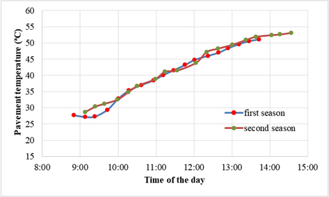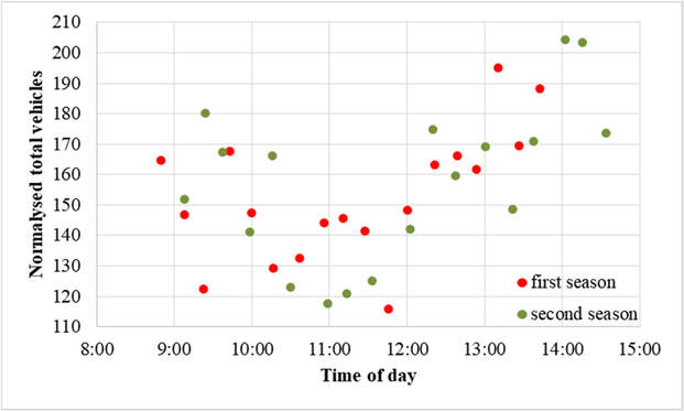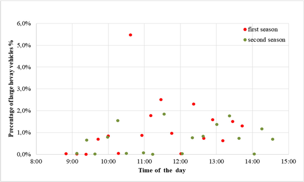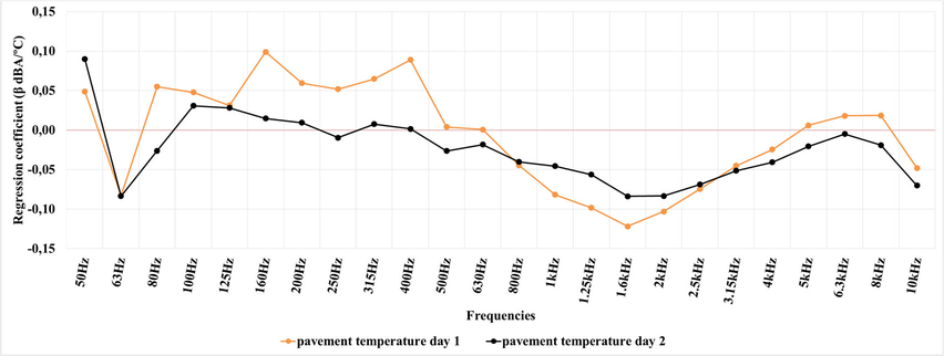 A A A Volume : 44 Part : 2 A methodological proposal to measure rolling noise under real road use conditions Pedro Atanasio-Moraga 1 Laboratorio de Acústica (Lambda), Departamento de Física Aplicada, INTERRA, Universidad de Extremadura. Avda. de la Universidad, s/n, 10003 Cáceres, Spain. Manuel Sánchez Fernández 2 Universidad de Extremadura, INTERRA, NEXUS, Avda. de la Universidad s/n, 10003 Cáceres, Spain. Guillermo Rey-Gozalo 3 , David Montes González 4 , Rosendo Vílchez-Gómez 5 , Alicia Bachiller León 6 , Juan Miguel Barrigón Morillas 7 Laboratorio de Acústica (Lambda), Departamento de Física Aplicada, INTERRA, Universidad de Extremadura. Avda. de la Universidad, s/n, 10003 Cáceres, Spain. ABSTRACTinter noise 21-24 AUGUST SCOTTISH EVENT CAMPUS GLASGOWThe consideration of temperature as a factor influencing the sound power generated by tyre contact with the road has been known for several decades. However, the introduction of this effect in the methods recommended for the elaboration of strategic maps is very recent. So far, there is an extensive scientific literature that studies this issue using different standardised methods. They generally involve controlled conditions for different variables, for example, the type of tyre. On the other hand, studies presenting methodologies for measuring the effect of temperature on rolling noise, under normal road use conditions and using the basic indicators for the preparation of noise maps, are very recent. This study presents a methodological proposal to measure the effect of air and pavement temperature. The spectral analysis differs in low band frequency from the results reported in the literature for controlled conditions or with the recommendations of CNOSSSOS-EU, being similar in mid and high bands frequencies.1 pedroam@unex.es 2 msf@unex.es 3 guille@unex.es 4 davidmg@unex.es 5 vilchez@unex.es 6 aliciabachiller@unex.es 7 barrigon@unex . es 1. INTRODUCTIONRoad traffic is the main source of noise in cities even in quiet areas or in vulnerable buildings [1, 2]. In fact, most noise maps only model road traffic [3]. Noise generated by road traffic is conditioned by multiple factors. Thus, the characteristics of the infrastructure itself, the characteristics of the road traffic and environmental factors influence the sound levels recorded on roads. The own characteristics of infrastructure are parameters that can be controlled in the design, modification, or maintenance process. Some of these characteristics are the type of pavement, the state of preservation, the design of the geometry, etc. In contrast to the factors associated with the infrastructure itself, those associated with traffic characteristics, such as vehicle flow, speed, type of vehicles, their inherent characteristics or the tires used, are more complex to control generally due to the degree of accessibility of roads. Regards meteorological factors, these affects both the propagation and the generation of sound energy. The influence of air and pavement temperature on sound pressure level generation is studied in scientific literature [4-9]. These works are developed on the basis of reference standards for the acoustic characterization of a pavement. In general, the relationship between the sound pressure level and the temperature of the air or roadway is carried out through linear relationships. The variability found are between -0.03 and -0.11 dBA/°C. Some authors [4-6] analyse the effect described in 1/3 octave bands, showing different behaviours depending on the frequency. Generally, a higher ratio is observed at high and low frequencies, meaning low frequency as 31.5 Hz to 630 Hz, medium frequency as 800 Hz to 1250 Hz and high frequency as 1.6 kHz to 5 kHz, and negative coefficients of temperature-sound level ratio, based on a linear relationship. Anfosso-Lédée et al. [4] observe that temperature affects the sound pressure level with greater magnitude in the low frequency range from 125 Hz to 500 Hz, and in high frequency from 1.6 kHz to 5 kHz. In general, these results show a trend of decreasing sound level with increasing temperature. However, in the analysis in 1/3 octave bands between 125 Hz and 315 Hz, it is evident that an increase from 21 °C to 26 °C produces an increase in the sound level registered at these frequencies. The 1/3 octave frequency analysis performed by Bühlmann et al. [6] shows that the sound level is inversely proportional to temperature. The quality criterion established in this work, studied by linear regression, is standard error ≤ 0.2dBA or R 2 ≥ 0.9. The values found vary according to the type of tire, the material, and the road porosity. The frequencies that showed the most significative relationship respect the sound level recorded were found at medium frequency (800 Hz to 1250 Hz). The sound level-temperature relationship in 1/3 octave bands is also analysed by Bueno [5] at frequencies from 200 Hz to 16 kHz. Overall, it shows an inversely proportional relationship between temperature and sound level. The 200 Hz and 250 Hz frequencies show a coefficient of regression close to zero (˂-0.02). The value of the largest magnitude (≈ -0.10) is recorded at the 2 kHz frequency. In the work of Bühlmann the coefficient of linear variation of sound level with respect to temperature is -0.06 in broadband. This paper proposes a method to measure the effect of air and pavement temperature on sound levels on a two-way road with high traffic flow. Eighteen measurements were carried out in each of the two consecutive days, with similar atmospheric and traffic conditions to reduce the variability related to these factors, in a flat and absorbing area from the acoustic point of view. Relationship between L N and the air and pavement temperature for each day was obtained. 2. METHODOLOGYIn this study, in situ measurements were carried out in the N-521 national road (Figure 1), which connects Cáceres with Malpartida de Cáceres, in Extr