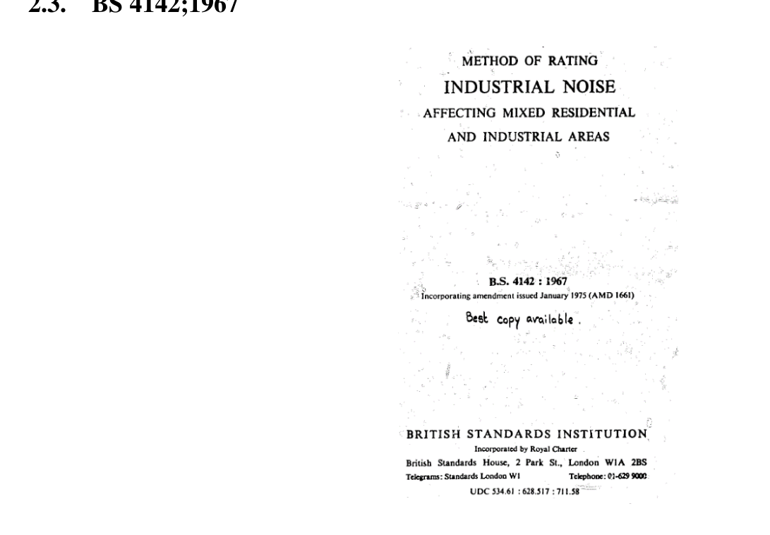 A A A Volume : 44 Part : 2 BS 4142:2019 – Methods for rating and assessing industrial and commercial sound – the past, the present and future developments – a history. Philip Dunbavin 1 PDA Ltd 3 Bridgewater Court Barsbank Lane Lymm Cheshire WA13 0ERABSTRACT BS 4142 is the UK’s principal assessment method for quantifying industrial / commercial noise impact. It is surprising to realise that this standard is nearly sixty years old. The first draft of the document that was to become BS 4142 was being prepared in 1962 and was first published early in 1963 as the final report of the Wilson Committee on the problem of noise.As a young acoustician, I like many others, regarded British, and all standards in general, as tablets of stone that were immutable. As I gained in experience it became obvious that this was not true. In fact all standards are periodically reviewed, every five years in the case of a British Standard, to determine if they still reflect the current available evidence that underpins them.The current version of BS 4142 would be virtually unrecognisable to those esteemed authors of the Wilson Report all those sixty years ago. This paper traces the history of BS 4142 from its birth in the Wilson Report, through its revisions, many of which were extremely controver- sial at the time, to its current iteration.Change is coming with a review and potential revision in 2024 and this paper examines the current developments, both in research and standardisation, that may have significant impacts on this review process and the future development of BS 4142. 1. INTRODUCTIONThe Wilson Committee on the problem of noise was appointed in April, 1960, "to examine the nature, sources and effects of the problem of noise and to advise what further measures could be taken to mitigate it." They worked on it for two years and towards the end of 1962 submitted their report to the government which was published in July 1963.The committee faced the task of examining the problem of noise with, for the most part, no special knowledge of the subject. This lack was in a sense an advantage, for it enabled them to see the problem from the point of view of the layman, and noise affects us all, laymen and specialists alike. They hoped that their conclusions and recommendations would represent fairly the reaction of the ordinary citizen to noise, and the degree of trouble and expense that would be required to mitigate it.1 philipdunbavin@pdaltd.comworm 2022 2. THE WILSON REPORTFigure 1: The Wilson Reportworm 20222.1. The Wilson Report IntroductionThe introduction to the report starts with the following observation.“People's reactions to noise vary greatly and in the past this has prevented the framing. of rules for its control except in qualitative terms, with consequent difficulties of administra- tion. We therefore felt that an important feature of our task was to try to define. wherever possible. quantitative levels of noise which should become statutory limits or where statu- tory limits were not desirable or could not be laid down at present, to suggest levels which would serve as guides to what is reasonable.” It is Appendix XV, on “Simplified procedure for assessing reaction to industrial noise in mixed residential and industrial areas” , of that report that was to subsequently become BS 4142.2.2. Appendix XVThis ‘simplified procedure’ was intended as a quantitative guide to whether an existing industrial noise is likely to cause complaint from those people, having a normal reaction to noise, who live nearby, and also to give an indication of the probable limiting level of noise from a proposed fac- tory without likelihood of complaint.In this procedure for assessment, a basic noise level is first identified and then allowances are added to or subtracted from it in accordance with a set of rules. Comparison of the measured value with the level calculated from the rules is used as an indication of whether complaints may be ex- pected about noise from the industrial premises .Noise FINAL REPORT The basic figure was set at 50 dBA for new factories, 55 dBA for factories which have been es- tablished for a few years, and 60 dBA for old established factories. Then allowances were added/sub- tracted for tonality, intermittency, the type of district, and variations in the noise level throughout the day. The noise level is measured out of doors, approximately 12 ft from the side of the nearest habitable building which faces the noise source at a height of 4 ft above the ground. If the measured noise level in dBA exceeds the limiting level given by the rules as the sum of a basic level and appropriate allowances, then complaints from an ordinary reasonable person may be expected.The report also stated that there had recently been a great increase in the study of noise problems in their social setting, and they did not doubt that in the coming years important advances would be made. They hoped that their own work would contribute something to this movement and help to put the problem of noise into perspective with other problems of mod- ern life. Not surprisingly that is exactly what happened in the following years.2.3. BS 4142;1967worm 2022Figure 2: The 1967 edition of BS 4142It took just four years for the British Standard Institute to convert Annex XV of the Wilson Report into the first version of BS 4142:1967 – Method of rating industrial noise affecting mixed residential and industrial areas. In this version the idea of a basic noise level plus allowances, now referred as a notional background level, sits alongside a suggestion that perhaps you should measure the actual existing background.For readers who are too young to remember this period of time you need to consider that Leq measurements did not exist and the observer had to ‘eyeball average’ the meter needle. The use of directly measured statistical parameters such as L 90 were not even featured in acousticians wildest dreams. I
