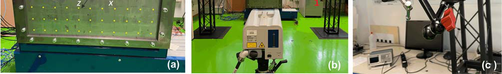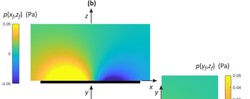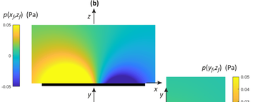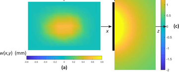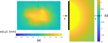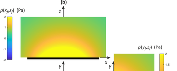 A A A Volume : 44 Part : 2 Sound radiation estimate from vibration measurements with multiple cameras Paolo Gardonio 1 , Gianluca Guernieri, Roberto Rinaldo, Andrea Fusiello, Emanuele Turco Università degli Studi di Udine DPIA – Via delle Scienze 208 33100 – Udine (I) ABSTRACT This paper presents experimental results on the estimation of the sound radiation by a thin flat plate from flexural vibration measurements taken with multiple cameras. The study considers the sound radiation into free-field by a baffled rectangular plate fixed on a rigid frame. The plate is excited by a tonal point force exerted by a shaker at the first two resonance frequencies of the plate flexural response. The resulting vibration field is measured with a set of six cameras suitably synchronised. More specifically, 3D point tracking is implemented on a regular 11 ൈ7 grid of small circular points marked on the plate. The transverse displacements at these points are thus reconstructed from triangulation with multiple, i.e. 6 , view-points. The transverse displacements are then used to derive the sound radiation from a direct boundary integral formulation. More specifically, for the flat rectangular plate at hand, the sound radiation is derived from the Rayleigh integral, which is approximated into a finite sum over the mesh of rectangular elements centred at the 11 ൈ7 grid of points depicted on the plate. The flexural vibration field and the sound radiation field derived from the camera measurements are contrasted with those derived from vibration measurements taken with a laser vibrometer. The initial results presented in this paper demonstrate the feasibility of the proposed measurement approach at low audio frequencies. 1. INTRODUCTIONMeasuring sound radiation from machinery or sound transmission through wall structures is a rather challenging task, which may require quite expensive facilities and complex sound detection probes. Indeed, sound radiation and sound transmission are normally measured either in situ or in special acoustic rooms. In the former case the radiated sound field is measured at few specific points with microphones, or phonometers [1-3]. Alternatively, given portions of the radiated sound field can be measured with sound intensity probes, which, normally, rely on microphone and hot-wire transducers to measure the sound pressure and acoustic particle velocity at a point [1-5]. Nowadays, these systems are equipped with video-cameras that automatically detect the position of the probe such that the radiation field can be reconstructed automatically [6]. Acoustic cameras have also been developed, which rely on microphone arrays to detect the source of noise coming from a vibrating machinery or wall structure through beamforming methods [7-9]. In situ measurements are often affected by uncertainty of the radiating source operation conditions, by flanking noise sources and by low repeatability of the measurement configuration [1-3]. Accurate quantitative measurements of sound1 paolo.gardonio@uniud.it radiation by machineries or sound transmission by wall structures require quite complex and expensive test facilities, which normally involve rather large reverberant and/or anechoic rooms equipped with microphones located in well-defined positions according to international guidelines [1-6]. For instance, the radiated sound power of machines is normally measured in large reverberant rooms [10,11]. Alternatively, the sound transmission through wall structures is measured with reverberant-reverberant or reverberant-anechoic facilities, where the structure is mounted on an opening of a common wall between the two cameras [12]. The aim of this paper is to investigate experimentally the possibility of using photogrammetry to assess the sound radiation into free-field produced by flexural vibrations of distributed structures. More specifically, the free-field sound radiation is derived from the Rayleigh integral equation [13] with respect to the transverse vibration velocity field of the structure measured using multiple, i.e. more than 2, cameras operating synchronously. As summarized in Refs. [14,15], during the past two decades, vibration measurement with optical cameras has been the subject of quite a vast bulk of studies, which have covered several photogrammetry approaches, principally based on 2D point tracking (2DPT) [16,17] and 3D point tracking (3DPT) [18], on 3D digital image correlation (3D-DIC) [19,20] and on target-less approaches [21]. The early works considered single-camera arrangements, where the camera should be oriented at a grazing angle with the surface of the flexural vibration field. Later, vibration measurements with stereo-camera setups using triangulation techniques [22-24] were also exploited. More recently, stereo acquisitions based on setups with moving single-cameras or with multiple mirrors focusing multi-images on single cameras have also been investigated [25,26]. In general sound radiation in air covers quite a wide range of frequencies comprised between 20 Hz and 20 kHz and even for typical measurements of interest in engineering applications it reaches 2 to 5 kHz. Therefore, rather high frame-rate cameras should be employed to secure accurate measurements. Moreover, to guarantee a correct estimate of the sound radiation, the spatial measurement of the vibration field should be quite accurate [13] and thus the cameras should have a high spatial-resolution too. In this respect, it should be noted that the past few years have seen the rise of new processing and acquisition technologies [27,28], which can be used to increase spatial and temporal resolutions. In this paper, a simple sound radiation case-study is examined, which is composed by a thin flat rectangular plate fixed on a rigid baffle and excited in bending by a transverse point force. The flexural deflection shape [29] produced by a tonal excitation at the natural frequencies of the first two flexural m