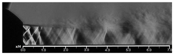 A A A Volume : 44 Part : 2 Instructions for preparing the manuscript of the papers for Proceedings of INTER-NOISE 2022 GLASGOW Philip Morris 1 and Darryl Douglas 2 The Pennsylvania State University Department of Aerospace Engineering 229 Hammond Building University Park, PA 16802, USAABSTRACT Aircraft designs may include an engine that exhausts over the upper fuselage of the aircraft. This design has many benefits including reduced noise below the aircraft. However, the scrubbing of the high-speed turbulent jet flow over the fuselage has the potential to cause structural fatigue. This paper describes an experimental/computational study of the surface pressure fluctuations induced by the supersonic jet flow. The model configuration consists of a rectangular convergent-divergent nozzle that exhausts over a flat plate. The plate is a continuation of the lower lip of the nozzle. Pressure measurements are made at several locations on the plate surface. In addition, schlieren visualization is used to identify the jet’s shock cell structure. Numerical simulations are performed using hybrid RANS/Large Eddy Simulation (LES). Results are compared between the simulations and the experiments. The importance of shock turbulent boundary layer interaction to the surface loading is identified.1. INTRODUCTIONMany recent designs for manned and unmanned aircraft feature an engine exhaust integrated into the upper surface of the fuselage. An example is the Northrop Grumman X-47B which is an unmanned combat aerial vehicle (UCAV). It is designed for carrier-based operations. The embedded exhaust results in low observability. However, the hot supersonic jet exhaust interacts with the fuselage aft-deck and may cause structural damage or fatigue. Due to the sharp throat on a typical combat aircraft vehicle, the jet exhaust will contain shocks, even when operating in a nominally on-design condition. It is hypothesized that the shock turbulent boundary layer interaction will generate unsteady surface pressure loading at frequencies with the potential to cause structural damage.Previous studies of the effect of an aft deck (and side walls) on the flow and acoustics of a supersonic rectangular jet include that by Tinney et al. [1]. They investigated the properties of an approximately 4:1 aspect ratio multistream nozzle with a design pressure ratio of 5.0. Core nozzle pressure ratios between 3.0 and 5.0 were considered. Aft deck surface pressures, schlieren visualization and far field pressures were acquired. Reynolds-Averaged Navier Stokes (RANS) simulations were performed and the agreement with the measured mean pressure on the deck and side walls was good. In a series of papers (Berry et al.[2], Magstadt et al.[3], Ruscher et al.[4])1 pjm@psu.edu 2 dad5668@psu.edua Shea mar ce 21-24 AUGUST SCOTTISH BENT caso made near and far field acoustics measurements of an effectively two-stream rectangular nozzle flow exhausting over an aft deck. Far-field microphone and aft deck pressure measurements were made. Particle Image Velocimetry and high speed schlieren were also used. They observed a 34 kHz oscillation throughout the experimental domain which they attributed to Kelvin-Helmholtz instabilities inside the nozzle. The effects of heating one or both streams were also reported.The present paper reports on flow and surface pressure measurements for a 4:1 aspect ratio rectangular jet exhausting over an aft deck. The focus is on surface pressure fluctuations in the hundreds of Hertz, as relevant for structural response. In the interest of length only selected results from an ongoing research project are presented. Limited results from a hybrid RANS/LES are also presented.The next section describes the experimental facility, the instrumentation, and the numerical simulation approach. This is followed by averaged schlieren visualizations. Average and unsteady surface pressures are then presented. Following a brief description of the numerical approach, some preliminary unsteady flow simulations are given. Finally, conclusions based on the completed results are provided. 2. EXPERIMATAL FACILITIES, INSTRUMENTATION, AND NUMERICAL SIMULATIONS 2.1. Penn State Jet Aeroacoustics Facility The experiments were conducted in the Penn State Jet Aeroacoustics Facility. A schematic is shown in Figure 1. The facility is capable of simulating 1-inch equivalent diameter unheated or heat-simulated jets to a jet exit Mach number of 1.7. Heated jets are simulated using helium-air mixtures to match the heated jet acoustic Mach number. The jet temperature and pressure are controlled by means of a control panel and data are acquired and recorded using a LabVIEW workstation. Further details about the history of the facility, its design and operation can be found in Doty [5], Doty and McLaughlin [6], and Veltin [7].Figure 1. Schematic of the Penn State Jet Aeroacoustics Facility.2.2. Nozzle and aft deck modelThe rectangular jet nozzle has a 4:1 aspect ratio with a height of 0.443 in. and a width of 1.76 in. Downstream of the throat, the top and bottom walls are parallel, and the sidewalls diverge. The design Mach number equals 1.26, based on quasi one-dimensional isentropic flow relations. A previous model design had a separate aft deck section (see Lurie [8]) that was aligned with the lower lip of the nozzle. However, it was found that this generated either a forward or backward facing step at the lower jet exit which, in turn, generated spurious shocks and expansions. The new nozzle and aft deck design is shown in Figure 2. The deck is integrated into the lower wall of the nozzle, which eliminates any step at the jet exit. Also shown in Figure 2 are the locations of holes for the pressure transducers along axial lines at the jet center and quarter span and in line with the nozzle exit sidewall.Figure 2. Sketch of nozzle design: (a) isometric view, (b) CAD vertical centerline cutaway and, (c) CAD spanwise nozzle centerline cutaway.2.3 Pressure mea