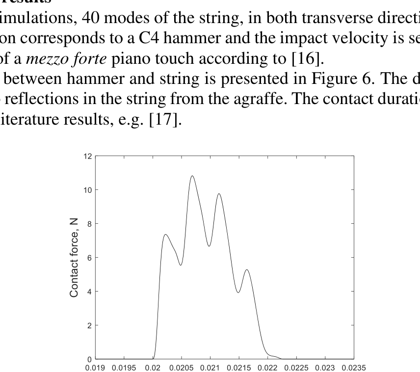 A A A Volume : 44 Part : 2 Piano string vibration modelling using coupled mobilities and a state- space approach Pablo Miranda Valiente 1 , Giacomo Squicciarini 2 , David J. Thompson 3 Institute of Sound and Vibration Research, University of Southampton University Rd, Highfield, Southampton SO17 1BJABSTRACT The two transverse motions of the string in planes parallel and perpendicular to the soundboard are believed to contribute to some of the characteristic effects of piano tones. In this work we aim to model the coupling between a single string and soundboard, considering the two transverse motions. A stiff string model is coupled to the bridge of the soundboard. Modelling approaches are presented in both frequency and time domain, using mobility coupling and state-space equations, respectively. For time domain modelling, the soundboard mobilities are approximated by lumped elements, springs and dampers in this case. In the frequency domain model, the mobilities of the elongated string, detached from the bridge, corresponding to the transverse response to a transverse force, are the same in both directions and the coupling between them is neglected, while the soundboard mobilities are represented by a 2 2 matrix. The state-space model has the benefit of allowing inclusion of the non-linear hammer excitation. Although the frequency domain model can represent the linear characteristics of the coupling and give an insight into the importance of the cross-terms of the coupled mobility, it is the time domain model that is able to represent typical features of the interaction.1. INTRODUCTIONIn piano acoustics the vibration of the strings is initiated by the hammer strike and plays an important role in determining the sound radiated from the soundboard. The two ends of the string are connected to the cast-iron frame of the piano by means of connection pins. These are the agraffe, near the action, and the hitch pin, at the opposite end [1]. At a distance, defined as the speaking length, the string is pressed against the bridge of the soundboard. This connection is the main path of vibration transmission from the string to the soundboard and can also be responsible for coupling the two transverse directions of string vibration [2] . Once the hammer hits the string at the striking point, the two remain in contact for a few milliseconds. The hammer force creates pulses that travels along the string and are reflected at the ends. After the hammer loses contact with the string, this is left free to vibrate and decay. Alongside other phenomena, decay rates in piano tones contribute to forming its1 pmmv1g14@soton.ac.uk2 G.Squicciarini@soton.ac.uk3 djt@isvr.soton.ac.uk distinguishing sound and have been extensively studied in the past decades. The decay of piano tones and how this is related to the connection with the soundboard has been one of the areas of research in piano acoustics.Martin [3] recorded decay rates for different pianos, discussing the effect of the soundboard and showing that each piano tone has different decay rates along the piano range. The phenomena was later explained by Weinrich [2], who showed that double decay is caused by the coupling between strings of the same tone at the bridge and by double polarisation. This is the presence of two transverse vibrations on the string, one perpendicular to the soundboard, and the other parallel to it. The author showed experimentally that the vibration in the vertical direction decays faster because of the better impedance match between the string and the soundboard in this direction. According to the double- polarisation explanation, after the initial sound decays the remaining and more sustained section of the envelope is caused by the vibration in the plane parallel to the soundboard.Cheng et al. [4] have focused on modelling the specific characteristics of string’s vibration decay and its fitting to linear and non-linear models, showing that non-linear models may fit better to measured data and that the dynamics of the piano touch does not influence the decay rates. The effects of non-linearities in double polarisation, causing the pairs of modes in both directions to have different natural frequencies, have been addressed by Tan et al. [5], proving that whirling motion of the string occurs when accounting for these differences. More recently, Woodhouse [6] provided a criterion for double decay in different string instruments, showing that for double decay to exist, the loss factor given by the coupling to the bridge/soundboard needs to be higher than the loss factor of the medium in which the string vibrates.This study presents frequency and time domain models for string vibration including coupling to the soundboard. Two transverse motions of a single string are considered which are normal and parallel to the soundboard. These are coupled to each other at the bridge either by means of a mobility matrix, in the frequency domain, or by an equivalent lumped parameter model for time domain simulations. The string dynamics are represented with a stiff-string model [7] while the dynamical properties of the soundboard at the connection point are obtained by means of Finite Elements (FE).2. STRING AND SOUNDBOARDThe string-soundboard system is shown in Figure 1 together with the conventions adopted for velocities, 𝑣 , and forces, 𝐹 . For the different variables defined in Figure 1, the subscript 𝑒 indicates the excitation point where the hammer interacts with the string, the subscript 𝑠 denotes the string at the connection point with the bridge while 𝑟 is the connection point on the bridge side. The superscripts 𝑇 and 𝑃 indicates the two vibration directions transverse to the string: normal to the soundboard ( 𝑇) and parallel to it ( 𝑃 ).Figure 1: String and soundboard system.ee 2.1 String In pianos, it is common to have more than one string for the same note, particularly in the mid-high frequency range. In this 
