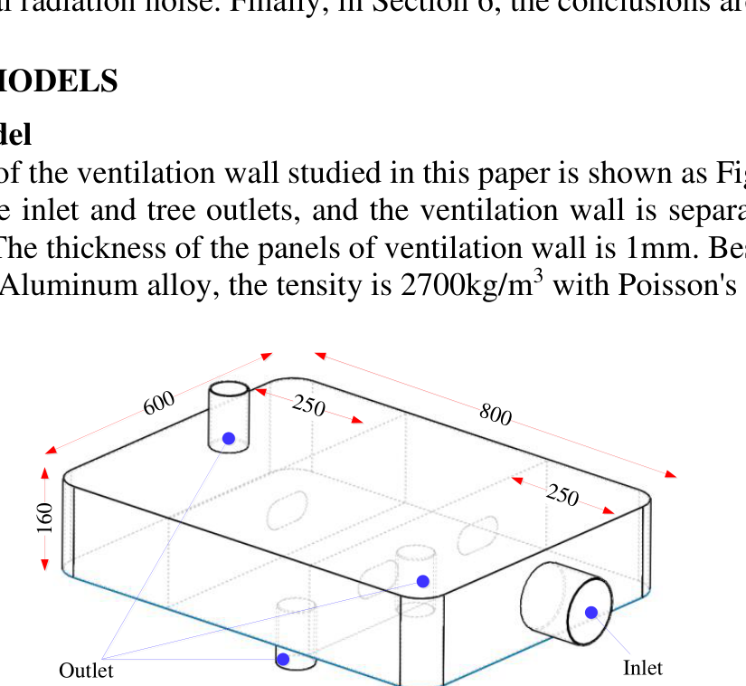 A A A Volume : 44 Part : 2 Numerical analysis of the flow-induced noise of ventilation wall based on LES and FW-H hybrid methodQingqing Yu 1 a. School of Mechanical Engineering, Southeast UniversityNo.79 Suyuan Road, Jiangning District, Nanjing City, Jiangsu Province, 211189, P.R China b. Nanjing Research Institute of Electronics TechnologyNo. 8 Guorui Road, Yuhuatai District, Nanjing City, Jiangsu Province, 210039, P.R China Fei Xue 2 Nanjing Research Institute of Electronics Technology No. 8 Guorui Road, Yuhuatai District, Nanjing City, Jiangsu Province, 210039, P.R ChinaABSTRACT As a widely used device in the field of air cooling and heat dissipation of electronic equipment, ventilation walls often have the flow-induced noise problem. This paper presents a numerical study on the flow-induced noise of a ventilation wall based on LES and FW-H hybrid method. Firstly, the pressure fluctuation data on the surfaces of ventilation wall was calculated from a large eddy simulation (LES). Then, taking the fluid pressure fluctuation at the surfaces of the ventilation wall as excitation source, the modal-based vibro-acoustic responses of ventilation wall was obtained by using LMS Virtual.lab. Finally, the structure of ventilation wall was optimized to reduce the flow- induced structural radiation noise. The results show that the flow-induced noise is mainly low- frequency noise. Besides, the peak frequencies of the flow-induced noise ranges from 80Hz to 255Hz, and the peak frequencies are consistent with certain structure mode frequencies. Moreover, the total sound pressure level of the flow-induced noise deceases from 92.5dB to 72.9dB by improving the structure stiffness of ventilation wall. In conclusion, this paper could provide a method for reducing the flow-induced noise of ventilation walls. Keywords: ventilation wall; LES and FW-H hybrid; pressure fluctuation; flow-induced noise; vibro-acoustic response1. INTRODUCTIONVentilation wall is a widely used device in the field of air cooling and heat dissipation of electronic equipment. Generally, cool air can be used to dissipate heat for multiple devices through ventilation walls. However, when the airflow passes through the ventilation wall, the thick panels of ventilation is often stimulated to generate structural radiation noise, thus, sometimes, the ventilation wall could be a major noise source.In the past decades, a large number of studies had been carried out to explore on the principle and prediction of flow-induced noise or aero acoustics. In 1952, Lighthill’s work on acoustic-comparison method opened up the research in the field of aeroacoustics [1]. Later, through the development of Curle, Flowcs Williams and Hawkings, a complete set of aeroacoustics theory has been basically1 yuqingqing@aliyun.com 2 xuefei8848@163.com established [2~3]. Recently, based on the above classical aero acoustics principles, more and more scholars pay attention to the problem of flow induced noise in pipelines and cavities, and have carried out extensive experimental research and simulation analysis. In terms of experimental research, Udoetok E.S. et al. carried out a study on the effect of fluid flow inside the pipeline on the natural frequency of the pipeline, and then compared the theoretical results with the experimental results [4]. Bing. K., et al. conducted an experimental analysis on the influencing factors of flow-induced vibration of pipeline elbows [5]. Zhang et al. conducted an experimental study on the noise at the outlet of the elbow, and found that the numerical simulation results are slightly higher than the experimental values [6]. With the rapid development of computing technology, numerical simulation has become a reliable and efficient method to study the flow-induced noise of cavities, chambers, mufflers and pipelines [7~8]. Mao studied a two-part operation of one high head reversible turbine: transient load rejection process and intermittent vane closing conditions, and found that the flow induced noise radiation is consistent with internal fluid characteristics [9]. Ren, et al. carried out a study on the flow-induced noise of deflector jet servo valve based on LES/Lighthill hybrid method, and the result shows that continuous broadband dipole noise with medium- and high-frequency components [10]. Liu, et al. proposed a hybrid method that combined the detached eddy simulation (DES) with Lighthill’s acoustic analogy to simulate flow-induced noise in pipes and found that the noise source is near the opening of the cavity [11]. Han, et al, studied the flow-induced noise generated by natural gas manifolds based on LES and FW-H hybrid method, and a noise experiment was carried out to validate the present numerical model [12]. M. Cianferra carried out an Assessment of methodologies for the solution of the FW-H equation using LES of incompressible single-phase flow around a finite-size square cylinder [13]. Wei et al. used the Flowcs Williams and Hawkings model based on Lighthill’s acoustic analogy to compute the flow-induced noise in high-pressure- reducing valves [14]. Compared with the direct numerical simulation (DNS) and Reynolds-averaged Navier-Stokes (RANS) model, the LES is considered to be the most promising numerical method to study the flow characteristics [15]. Therefore, in this paper, the LES and FW-H hybrid method combining with the vibro-acoustic coupling method is employed to study the flow-induced noise of ventilation wall.This paper presents a numerical study on the flow-induced noise of a ventilation wall based on LES and FW-H hybrid method. This paper is organized as follows. In Section 2, the geometric model, CFD model and the acoustical model are established. In section 3, the flow-induced noise of the ventilation wall is analyzed. In Section 5, the structure of ventilation wall is optimized to reduce the flow-induced structural radiation noise. Finally, in Section 6, the conclusions are summarized. 2. NUMERICAL M