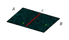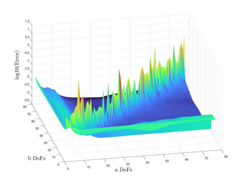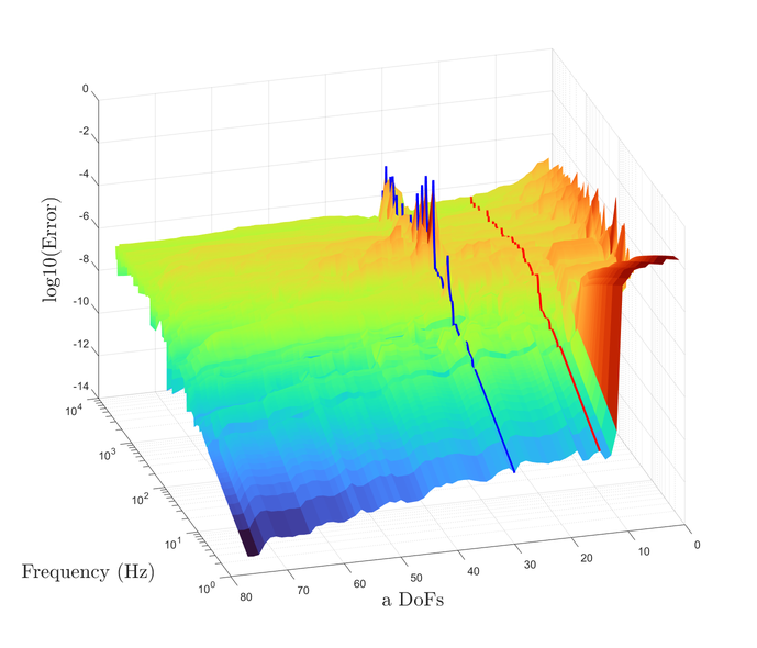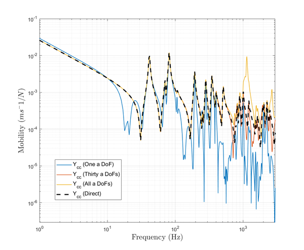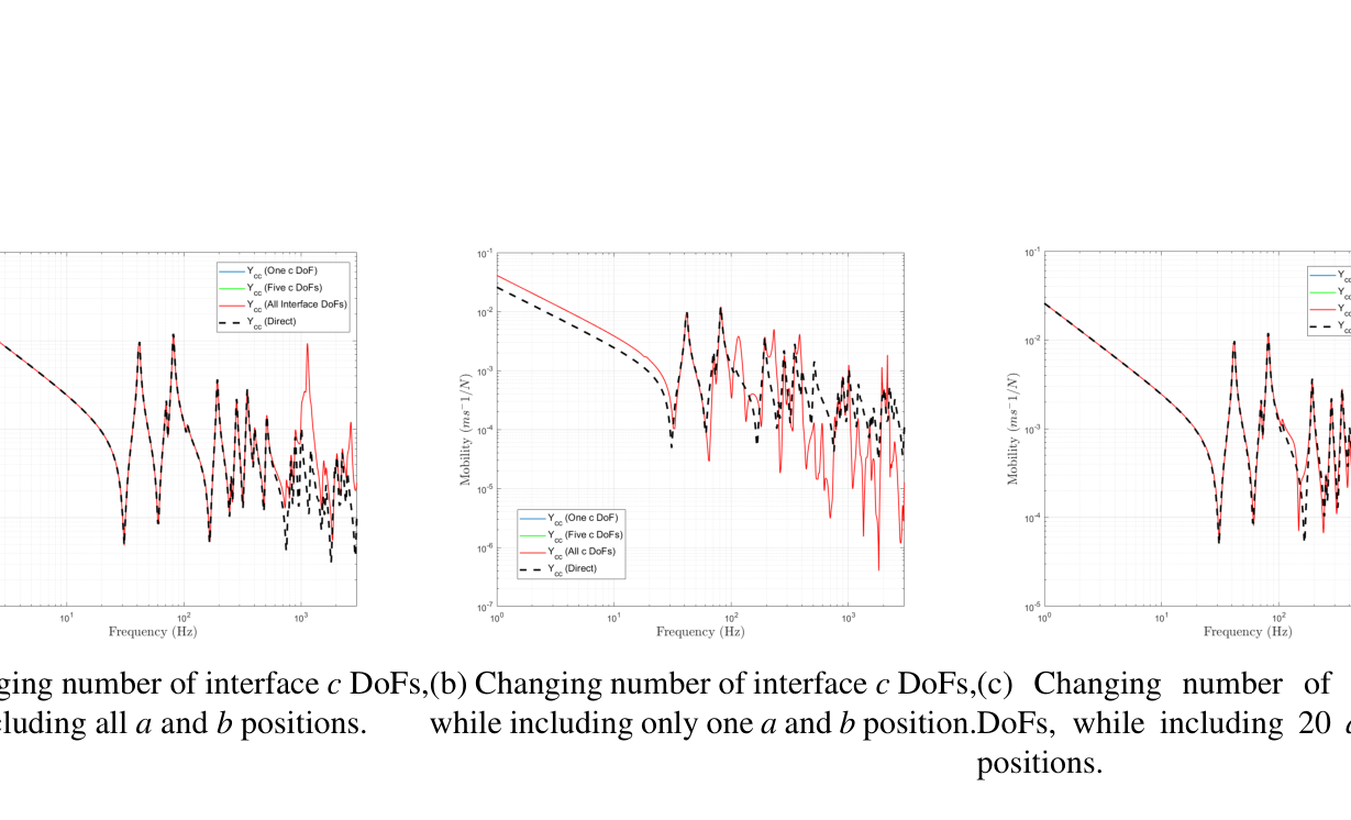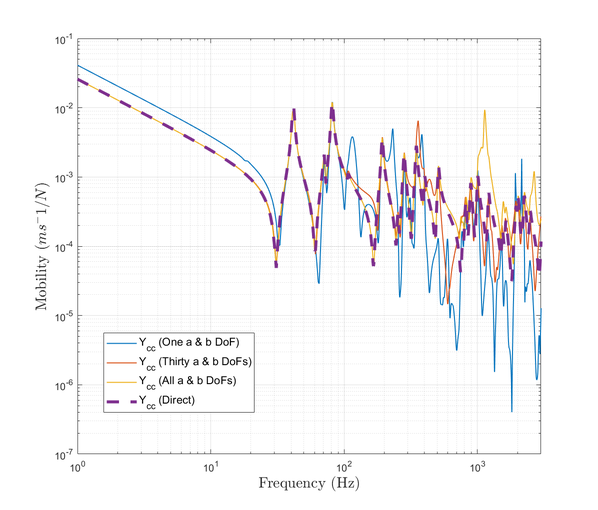 A A A Volume : 44 Part : 2 Accurate reconstruction of an interface point mobility matrix using the round-trip methodRamin McGee 1 , Andrew Elliott 2 , Joshua Meggitt 3University of Salford The Crescent, Salford, M5 4WTJohn Smith 4University of Exeter Stocker Road, Exeter, EX4 4PYABSTRACT The round-trip method enables the indirect determination of point mobilities along interfaces that cannot be easily excited. One embodiment of the method requires excitation at a subset of points either side of the interface, while responses are measured along it. This is typically done by instrumented hammer or shaker. In the present paper, we investigate the sensitivity of the round-trip method with respect to the number of remote measurement positions used, and the geometry of the structure. Numerical and experimental examples are provided which demonstrate that there exists an optimum number of excitation and response positions for the accurate reproduction of point FRFs.1. INTRODUCTIONThe primary focus of this paper is to investigate the most optimum round-trip prediction of a point mobility matrix along a discretised interface. This is explored for a plate by altering two factors: the number of measurement degrees-of-freedom (DoFs), and the geometry of the plate. It was stated by [1] that the number of measurement points along an interface a ff ects the accuracy of the interface point mobility prediction. This study will show how this doesn’t appear to be the case, and reveal the sensitivities of the round-trip prediction. In Section 2 the background behind the round-trip method is presented. Section 3 displays the results of the round-trip prediction through the tests mentioned for finite-element (FE) and experimental models. Section 4 will discuss what the results from both models show about the round-trip prediction. Lastly, Section 5 concludes the findings of the investigation.1 r.c.mcgee@edu.salford.ac.uk2 a.s.Elliott@salford.ac.uk3 j.w.r.meggitt1@salford.ac.uk4 J.Smith4@exeter.ac.uk1a slaty. inter.noise 21-24 AUGUST SCOTTISH EVENT CAMPUS O ¥, ? GLASGOW 2. BACKGROUND2.1. Round-trip method The round-trip method proposed by [2] constructs an M × M FRF matrix at an interface without needing an applied force at each measurement point. This technique replicates point FRFs at the interface by utilising remote measurement locations which are easier to access. In the past there have been successful attempts at reconstructing this matrix by measuring the responses at all M positions and applying one excitation at only of those points. [1] outlines how those previous methods are subject to error and presents a new method based o ff the "cavity equation" by [3]. Namely the method is a generalised version of the equation where the time reversed response at a ’receiver’ sub-structure due to an excitation at a ’source’ sub-structure, is expressed via convolution of impulse responses at both points across a virtual interface.(a) Diagram of an arbitrary structure divided into two substructures, A and B , by an interface c .(b) Diagram specifying the order and path of the measured FRFs in the round-trip method.Figure 1: Round-trip theory in illustrative form for an arbitrary structure made up of two sub-domains due to a discretised interface.Considering an arbitrary structure such as Fig.1a, we have two sub-domains A and B with multiple measurement positions in a given area of each, named as a and b . The interface c is also a multi- point measurement location, dividing the structure into two sub-domains. Firstly lets define an FRF between the sets of points a and b , given as Y ab . This is referred to as the reconstructed transfer mobility, relating a response at a and excitation at b . The reconstructed transfer mobility equation as presented by [1] is a rearrangement of the indirect measurement of mobility at the interface as proposed by [2]. This is referred to as the reconstructed point mobility, and is denoted Y cc as shown in Eq.1. It represents an FRF matrix of all positions at the interface c , due to three measured FRF matrices which are denoted in Eq.1 and represented in Fig.1b. It is clear from this figure why the method is termed ’round-trip’. The point mobility in Eq.1 applies to linear systems (as well as time invariant ones). Eq.2 represents the same equation that satisfies Maxwell-Betti reciprocal theorem.Y cc = Y cb Y − 1 ab Y ac (1)(Equally by reciprocity)Y cc = Y T cc = Y ca Y − 1 ba Y T cb (2)2 3. RESULTSIn this section we present results from finite-element and experimental examples using the round-trip method. In the first subsection the accuracy of the interface point mobility prediction is analysed against the direct measurement by a number of tests for an FE model. These test comprise of: changing the number of remote and interface DoFs, and the aspect ratio of the plate model. In the final subsection, an experimental example is presented. An error plot along with a direct vs. round-trip calculation is presented for comparison to be discussed in Section 4.3.1. FE Model A finite-element model representing a steel plate is constructed in which the structural responses are calculated via modal summation. Firstly, a regular grid of discretised points are formed on the surface. Similarly to Fig.1a, Fig.2a shows how the FE model’s grid is divided into two remote sub-domains A and B , due to an interface c .(c) 20 a and 40 b points on the regular grid for remote positions.(a) All discretised points of a regular grid.(b) Randomly selected single remote points from regular grid.Figure 2: FE diagram of steel plate, divided into substructures A and B , divided by an interface c .3.1.1 Accuracy due to the number of DoFs includedFig.3a, Fig.3b, and Fig.3c correspond to the sub-figures in Fig.2 respectively. All results within Fig.3 show the reconstructed point mobility is not sensitive to the number of interface positions used. Only one result is visible because all predicti