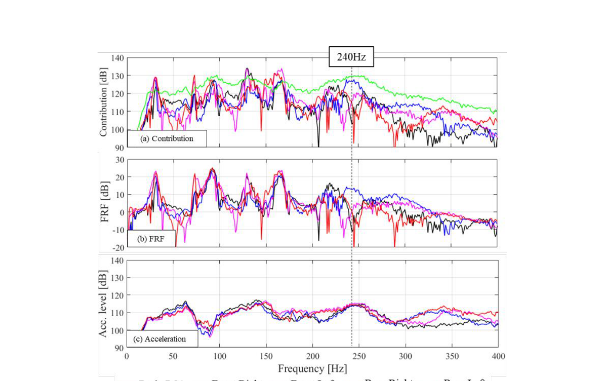 A A A Volume : 44 Part : 2 Appropriate usage of multi-layered OTPA to identify intensive meas- uring part among sequential parts Ryusei Yanagita 1 Junji Yoshida 1 Osaka Institute of Technology 5-16-1 Omiya, Asahi-ku, Osaka-city, Osaka, 535-8585, JapanABSTRACT Conducting effective countermeasure to the vehicle interior noise is important for compatible with the other vehicle performances such as light weight. Operational transfer path analysis (OTPA) was proposed to identify high contributing parts (OTPA reference model) and vibration behaviors (OTPA principal component model) to the interior noise with small man-hours. By using this method, we can determine which parts should be measured intensively. In case we apply the method to a vehicle body panel, the method tells us suitable measuring part of the body panel at the target frequency band. However, if the body panel is excited by a forced vibration from the suspension, we had better to apply countermeasure to the suspension. Then in this study, we applied the OTPA several times to identify which sequential parts from frame, body to interior noise makes the large noise using a sim- ple plate model. In the analysis, both OTPA models (reference model and principal component model) were applied at various part and considered appropriate procedure of OTPA to obtain useful infor- mation for finding out the modification target part accurately. Through the verification test, the ef- fectiveness of the proposed procedure was confirmed. 1. INTRODUCTIONConducting effective countermeasure to vehicle interior noise is important for compatible with the other vehicle performance such as light weight. Then, operational transfer path analysis (OTPA) has been proposed to identify high contributing parts to the interior noise. In the original OTPA (OTPA reference model) was developed to identify high contributing points such as engine mount attachment points 1, 4-8 . In addition, OTPA principal component (PC) model was recently proposed to obtain high contributing vibration behaviors such as body panels to know important vibration mode of the target structure 2 . Through these methods, we can understand which parts and vibration behaviors should be measured intensively. Furthermore, for estimating the high contributing part in complex system such as frame, body and cabin in vehicle, repeating OTPA procedure sequentially was demonstrated 8 . However, an appropriate combination of these OTPA methods to obtain useful information has not proposed yet. Then in this study, we applied both OTPA reference and principal component models to simple plate model and considered an effective analysis procedure to determine important parts and vibration behaviors accurately for effective countermeasure.1 junji.yoshida@oit.ac.jpworm 2022 2. OPERATIONAL TRANSFER PATH ANALYSIS (OTPA) REFERENCE AND PRINCI- PAL MODELIn OTPA, transfer function of each reference point to the response point is calculated by applying principal component regression method using only simultaneously measured reference and response signals at the operational condition as shown in Figure 1. Contribution of each reference point to the response point is obtained by multiplying each reference signal with the transfer function.Figure 1: Calculation procedure of Operational TPA.Firstly, reference and response signals are measured at the operational condition and frequency analysis is carried out to the measured signals by applying FFT repeatedly. Secondly, PC analysis is applied to the reference signal matrix [ A in ] by singular value decomposition (SVD) as shown in Equation 1. And correlated components among reference signals are extracted to obtain principal component (PC) matrix [ T ] by using matrix [ V ] as shown in Equation 2.[𝐴 in ] = [𝑈][𝑆][𝑉] 𝑇 (1)[𝑇] = [𝐴 in ][𝑉] = [𝑈][𝑆] (2) Here, [ V ] is the coefficient matrix to transpose the reference matrix [ A in ] to the PC matrix [ T ]. And regression coefficient (PC transfer function) [ B ] of each PC to the response signal to transpose the PC matrix [ T ] to the response signal matrix [ A out ] is obtained by multiple regression analysis as shown in Equations 3 and 4.[𝐴 out ] = [𝑇][𝐵] (3)[𝐵] = ([𝑇] 𝑇 [𝑇] −1 )[𝑇] 𝑇 [𝐴 out ] (4)Transfer function [ H A ] from reference signal to response signal is calculated by multiplying the coefficient matrix [ V ] with the regression coefficient [ B ] as shown in Equation 5.[𝐻 A ] = [𝑉]([𝑇] 𝑇 [𝑇] −1 )[𝑇] 𝑇 [𝐴 out ] (5)As the result, we can obtain contributions of reference and principal component to response signal by using [ H A ] and [ B ] as shown in Equations 6 and 7.[𝐴 contribution ] = [𝐴 in ][𝐻 A ] (6)[𝑇 contribution ] = [𝑇][𝐵] (7) In the principal component model, reference signals are also re-generated by multiplying PC matrix [ T ] with the inverse (transpose) matrix of unitary matrix [ V ] as shown in Equation 8.[𝐴 in ] = [𝑇][𝑉] −1 (8)The response signals obtained in Equation 8 have phase and amplitude. Hence, the vibraion behavior composing each principal component (principal component mode) can be expressed by using these information 2 . Therefore, the PC mode related to high contributing PC to the response point becomes the high contributing PC mode and the mode is the target mode for effective countermeausre to the response.3. CONSIDERATION OF EFFECTIVE SEQUENTIAL OTPA APPLICATIONHere, we consider effective procedure to find out the high contributing part among sequential system in the road noise transmission from frame, body to cabin as follows.3.1. Stepwise Application of Reference and Principal Component Model Road noise is transmitted from tire, suspension, frame, body, and cabin in general. In this study, we focused on the frame, body and cabin characteristics as the evaluation target of OTPA application for the road noise. Here, OTPA is applied several times between body to cabin 