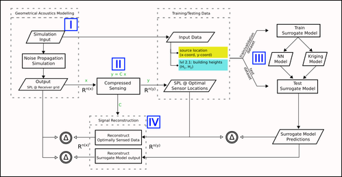 A A A Volume : 44 Part : 2 A machine learning- and compressed sensing-based approach for surrogate modelling in environmental acoustics: towards fast evaluation of building façade road tra ffi c noise levelsSacha Baclet 1The Centre for ECO 2 Vehicle Design, The Marcus Wallenberg Laboratory for Sound and Vibration Research (MWL), KTH Royal Institute of Technology, SE-100 44, Stockholm, SwedenHamza Bouchouireb The Centre for ECO 2 Vehicle Design, Department of Engineering Mechanics, KTH Royal Institute of TechnologySiddharth Venkataraman The Centre for ECO 2 Vehicle Design, The Marcus Wallenberg Laboratory for Sound and Vibration Research (MWL), KTH Royal Institute of TechnologyErik R. Gomez The Marcus Wallenberg Laboratory for Sound and Vibration Research (MWL), KTH Royal Institute of TechnologyABSTRACT State-of-the-art urban road tra ffi c noise propagation simulation methods such as the CNOSSOS-EU framework rely on ray tracing to estimate noise levels at specific locations on façades, so-called receiver points; this method is relatively computationally expensive and its cost increases with the number of receiver points, which limits the spatial resolution of such simulations in the context of real-time or near-real-time urban noise simulation applications. This contribution aims to investigate the applicability of multiple data-driven methods to the surrogate modelling of tra ffi c noise propagation for fast façade noise calculation as an alternative to these traditional, ray-tracing-based methods. The proposed approach uses compressed sensing to select a small subset of optimal receiver points from which the dataset of the entire façade may be reconstructed, associated with either a kriging model or neural networks, used to predict noise levels for these sensors. The prediction performance of each of these steps is evaluated on an academic test case, with two levels of complexity based on the dimensionality of the problem.1 baclet@kth.sea slaty. inter.noise 21-24 AUGUST SCOTTISH EVENT CAMPUS O ¥, ? GLASGOW 1. INTRODUCTIONRoad tra ffi c noise is an increasingly major concern in urban areas for its impact on health and comfort. To tackle this issue, mitigate its impacts, and measure the e ff ectiveness of mitigation measures, it is necessary to understand how people are currently being exposed to noise. In this context, tra ffi c noise mapping is one of the tools that can be used to assess noise exposure. A conventional method for the generation of tra ffi c noise maps is based on ray tracing. It is for instance used by CNOSSOS-EU [1], the standard framework for producing noise maps in the EU. This method is relatively computationally expensive. This is acceptable when generating maps every 5 years, as required by EU regulation [2]. However, recent works have shown that dynamic noise mapping is better at characterising noise exposure [3], thereby prompting a need for more frequent noise mapping.The calculation times that used to be negligible have therefore become a limiting factor in the generation of dynamic or near-real-time noise maps. Several conventional approaches have been explored to reduce this computation time, such as interpolating noise measurements [4], or storing the computed attenuation between source positions and receiver positions [5,6]. Nonetheless, even using these methods, it would still be too computationally expensive to describe the sound levels on the façades of the buildings of a city in real time with a very high spatial resolution (e.g. 1 meter), as the high number of paths between all possible source positions and receiver positions would be prohibitively costly to calculate and store.Data-driven methods could be a potential solution to speed up these simulations. Indeed, data-driven methods, including machine learning (ML), are increasingly used in multiple fields of acoustics, with good performance compared to conventional processing in many scenarios [7]. In the field of environmental noise, applications of data-driven methods include the use of kriging and principal component analysis (PCA) for the statistical interpolation of noise measurements [8] and for an urban noise mapping meta-model [9]; the use of neural networks for the processing of captured urban sound [10], as an alternative to A-weighted noise mapping [11], for sound classification [12], or long-range sound propagation [13]. To the knowledge of the authors, compressed sensing has not yet been applied to the field of environmental acoustics, and data-driven methods in general have not been applied for the purpose of speeding up façade tra ffi c noise simulations with high spatial resolution.This contribution thus aims to explore the applicability of multiple data-driven methods, including either kriging or neural networks associated with compressed sensing for fast façade noise calculation, as an alternative to the conventionally used ray-tracing-based methods. For this purpose, the next sections will describe and evaluate a preliminary surrogate model for fast façade noise calculation, applied to an academic test case. First, a description of the chosen academic test case is given, and the two explored levels of geometric complexity are explained. The following section details the main methodological steps, which include the generation of training and validation data, the identification of optimal receiver locations using compressed sensing, kriging and neural networks for surrogate modelling, and the reconstruction of noise levels from the surrogate models’ predictions. Finally, the error resulting from each step is presented and discussed.2. DESCRIPTION OF THE TEST CASE AND MODEL COMPLEXITYIn order to test the performance of the surrogate model, a simplified noise propagation problem is defined. This test case is illustrated through the geometrical model shown in Fig. 1. A single source of noise is assumed, and this source is positioned within a simplified urban infrastructure.