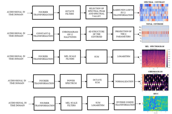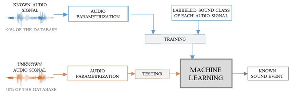 A A A Volume : 44 Part : 2 Influence of several audio parameters in urban sound event classification Simona Domazetovska 1 Faculty of Mechanical engineering in Skopje University Ss Cyril and Methodius in Skopje, North Macedonia Viktor Gavriloski 2 Faculty of Mechanical engineering in Skopje University Ss Cyril and Methodius in Skopje, North Macedonia Maja Anachkova 3 Faculty of Mechanical engineering in Skopje University Ss Cyril and Methodius in Skopje, North MacedoniaABSTRACTAs the urban areas are becoming more dynamic and overcrowded, the problems with the noise pollution are increasing, leading in creating urban sound classification systems. This paper presents a system for classification of sound events established through the development of process for detection and parameterization of sound signals that are used for further classification by applying machine learning algorithms. As the urban sounds are sounds of interest in this study, the UrbanSound8K dataset was used for training and testing the system. Five audio parameters were analyzed and tested on three machine learning algorithms in order to investigate their influence in the accuracy results when recognizing the class of the urban sound event, thus yielding to a collection of 48 different model combinations. The applied audio parameters: MFCC, Mel Spectrogram, Chromagram, Spectral Contrast and Tonal Centroid were chosen as they are widely used for urban noise classification, and their combination forming diverse feature vectors can lead in choosing the right set of parameters. The accuracy results differed for each combination of the audio parameters, thus leading to choosing best set of parameters that reaches the highest recognition accuracy. The classification process was established using three ML algorithms: Support Vector Machines (SVM), Random Forest (RF) and Naïve Bayes (NB).1 simona.domazetovska@mf.edu.mk 2 viktor.gavriloski@mf.edu.mk 3 maja.anachkova@mf.edu.mk 1. INTRODUCTIONThe application of the advanced methods for environmental noise analysis through the development of classification of the sound events significantly improves and simplifies the process of noise assessment. The classification systems are built through the application of digital signal processing techniques that are used for better understanding the sound signal by forming patterns that are easier to recognize in the machine learning (ML) algorithms. Using audio parametrization process to extract the important features from the audio signal is very important as it is used as an input in the ML algorithms for identification of the features, learning from the data and classification of the sound events. The audio parametrization is a key requirement for audio signal classification [1]. According to the study in [2], the researchers have reviewed the existing audio parameters, dividing them into six domains: temporal, frequency, cepstral, modulation frequency, eigen domain and phase space domain. From here, depending on the dataset and the application of the classification system, it is easier to choose which parameters are going to be used in the feature extraction process.Many studies in the literature have studied the classification systems using different audio parameters and machine learning algorithms. By testing the classification accuracy of road vehicle sources in [3], 13 signal features and 4 machine learning techniques have been applied, having a collection of 52 tested combinations. In [4], classification of urban sound event has been established by applying five classifiers and six audio parameters [4]. Simularly, researchers have been analyzing urban sounds by applying combination of feature extraction and deep learning techniques to process a stream of audio and label it in their belonged class [5]. A comparison between machine learning and deep learning classifier was applied in the field of environmental sound recognition in [6]. From here, the experimental results show that machine learning classifiers can be combined to achieve similar results to deep learning models, and even outperform them in terms of accuracy. The urban sound classification algorithms could be further upgrated in order to use them in many real-time applications by making contribution in creating a feasible and deployable real-time sound classification system [7].Based on the previous review, this paper investigates the accuracy when using five audio parameters and three ML algorithms for urban sound event classification, thus yielding to a collection of 48 different model combinations. The focus is on the feature extraction process and the accuracy achieved when using different audio parameters. The accuracy results helped in choosing the best set of parameters that achieves the highest accuracy in the classification process. The use of the hyperparameter optimization on the ML algorithms resulted in high prediction with more than 90% accuracy.The structure of this paper is as it follows: first, the design of the classification system and the used dataset for urban sound classification is analyzed, and afterwards, the steps for extracting the features using the chosen audio parameters were studied. In the following paragraph, the machine learning algorithms were briefly explained. In the end, the results were discussed, proposing conclusions and future work. 2. DESIGN OF THE URBAN SOUND CLASSIFICATION SYSTEMFor the purpose of this study, the classification of the urban sound events is established by two main processes: audio parametrization by extracting the important features from the audio file, and classification by using ML algorithms. The applied architecture of the classification system is shown on Figure 1.First, the important features from the audio files from the dataset were extracted by applying 5 different audio parameters. By combining the different audio parameters, it is expected to find the most suitable set of parameters that achieves the 