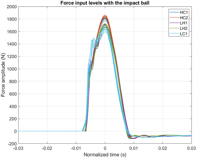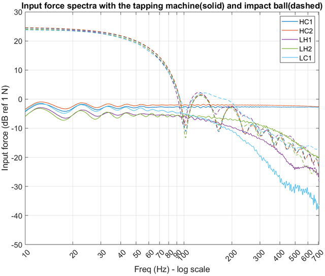 A A A Volume : 44 Part : 2 Measuring the impact force from the ISO impact ball and comparison with the tapping machine and alternate input method Sunit Girdhar 1 Jason Blough Michigan Technological University Houghton, MI Andrew Barnard Pennsylvania State University John LoVerde Wayland Dong Veneklasen Associates, Inc.ABSTRACT The impact ball was recently standardized within the ISO standards as a low-frequency input impact source for impact testing of floor-ceiling assemblies. The input force due to an impact ball is not measured during the tests. A force measurement plate was created with three force transducers to measure the impact force due to ball drops on six different floor assemblies. The input force showed a really good comparison for heavy and lightweight floors in lower frequency but poor force excitation for all the floors above 100 Hz. The input force values were compared with a modified tapping machine’s force input levels showing the tapping machine has poor low-frequency excitation (in comparison) but an improved high-frequency excitation. An alternate input method was developed where a force transducer is added to the impactor to make live measurements of the input force and the impact tip can be changed to modify the range of targeted frequencies for any test.1. INTRODUCTIONWith humans spending more than 90% of their time indoors [1], it is imperative to create a comfortable indoor space, primarily, the places of residence. With the increased development of multistory buildings across urban cities, it is hard to find quiet spaces for people, sometimes even in their own homes. Footstep noise is considered the most annoying noise source in multistory residential buildings [2-4]. A standard tapping machine (first adopted in Germany in 1938 [5, 6]) is used within the ISO standards [7-9] to evaluate the footstep impact noise performance of different floor ceiling assemblies.According to the standard, the tapping machine is placed at four random locations on the floor in the source room such that no location should be closer than 0.5m from the room boundaries. The radiated Sound Pressure Levels (SPL) are measured using fixed microphones or a scanned microphone, with restrictions on the microphone locations as compared to the room boundaries and1 sgirdhar@mtu.edu themselves. The energy averaged SPL are compared to a reference curve to calculate the single number rating of the floor. The measurements are made in One-Third Octave (OTO) frequency bands ranging from 100 – 3150 Hz with an option to go as low as 50 Hz and as high as 5000 Hz in frequency bands, if desired.Research shows that the tapping machine impacts do not correlate well with footstep impacts [4, 10-12] and the results from the tapping machine tests fail to correlate with the subjective response of the residents. Mariner et al. [6] showed that two assemblies with similar single number ratings using a tapping machine had a difference of 11.5 points in their subjective ratings. Olynyk et al. [13] showed that two floors with a subjective rating difference of twenty points had only a two point difference in their impact rating. In another work, two assemblies with an 8-dB spread in their impact rating had the same subjective response [14].This led to the development of an impact ball as a low-frequency impact source to mimic heavy- soft impacts. The ball was reverse engineered based on the peak input force levels and the duration of the impact (that defines the frequency range excited). This ball had a higher low-frequency input levels as compared to the tapping machine but a lesser frequency excitation range [15]. In some early studies, the impact ball shows a much better correlation with the children jumping and running as compared to the tapping machine [15, 16]. This impact ball is now a part of the ISO standards to be vertically dropped in a free fall from a height of 1 m for at least four locations on the floor under test. This test can be done from 50 – 630 Hz OTO bands according to the ISO standard [9].The standard requires an impact ball to generate a specified maximum force exposure level but it is unclear how this is measured. During an input test, this input force is not required to be measured, but the sound radiated from the assembly depends on the input force, floor compliance, and the vibration propagation from the floor to the ceiling (and flanking paths, which are out of scope of this work). Therefore, the input force during a standard test is important understand the performance of floor-ceiling assemblies due to impacts. Olsson et al [17] created a force measurement rig for impact ball tests using a single force transducer and showed that the force spectra is similar regardless of the type of floors below 55 Hz but starts to show deviations above that frequency based on the type of the floor. Our work for this project is inspired by this previous work to further understand and evaluate the input force characteristics of the impact ball and the dependence of this force on the floor compliance.A force plate was created to directly measure the input force due to impact ball drops. These input forces were compared with the force levels from a modified tapping machine based on previous work [18]. This was done to better understand how the floor behaves due to the two different types of standard impact methods. Based on the type of construction of these two impact methods, we expect to see higher force levels with the impact ball in low-frequencies but a wider frequency excitation range with the tapping machine.In addition to the standard impact methods, we will also introduce an alternative input method developed by an in-house student design team. The impactor developed by the team is equipped with a force transducer so live force level measurements can be made. In addition to this, the impactor is highly customizable to get the desired input force levels in a certain floor. More details about t