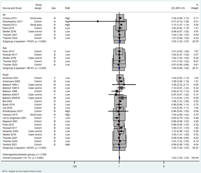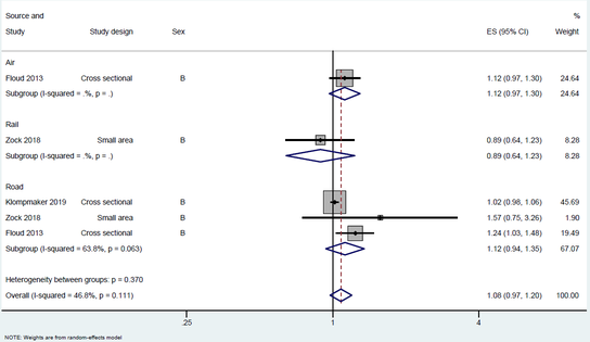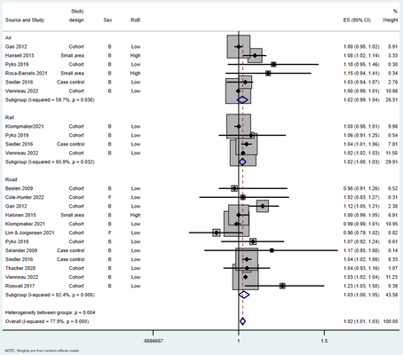 A A A Volume : 44 Part : 2 Systematic review and meta-analyses of association between transportation noise and ischaemic heart disease based on studies published between 1994 – 2022 Sophie Hamilton 1,5 Benjamin Fenech 1,2 1 Noise and Public Health Team, Radiation Chemical and Environmental Hazards, Science Group, UK Health Security Agency 2 Centre for Environmental Health and Sustainability, University of Leicester Anna Hansell 2,5 Xiangpu Gong 2 , 2 Centre for Environmental Health and Sustainability, University of Leicester 5 National Institute of Health Research (NIHR) Health Protection Research Unit (HPRU) in Environmental Exposures and Health at the University of Leicester Danielle Vienneau 3,4 3 Swiss Tropical and Public Health Institute, Allschwil, Switzerland 4 University of Basel, SwitzerlandABSTRACT There is a growing body of evidence that exposure to transportation noise can increase the risk for ischemic heart disease (IHD). However, there are significant variations in the pooled exposure- response relationships (ERRs) derived by recent meta-analyses which lead to uncertainties in health impact assessments and public health policy decision-making. We aimed to update recent meta- analyses investigating the effects of road, railway, and aircraft transportation noise exposure on IHD mortality and morbidity. We included relevant studies from two meta-analyses and one literature review covering the years 1994-2020. We conducted a systematic literature review using the WHO search strategy to identify new studies published until February 2022 and assessed risk of bias for each retained study. The pooled exposure-response associations were calculated using a random effects model. We identified nine new studies for IHD incidence and mortality. Across all traffic sources, statistically significant risk estimates were observed for IHD incidence (1.02 [1.00, 1.03]) and mortality (1.02 [1.00, 1.03]) per 10dB L den respectively.1. INTRODUCTIONTransportation noise from road, railways and aircraft is increasing as a result of urbanization and rising demand for mobility [1, 2]. There is growing epidemiological evidence suggesting that long- term exposure to transportation noise is linked to an increased risk of adverse psychological and1 sophie.hamilton@phe.gov.uk 2 ah618@leicester.ac.uk21-24 auGUST Scortsi event Cas La inter.noise | ee 2022 physiological health outcomes, including sleep fragmentation, stress, and cardiovascular outcomes [3, 4]. Mechanistically it is hypothesized that elevated stress hormones and oxidative stress can result in vascular dysfunction which increases the risk for cardiovascular disease [5-9]. Approximately 20% (113 million) of the European population live in areas where transportation noise from road and railway sources exceeds 55dB L den [1]. Resulting health impacts are significant, with long-term exposure contributing to an estimated 48,000 cases of IHD per year [1]. The latest revision of the World Health Organization Environmental Noise Guidelines for the European Region (WHO ENG2018) [45] were informed by a number of systematic reviews and meta- analyses, including one investigating the association between transport noise exposure and IHD mortality and incidence [9]. Increased relative risks (RR) were reported for road traffic noise (1.08 [95% CI (confidence interval) 1.01, 1.15] per 10dB L den ) and aircraft noise (1.09 [1.04, 1.15] per 10dB L den ) [9]. In 2019 a follow-up meta-analysis was conducted for the purposes of informing Swiss regulatory noise limits [7]. Road, aircraft and railway noise on incident IHD was examined, with lower RRs reported (1.02[1.00, 1.04] per 10dB L den road traffic), (1.03[0.98, 1.09] per 10dB L den aircraft) and (1.01[0.98, 1.09] per 10dB L den rail). Discrepancies in exposure-response estimates can contribute to uncertainties in health impact assessments and in public health policy decision-making. Regularly updated meta-analyses incorporating newly published studies contribute towards the strengthening of the body of evidence. Our aim was to conduct a meta-analysis including more recent studies on the relationship between exposure to transportation noise (road, railway, aircraft) and incidence, mortality, and prevalence of IHD. The additional aims were to investigate if newer studies had any material effect on these exposure response relationships. The analysis includes studies identified in published literature reviews [7, 9, 10] and a supplemented new search for the period October 2020 to February 2022.2. METHODSFor the systematic review and meta-analysis, we followed the WHO ENG2018 protocol [9], using a similar search strategy and similar criteria for evaluating risk of bias for each study.2.1 Part I – Identification of new studies for period 2020-2022For the updated search, we conducted a literature search to identify studies using road, rail, or aircraft noise as exposure, and IHD as the outcomes. We included non-fatal and fatal incident and prevalent cases and excluded studies assessing occupational noise exposure. Using search strings adopted by Vienneau which were adapted from the WHO meta-analysis [7, 9] our search was conducted in PubMed, Medline, EMBASE, Web of Science and Scopus for studies published in English between October 1 st 2020 to February 1 st 2022. Our search was also supplemented with one study published in March 2022. Study selection criteria followed the PECO approach (Population, exposure, comparator, outcome), and included:- Residential exposure to traffic noise from road, rail, and aircraft and incidence, mortality, or prevalence of IHD in adult populations - Measured or modelled noise exposure from individual studies - All study designs accepted – including cohort, case-control, small-area, cross-sectional studies - Risk estimates adjusted for at least age, sex, and a socioeconomic variable - Mortality and incidence and prevalence for Ischemic Heart Disease defined using ICD-10 codes (20