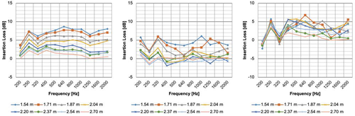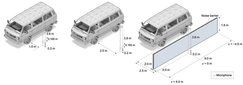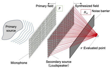 A A A Volume : 44 Part : 2 Estimation of insertion loss for a noise barrier with multichannel sound reproduction technologySatoshi Hoshika 1 , Tetsuya Doi, Masaaki Hiroe Kobayasi Institute of Physical Research 3-20-41 Higashimotomachi, Kokubunji, Tokyo, 185-0022, JapanTakahiro Iwami Kyushu University 4-9-1 Shiobaru, Minami-ku, Fukuoka, 815-8540, JapanABSTRACT A method based on the wave field synthesis is proposed to estimate the insertion loss of noise barriers under complex di ff racted sound fields owing to the characteristics of noise sources and transmitted sound through barriers. This method is equivalent to evaluating the acoustic insertion loss of noise barriers in a reproduced sound field. The proposed method has two main features. First, by storing the radiated sound data of various noise sources in advance, their insertion losses can be obtained. Second, the multipoint impulse responses can be measured by sequentially changing the position of one loudspeaker. Therefore, many loudspeakers are not required. To validate this method, a numerical simulation was performed considering a di ff racted sound field consisting of a point source and rigid barrier. Moreover, the insertion loss of wooden noise barriers for one loudspeaker was experimentally estimated under primary and synthesised sound field conditions. As a practical example, the insertion losses of these noise barriers for a moving automobile were estimated. The results demonstrate that the estimation error is within a few decibels in the frequency band where spatial aliasing does not occur.1. INTRODUCTIONInstalling noise barriers is a common noise reduction method for dampening railway and road tra ffi c noise. Numerical simulations [1, 2] and scaled acoustic model tests [3] are commonly performed to estimate the noise-reduction e ff ect. However, it is sometimes di ffi cult for these methods to consider conditions such as the directivity of sound sources, time variability, and detailed structure of noise barriers. The methods using actual barriers such as European standard [4], field test [5], and full-scale model experiment [6] are able to consider the structure of barriers but since they use one loudspeaker as a source, they can not take into account the characteristics of actual sound sources. In-situ tests [7, 8] are among the best approaches to consider the abovementioned conditions. However, these experimental processes are costly and time consuming. Therefore, a practical estimation method is1 hoshikasatoshi@gmail.com useful for considering the abovementioned conditions. In this study, we propose an insertion loss estimation based on the wave field synthesis [9], which is a sound field reproduction technique, as a method to obtain the insertion loss considering the characteristics of noise sources and transmitted sound through barriers. This method uses a transfer function between multiple points and is equivalent to physically evaluating the acoustic insertion loss of noise barriers within a reproduced sound field. Some techniques of physical acoustic measurements using sound field reproduction have been reported in the literature. For example, measuring the sound absorption coe ffi cient of materials in a reproduced sound field [10] reproduces random incident waves via boundary-surface control [11]. Moreover, the study reproduced the idling sound of an automobile from outside the car cabin [12] using higher-order ambisonics [13]. The sound field of the car cabin was evaluated by placing the actual car in the reproduced sound field. Although there are many examples of sound field reproduction technologies used for subjective evaluation experiments, there are few examples of their use for objective evaluation, except for the abovementioned investigations. In this study, to verify the validity of the proposed method, we have conducted numerical analysis and laboratory experiments on the di ff racted sound field of a point source with barriers. As an application example of the proposed method, we report the results of estimating the insertion loss of barriers for the drive-by noise an automobile created.2. PRINCIPLES OF REPRODUCED AND SIMPLE DIFFRACTED SOUND FIELD Figure 1 shows a conceptual diagram of reproduced and di ff racted sound fields. The x-axis is the length direction, y-axis is the height direction, and z-axis is the normal direction of the noise barrier. As shown in Figure 1(a), when z = z S with boundary S and half-space V =!"r ∈ R 3 | z ≥ z S, the sound pressure at the sound receiving point r ∈ V is expressed by Rayleigh’s second integral using the sound pressure at s on S [14]#P ( s ) ∂ G ( s , r )P ( r ) = − 2∂ n d S , (1)Swhere G denotes Green’s function in three-dimensional free space and ∂ G ( s , r ) /∂ n represents the propagation from a dipole source oriented towards n to r at position s . n denotes the normal vector from S to V . The sound pressure P is expressed in the frequency domain; however, the frequency variable ω is omitted for simplicity. In the wave-field synthesis method based on Rayleigh’s second integral, dipole loudspeakers are discretely placed on S as secondary sound sources. The sound field is reproduced by playing back the sound pressure recorded in an original sound field. On the other hand, when an aperture S ′ and rigid barrier surface S ′′ are set at z = z S ′ and half-space V ′ =!", as shown in Figure 1(b), the sound pressure at r ∈ V ′ can also be expressedr ∈ R 3 | z ≥ z S ′(a) (b) (c)Figure 1: Conceptual diagram of reproduced and di ff racted sound fields: (a)Reproduced field, (b)di ff ractedfield, (c)di ff racted field in reproduced field. by Rayleigh’s second integral according to the sound pressure in s ′ on S ′ . This is the expression of di ff racted fields through an analogy of optics [15], which corresponds to considering the slit for light as an aperture for sound.#S ′ P ( s ′ ) ∂ G ( s ′ , r )∂ n d S 