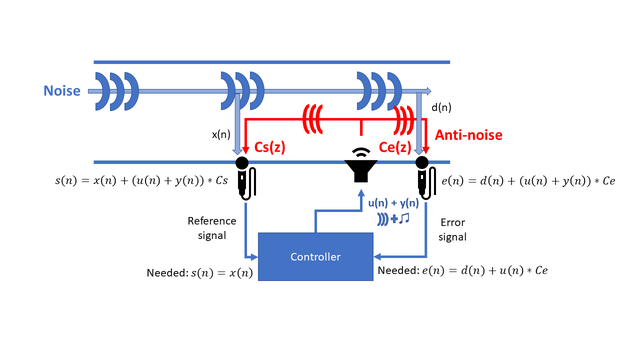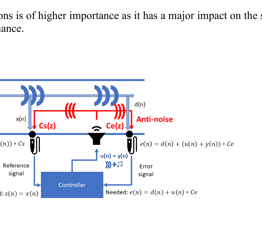 A A A Volume : 44 Part : 2 Public address and sound reproduction by an active noise control sys- tem in ducted ventilation systemStéphane Lesoinne 1 Belgian Building Research Institute Rue du Lombard 42, B-1000 Bruxelles, BelgiumABSTRACT In a ventilation duct, two types of silencers are used: passive (medium and high frequencies) and active (low frequencies). Active silencers have a loudspeaker (control loudspeaker) that generates anti-noise. Usually, this system is placed near the source and far from the vent. But, in short ducts, the system is placed close to a vent and the control speaker can be used as a background speaker to play music, information, alerts (the target signal) ... The active noise control (ANC) system is based on the adaptive feedforward normalized FxLMS which uses a reference and an error microphone to pick up respectively the noise to attenuate and the residual noise after control. The algorithm is mod- ified so that the target signal does not contaminate the reference nor the error signals. The new algorithm is tested in real time in a short duct with different types of noise and different types of sound.1. INTRODUCTIONModern buildings and housing requires efficient ventilation systems to maintain an indoor air quality within standard expectations. But noises passing through or emitted by the ventilation system have a major impact on the comfort, well-being, sleep quality, work-related task focus... An objective of the TowardsSmartVentilation research project is to reduce the noise emitted by centralized system as well as its perceived annoyance in mid-size building using passive as well as active techniques.On one hand, some mid-size buildings use public-address system (PA systems) for information and/or music diffusion through loudspeakers. Others use masking system to reduce noise annoyance by emitting pleasant sound that will mask/hide the unpleasant noise. For example, the annoyance caused by road traffic noise can be reduced by speakers that play bird songs [1, 2]. On the other hand, active silencers generate secondary sound waves (“anti-noise”) interfering negatively with the pri- mary noise in order to reduce its amplitude in a given region of space [3]. After the silencer, residual noise remains and depending on its sound level, can still be a source of annoyances.This paper study the feasibility of using the active silencer loudspeaker as a combined source of “anti-noise”, information, music and masking sounds. This will require to set the control loudspeaker close to an air outlet which is seldomly the case for centralized ventilation. But it also can be seen as moving the PA or masking system to the ventilation duct with the extra benefit of ventilation noise reduction by active noise cancelation, with an extra controller, Figure 1.1 Stephane.lesoinne@bbri.be Figure 1 Scheme of sound broadcasting through a feedforward active noise control systemThe algorithm must be adapted and the modified version will be referred to as PA-ANC (Public Address - Active Noise Control) in the remainder of this document. These modifications will be pre- sented in the next section while the results of the tests in a rectangular-section duct will be presented in section 3. The tests will be performed on the basis of the Leaky Normalized FxLMS feedforward algorithm but the principle developed here can be used with any other algorithms. 2. FEEDFORWARD PA-ANCIn this section, the principle of the feedforward ANC will be presented followed by the modifications needed to turn it into a PA-ANC system.Figure 2 Feedforward ANCNoise din) ad Anti-noise Cs = ce (0) = x(n) + u(n) + Cs Wl 7 | e(n) = dfn) + u(n) + Ce Reference Error signal signal Needed: s(n) = x(n) Needed: e(n) = d(n) + u(n) + Ce ansfer path from control loudspeaker to reference microphone Ce: transfer path from controlloudspeaker to error microphone As illustrated at Figure 2, the noise is measured by a reference microphone and this measurement is used by the controller to generate the anti-noise. The controller continuously adapts the anti-noise generation by changing internal coefficients in order to minimize the residual noise at the error mi- crophone. To efficiently reduce the noise, the controller needs to know both 𝐶𝑒 and 𝐶𝑠 , which are, respectively: - the transfer path between the towards-loudspeaker output and the error signal input and - the transfer path between the towards-loudspeaker output and the reference signal input. In the controller, 𝐶𝑒 is required at the adaptation stage and 𝐶𝑠 is needed to reconstruct the reference signal. Indeed, when the control loudspeaker emits the anti-noise 𝑢(𝑛) , the signal measured at the reference microphone becomes𝑠(𝑛) = 𝑥(𝑛) + 𝑢(𝑛) ∗𝐶𝑠 , ( 1 )which contains the noise and the anti-noise. In practice, as 𝐶𝑒 and 𝐶𝑠 are not known, the approxima- tions 𝐶𝑒 and 𝐶𝑠 (𝑛) will be used instead. The reconstructed reference signal is thus:𝑥(𝑛) = 𝑠(𝑛) −𝑢(𝑛) ∗𝐶𝑠 , ( 2 )The quality of these approximations is of higher importance as it has a major impact on the stability and the noise attenuation performance.Figure 3 PA feedforward ANCNow, as illustrated at Figure 3, in the PA-ANC system, the signal send to the loudspeaker is made of the anti-noise 𝑢(𝑛) and the information signal 𝑦(𝑛) . Thus, the signal measured at the reference microphone becomes:Noise d(n) alo) Anti-noise Cs(z) s(n) = x(n) + (ae(n) + y(n) # Cs ul en) = a(n) + (u(n) + y(n) # Ce ula) + vio) Reference wea Ercor signal Needed: s(n) = x(n) Needed: e(n) = d(n) + un) Ce 𝑠′(𝑛) = 𝑥(𝑛) + (𝑢(𝑛) + 𝑦(𝑛)) ∗𝐶𝑠 , ( 3 )and the signal measured at the error microphone becomes:𝑒′(𝑛) = 𝑑(𝑛) + (𝑢(𝑛) + 𝑦(𝑛)) ∗𝐶𝑒 , ( 4 )The reference signal can be estimated by:𝑥(𝑛) = 𝑠 ′ (𝑛) −(𝑢(𝑛) + 𝑦(𝑛)) ∗𝐶𝑠 , ( 5 )And so is 