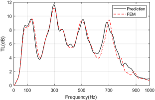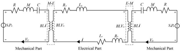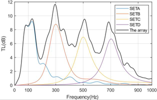 A A A Volume : 44 Part : 2 Acoustic analysis of coupled loudspeakers for low frequency ductnoise reflectionShang Li 1 College of Power and Energy Engineering, Harbin Engineering University, China 145 Nantong St. Nangang Dis. Harbin, Heilongjiang, P. R. China 150001 Xiaochen Zhao * 2 College of Power and Energy Engineering, Harbin Engineering University, China 145 Nantong St. Nangang Dis. Harbin, Heilongjiang, P. R. China 150001 Xinyu Zhang 3 College of Power and Energy Engineering, Harbin Engineering University, China 145 Nantong St. Nangang Dis. Harbin, Heilongjiang, P. R. China 150001ABSTRACT The passive control of low-frequency duct noise remains a technical challenge. Inspired by the research of Wang and Huang [Investigation of a broadband duct noise control system inspired by the middle ear mechanism, Mech. Syst. Signal Process. 31 (2012) 284–297.], an electro-mechanical coupling approach is introduced to solve this problem. The device consists of the main duct segment and multiple sets of connected loudspeakers, which functions as a side-by tube in traditional Herschel-Quincke (HQ) tube. The acoustic waves imposed on the upstream loudspeaker can be transmitted to the other loudspeaker via the connecting circuit immediately, which represents a fast track when compared with the wave transmission via the fluid medium in the main duct. A periodic silencer array is developed to broaden the bandwidth and increase the magnitude of noise attenuation. Transfer matrix method is adopted to investigate its acoustic performance. If proper parameters are selected, the proposed silencer can function effectively as wave reflector in low frequency range. The TL spectrum exhibits multiple peaks, which are mainly contributed by the HQ- tube-like resonance and mechanical resonance of the loudspeaker itself.1. INTRODUCTIONDucts play an important role in conveying different types of fluid, but noise problems always exits. The attenuation of low frequency duct noise with limited space occupation has always been a challenge.Reactive silencers are widely used to attenuate duct noise, due to their relatively simple structure and durability. Typical examples are expansion chamber, quarter wavelength resonators, Herschel- Quincke (HQ) tube, etc. However, the low frequency performance of those reactive silencers is still limited by the space occupation that can be achieved in practice. Therefore, a major challenge in the application of reactive silencers is to strike a balance between limited space, low-frequency performance and effective silencing bandwidth.HQ tube can exhibit multiple narrow sound attenuating bands related to the length of the ducts. Selamet and Dickey addressed an expression for the transmission loss characteristics of the HQ tube [1] . In order to obtain broadband silencing effect, various arrangements of HQ tubes have also1 lishang0711@163.com 2 zhaoxiaochen@hrbeu.edu.cn (corresponding author) 3 zhangxinyu@hrbeu.edu.cn been developed, such as the structure with multiple bypass tubes in parallel, combined with micro- perforated panels, sound-absorbing materials or expansion chambers [2-5] . However, it is still difficult to shift the TL peak of HQ tube to a lower frequency, because the peak frequency is only related to the phase difference between the two acoustic pathways.The research of Wang and Huang provides us with a new approach to solve this problem. They used two rigid plates connected by a rigid rod to replace the sound propagation bypass, which exhibits the acoustic interference elimination effect similar to a HQ tube [6] . Meanwhile, in noise control area, electrodynamic loudspeakers are generally used as a transducer. Connecting the loudspeaker to a shunt circuit can form a resonant absorber, and its sound absorption feature can be adjusted by the parameters of the connected electrical circuit. Fleming et al . experimentally demonstrated that a loudspeaker connected with a shunt circuit can efficiently exhibit a behavior similar to that of the Helmholtz resonator at resonant frequency [7] . Zhang et al . studied the effect of different components in the shunt circuit on the silencing performance of the resonant absorber. It was found that the shunt capacitor and the reduced electrical resistance of the voice coil are the key to sound absorption improvement. The micro-perforated plates can also be adopted to extend the silencing frequency band [8-9] .In this paper, inspired by Wang and Huang's research [6] , we combine electro-acoustic transducer with the silencing mechanism of traditional HQ tube. The simplified model is shown in Figure 1. This basic configuration includes a closed electrical circuit and two electrodynamic loudspeakers, which function as an acoustic transmission system. With the in-coming waves passing over the diaphragm of upstream loudspeaker, this diaphragm is excited to vibrate. Then an induced current is generated in the circuit and drives the diaphragm of the downstream loudspeaker to radiate sound. The coupled loudspeakers actually play a role similar to the bypass in traditional HQ tube. Therefore, if both the two loudspeakers are excited efficiently, then high-efficiency transmission of sound can be achieved. Then the entire silencing structure can be treated as a new type of reactive silencer.This paper begins by the 1D analysis method in Sections 2 and the results are proved to be in good agreement with those from the 3D numerical solution. Then the transfer matrix method is employed to evaluate the performance of the single silencer unit (Section 3), as well as the silencer array (Section 4). The Sections 5 is concerned with the main findings of the theoretical research, focusing on the detailed features of this type of silencer. Finally, conclusions will be drawn in Section 6.w bP Z1 V Z1 P Z2 V Z2P i P r C U D T IR P T w d2r L up 2r L downL 1Figure 1: Theoretical model of the silencer.2. ACOUSTIC IMPEDANCE OF THE LOUDSPEAKER DIAPHRAGMUnder the l