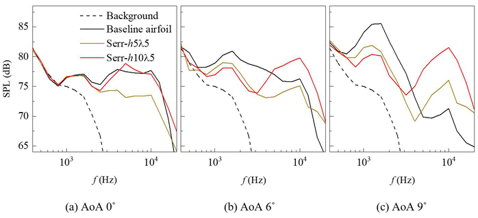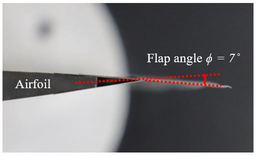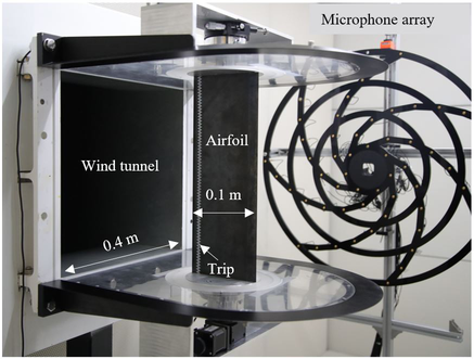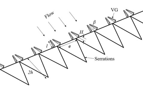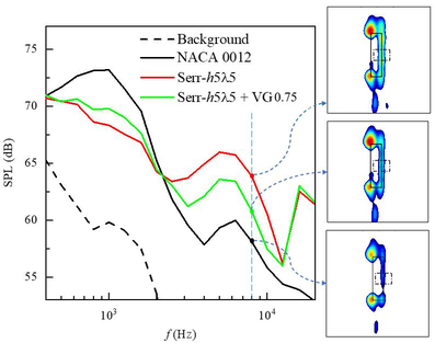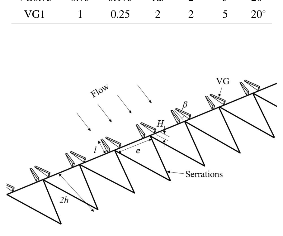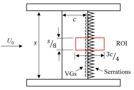 A A A Volume : 44 Part : 2 Enhancing the noise reduction capability of serrations using low-profile vortex generatorsShivam Sundeep, Peng Zhou, Chuntai Zheng, Hanbo Jiang, Siyang Zhong, and Xin Zhang 1The Hong Kong University of Science and Technology Clear Water Bay, Kowloon, Hong Kong SAR, ChinaABSTRACT This paper presents an experimental investigation on improving the noise reduction capability of trailing edge serrations using upstream vortex generators. Experiments were conducted for a 100 mm chord NACA 0012 airfoil at four angle of attack between 0 ◦ and 9 ◦ and flow speed ranging from 20 to 50 m / s. The Reynolds number based on the chord length ranges from 1 . 3 × 10 5 to 3 . 3 × 10 5 . Vane type vortex generators with various heights of h /δ = 0 . 125 − 0 . 25 were placed along with the serration roots, where δ is the boundary layer thickness at the trailing edge without the vortex generators. The aeroacoustic measurements were made with a phased microphone array, and the aerodynamic measurements near the trailing edge were measured using a hot wire. The source integrated noise spectra showed on average 2 dB reduction in the trailing edge noise over high frequency range above 3 kHz. The generation of streamwise vortices by vortex generators can be identified in the wake measurement. These streamwise vortices were further found to counteract the cross-flow generated at the serration roots, hence improving the performance of the serration.1. INTRODUCTIONThe airfoil self-noise generated by the scattering of surface pressure fluctuations at the trailing edge has been widely studied in the last decade [1,2]. Serrations have shown as capable in reducing the trailing edge noise. They are found to disrupt the development of spanwise vortices and assist the growth of streamwise vortices near the trailing edge and in the wake [3,4]. Experimentally many studies have found noise reduction of up to 7 dB in wind tunnel measurements using serrations [5,6]. Additionally, several models predicts 7 − 10 dB noise reduction similar to experiments [7, 8]. Zhou et al. [9] investigated the e ff ect of serration flexibility on the trailing edge noise. They observed an extra reduction in noise in the high-frequency range by flexible serrations. Further, they found that the flexible serrations can align better with the flow and reduce the aerodynamic loading on the airfoil. Although serrations have shown consistent noise reduction experimentally, an essential drawback of the serrations is the undesirable noise increment above a critical frequency [2, 10]. In practice, the flow may not be perfectly aligned with the serrations, potentially leading to an undesirable cross- flow and turbulent structures in the vicinity. E ffi ciency loss in the noise reduction can be observed, especially at high frequencies. Gruber [11] attributed the high-frequency noise increment to the1 aexzhang@ust.hka slaty. inter.noise 21-24 AUGUST SCOTTISH EVENT CAMPUS O ¥, ? GLASGOW increased turbulence intensity at the serration roots. Further, the noise increase at the high frequencies was found to be greater in the case of the misalignment between the serration and the undisturbed wake flow [6], and more noteworthy when the serrations have flap angles [10, 12, 13]. Avallone et al. [14] proposed that the cross-flow increased the high-frequency noise by continuously pushing the high moment fluid toward the serration surface. Later, with the help of particle image velocimetry (PIV) measurements of a serrated airfoil, León et al. [10] observed an enhanced wall-normal velocity fluctuation at the pressure side edge of the serrations at the crossover frequency, which is believed to be linked with the origin for the noise increment. Flow-control devices such as vortex generators (VGs) has the potential to control the cross-flow at the serration roots. Vortex generators can e ff ectively produce counter-rotating streamwise vortices within the boundary layer [15, 16]. The induced vortices can transfer high momentum flow from the upper regions of the boundary layer to the near-wall regions [15]. With proper VG design and placement, streamwise vortices of su ffi cient strength can be generated to counteract the cross-flow at the root of the serrations. In this regard, the current work aims at exploring the potential of further enhancing the noise reduction capability of the trailing edge serrations by employing the vortex generators at the roots of the flexible serration, as shown in Fig 1. The idea is to nullify the cross-flow using the streamwise vortices generated by the vortex generators.Figure 1: A schematic showing the location of vortex generator on the airfoil.A NACA 0012 airfoil with serrated trailing edge and with VG placed on its roots are experimentally tested at di ff erent free stream velocities. Non-zero serration flap angle, φ , and multiple angles of attack, α , are prescribed as sources of serration-flow misalignment. In order to relate the noise reduction mechanism to the flow field e ff ects, hot-wire measurements were taken along with the acoustic phased array measurements. The remaining part of this paper is organized as follows. First, the experimental setup and measuring methods are described in Section 2. Then, the results are presented in Section 3. In particular, the serrated trailing edge noise reduction and the corresponding mechanism are discussed in this part. Finally, the conclusions are given in Section 4.2. EXPERIMENTAL SETUPThe experiments were conducted in an anechoic wind tunnel, Ultra-quiet Noise Injection Test and Evaluation Device (UNITED), at The Hong Kong University of Science and Technology (HKUST) [17]. An open-jet square test section of 400 mm side was used in the study as shown in Fig. 2. The flow speed ranges from 10 m / s to 70 m / s, with turbulence intensity within the test section being lower than 0.32% over the whole flow speed range. The anechoic chamber surrounds the test s