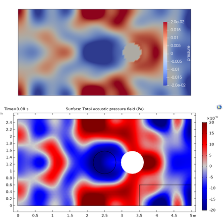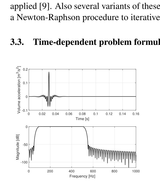 A A A Volume : 44 Part : 2 A reduced-order cutFEM approach to model complex moving sound sourcesSjoerd van Ophem 1 and Wim Desmet KU Leuven, Department of Mechanical Engineering Celestijnenlaan 300B, B-3001, Heverlee, Belgium Flanders Make- DMMS corelab, BelgiumABSTRACT While traditional finite element based vibro-acoustic analysis of structures is done on stationary structures, in many occasions the structure under investigation is actually moving. To perform accurate finite element analysis on the vibro-acoustic performance of such structures requires the evaluation of a time-varying system, leading to several challenges, such as the selection of a strategy to update the mesh to the new configuration and an adequate time integration scheme that does not introduce large numerical artifacts. Additionally, the time-varying nature leads to an increase in computational complexity. In this paper a modeling strategy based on cut finite elements (cutFEM) is introduced that aims to tackle these challenges. The cutFEM approach can be seen as a fictitious domain approach in which the source is moving over a static mesh, cutting through elements where the actual source is located, using a level set description. The key advantage of this approach is that no re-meshing and / or mesh morphing is required. It is shown how both implicit and explicit time integration schemes can be used to propagate the solution while the source is moving. Additionally, several model order reduction strategies are compared to speed up the online evaluation of the reduced order model.1. INTRODUCTIONA common assumption that is done for numerical vibro-acoustic analysis, e.g. with the finite element method (FEM), is that the source position is stationary. However, in many cases the acoustic source is actually moving. For example, when vehicle pass-by noise is evaluated or in machines and vehicles with many moving parts. While a far-field moving sound source can often be modeled with a simplified source model, such as a moving point source, the accurate modeling of near-field sound propagation requires a more detailed source model. A moving sound source brings many challenges from a modeling perspective. The traditional approach with conformal finite elements would mean that at every time instance a re-meshing step is required. This is not only a costly operation, but also requires manual intervention to assure the mesh quality is su ffi cient. To circumvent or mitigate this problem, several alternative solutions have been proposed in the literature that can broadly be divided into mesh morphing and static mesh approaches.1 sjoerd.vanophem@kuleuven.bea slaty. inter.noise 21-24 AUGUST SCOTTISH EVENT CAMPUS O ¥, ? GLASGOW A popular approach that is based on mesh morphing is to reformulate the problem to an Arbitrary Lagrangian-Eulerian (ALE) formulation [1]. The advantage of the ALE form is that the degrees of freedom (DOFs) do not change when the source is moving, but morph to a new location. However, when the elements become too distorted, which is possible when the source moves large distances as compared to the acoustic wavelengths of interest, a re-meshing step is required, which is highly undesirable. An alternative approach is to use a static mesh, such that the problem does not require a re-meshing step during simulation, and use techniques to enrich the mesh to include the proper source description. Several techniques to do this are known, such as the extended finite element method (XFEM) and the cut finite element method (cutFEM) [2–4]. The disadvantage of these methods with respect to the ALE formulation is that the DOFs will change during the simulation, since the DOFs that are covered by the source fall outside of the physical domain and will not contribute to the solution. In this paper, it is chosen to investigate a cutFEM approach, due to the convenience of not having to apply mesh morphing and / or re-meshing. In Sec. 2, A cutFEM approach is derived that can model moving acoustic sources, while minimizing numerical artifacts. Several time-integration schemes are compared to this end in Sec. 3, comparing both the time response directly and the frequency content of the signal. Besides accurate modeling, also a preliminary investigation is done on the creation of a reduced order model in Sec. 4.The computational cost of such simulation is especially high, since the system matrices have to be recalculated at each time step. A reduced order model would speed up calculation time and potentially enable (near-)real time vibro-acoustic virtual sensing, as has been shown in previous work for stationary sources [5,6].2. CUTFEM FORMULATIONIn the following section the cutFEM formulation will be elaborated. The main idea behind a cutFEM formulation is to make the mesh as independent as possible from the geometry of the problem under investigation, while keeping the accuracy and stability of conformal finite elements. The boundaries / interfaces of the geometry are described by cuts through elements in the static mesh and numerical integration of the cut elements is done until the cut. A general overview of the cutFEM formulation is given by Burman et al. [2].2.1. Discretization of the wave equation with cutFEM To obtain the discretized acoustic cutFEM problem, we follow the approach given by Sticko and Kreiss [7]. Consider a 2-D domain in which the acoustic propagation is defined by the wave equationc 2 0 ∇ 2 p − ¨ p = 0 . (1)In this equation p represents the acoustic pressure, ¨ p is the second derivate of p with respect to time and c 0 the speed of sound in the fluid. Additionally, we assume that the source is described with a non-zero Neumann boundary condition (BC) at boundary Γ N∂ p ∂ n | Γ N = g N . (2)Within the scope of this paper, we do not consider any other type of BC or source description in this work. Now, suppose that a su ffi ciently refined background mesh T b exists of linear elements that c