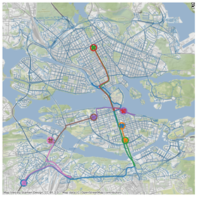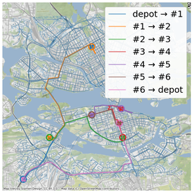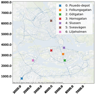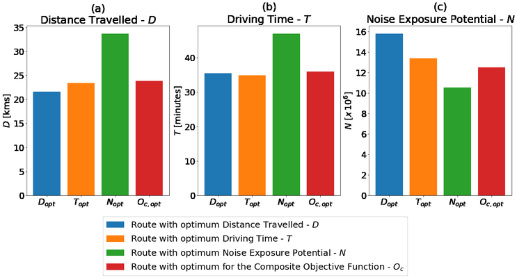 A A A Volume : 44 Part : 2 Optimizing noise exposure in the Vehicle Routing Problem: A case study of last-mile freight deliveries in StockholmSiddharth Venkataraman 1The Centre for ECO 2 Vehicle Design, The Marcus Wallenberg Laboratory for Sound and Vibration Research (MWL), KTH Royal Institute of Technology, SE-100 44, Stockholm, SwedenSacha Baclet The Centre for ECO 2 Vehicle Design, The Marcus Wallenberg Laboratory for Sound and Vibration Research (MWL), KTH Royal Institute of Technology, SE-100 44, Stockholm, SwedenDr. Romain Rumpler The Centre for ECO 2 Vehicle Design, The Marcus Wallenberg Laboratory for Sound and Vibration Research (MWL), KTH Royal Institute of Technology, SE-100 44, Stockholm, SwedenABSTRACT Improvements in noise mapping techniques and smart cities infrastructure have fostered the development of new ways to evaluate tra ffi c noise exposure. An example of one such outcome is the noise exposure sensitivity map, which quantifies the noise exposure potential of a road network as a function of the vehicle type, the prevailing background noise, and the population exposed. The potential for planning vehicle routing that is o ff ered by the above-mentioned map calls for solving the Vehicle Routing Problem (VRP) with a focus on optimising the noise exposure. A case study is chosen for applying the VRP, and it is taken from last-mile o ff -peak deliveries performed in Stockholm, Sweden in the context of the CIVITAS Eccentric project. The VRP is independently solved for the following objectives: distance travelled, driving time, and driving noise exposure potential. Also considered is a heterogeneous objective that is a combination of these factors. The impact of the objective function, on the resulting routes is presented.1. INTRODUCTIONFreight transportation, although having benefits, also generates costs that fall on people in the vicinity of its operations [1]. This led to expanding the objectives of the classical vehicle routing1 sidven@kth.sea slaty. inter.noise 21-24 AUGUST SCOTTISH EVENT CAMPUS O ¥, ? GLASGOW problem (VRP) to include metrics that can assess the potential for environmental pollution [2, 3]. Environmental noise has been regarded for decades as a cause of public health concern [4]. Its negative impact as an environmental stressor in Europe is increasing in dominance [5] with road tra ffi c noise considered as the main contributor [6]. In the context of road tra ffi c, road freight transport has a significant presence in the road network [7] and consequently shares in being responsible for noise pollution problem. Noise emissions is therefore a reasonable candidate to be considered in the VRP. The work presented here proposes a method to include noise pollution in the center of the vehicle routing problem, namely in the definition of the objective function. A prerequisite to apply this method is a road-network derived using a particular methodology for noise evaluation: receiver- centric noise exposure sensitivity mapping [8]. To test the methodology, an existing case study of last-mile o ff -peak deliveries is utilized to frame a vehicle routing problem. This case study took place in the City of Stockholm, Sweden, in the context of the CIVITAS Eccentric project [9]. Four objective functions are defined and used for optimizing the vehicle route. The optimized routes are then evaluated on the basis of the following metrics: distance travelled, driving time, and noise exposure potential.2. METHODOLOGYA classical single-echelon VRP is defined by locations of the depot and customers, and the costs incurred in travelling between each pair of locations. It also includes the supply at the depot, demand of the customers, and the capacity of the vehicles performing the delivery. A double-echelon VRP includes the presence of warehouses for the intermediate storage of goods between the depots and the customers. Depots and warehouses tend to be placed at the outskirts of urban areas, thereby reducing the scope of noise pollution when routing between them. Therefore, consideration of noise exposure is limited to the routing between customers and a depot or warehouse.2.1. Input Data The primary type of input data is connected to the road network. The spatial limits of the road network is defined by the spatial spread of the nodes, i.e. , the locations of the depots / warehouses and the customers. Geographical data of a road network is obtained from OpenStreetMap (OSM) [10]. Two additional attributes of the road network need to be derived for evaluating the cost metrics presented in this approach. The first one is the average speed of a vehicle on each road segment. This requires GPS waypoint information from the vehicle types of interest, and road segment attributes, namely road category and maximum speed limit. The former is obtained from sources responsible for the vehicle service scheduling, e.g., logistics service providers. The latter two can be obtained from OSM provided the road network data is well maintained, otherwise from other GIS service providers like Google and HERE. The second additional attribute is the noise exposure potential of the road network. This is obtained from noise-exposure sensitivity maps using the approach presented in [8].2.2. Cost metrics A cost metric is an attribute of a road segment that serves two purposes: it may be included in an objective function that is to be minimized, thereby exerting an influence in the route planning; it may also be used to evaluate a route obtained after optimizing an objective function, even if the cost metric is not used in this objective function. Two metrics that are commonly optimized in the VRP are: i) distance travelled, and ii) driving time. In the presented approach, a new metric is introduced to enable minimizing noise pollution: iii) noise exposure potential. The three cost metrics are defined and quantified for each road segment as follows.2.2.1. Distance TravelledThe distance travelled is 