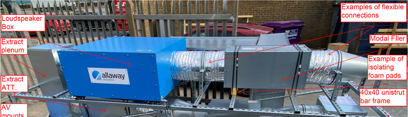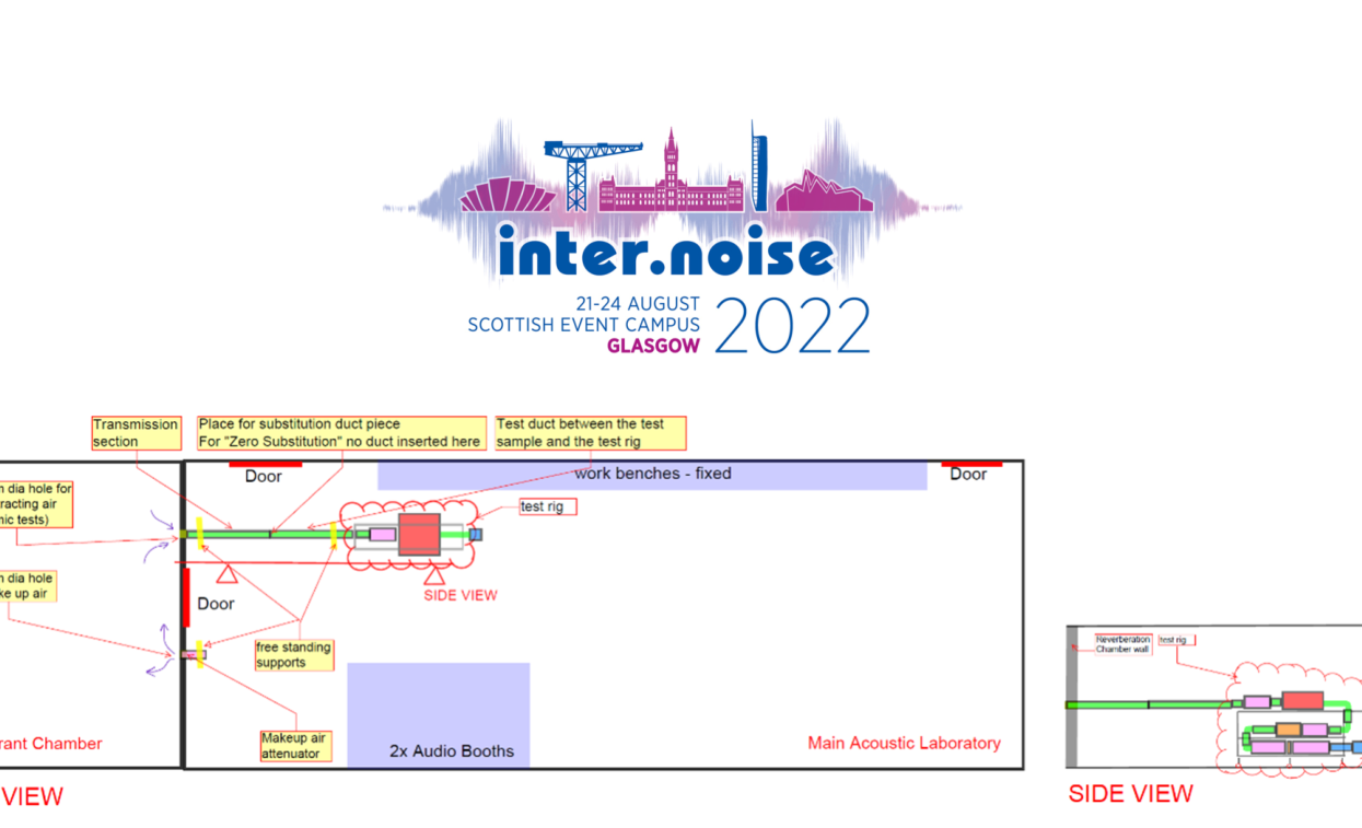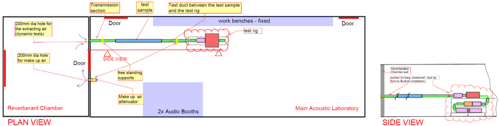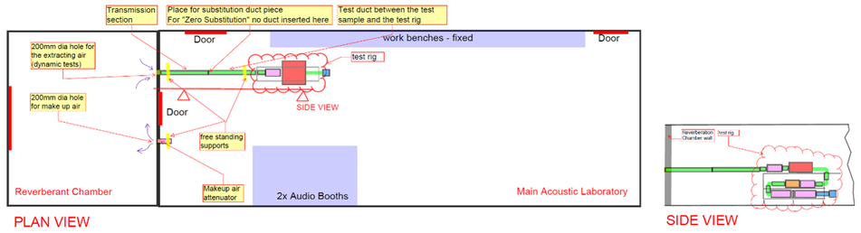 A A A Volume : 44 Part : 2 Experimental Acoustic Testing Of Alternative Ventilation Ducts Zekic, Suzana 1 , Imtech Engineering Services London South Bank University 20 Kingston Road, Staines-upon-Thames 103 Borough Rd Middlesex TW18 4LG London SE1 0AA Gomez-Agustina, Luis 2 ; Aygun, Haydar; Chaer, Issa London South Bank University 103 Borough Rd, London SE1 0AAABSTRACT Ducts of alternative materials to galvanised steel, are widely employed in residential buildings’ mechanical ventilation systems in a bid to comply with the conservation of energy regulations in circumstances that prevent the use of natural ventilation. The noise transfer predictions of systems with alternative ducts are still being based on data for galvanised steel due to the lack of acoustic performance data of alternative ventilation ducts tested in controlled conditions. To close this knowledge gap, a test rig was designed and built based on the test set up defined in ISO 7235. Alternative ventilation ducts and associated 90º bend samples were acoustically tested in controlled laboratory conditions utilising customized test rig developed to suit typically small duct profiles of alternative ventilation ducts. Test samples were tested using two methods: the substitution principle as outlined in BS EN ISO 7235 (2009) as well as applying a novel “zero substitution” conceptual approach. The preliminary results of the “zero substitution” approach tests show indication of its validity. 1. INTRODUCTIONDucts of alternative materials to galvanised steel, are widely employed in residential buildings’ mechanical ventilation systems in a bid to comply with the conservation of energy regulations [1] in circumstances that prevent the use of natural ventilation. The noise transfer predictions of systems with alternative ducts are still being based on data for galvanised steel due to the lack of acoustic performance data of alternative ventilation ducts tested in controlled conditions [2]. To close this knowledge gap a programme of experimental tests was devised, involving the re- view of existing and relevant test procedures [3] creation of a dedicated test rig and the implementa- tion of a series of laboratory based measurements. This paper aims to inform on progress to date on the experimental testing processes implemented and the conceptual stage of a novel test procedure approach.1 suzana.zekic@imtech.co.uk 2 gomezagl@lsbu.ac.ukinter.noise scone ROSE DODD as 2. EXPERIMENTAL TESTING OVERVIEWSamples of ventilation ducts of alternative materials (plastic and polystyrene) of straight and as- sociated 90º bend configurations were acoustically tested in controlled laboratory conditions. The samples were representative of ducts employed in the residential ventilation industry. Sound transmission loss and aerodynamic performance were investigated by means of experi- mental measurements utilising the substitution principle as outlined in ISO 7235 [4] test procedure. The conceptual stage of a novel and alternate test procedure named as “zero substitution” was developed and preliminary validation tests were undertaken. A custom-built portable test rig was constructed to enable a comprehensive set of investigative tests in an acoustics laboratory. 3. STANDARDISED TEST PROCEDURE ISO 7235This international standard provides guidance for laboratory testing procedures for determining the insertion loss, flow noise and total pressure loss for ducted silencers and air-terminal units uti- lizing the substitution principle. Following this method, the sound pressure levels (SPL) of the transmitted sound source are firstly obtained for the test sample and then the sample is replaced by the substitution piece and the SPL are measured again. The arithmetic difference between the two measurements represents the insertion loss of the tested sample. The measurements of the SPL can be made in a reverberation room, induct - in the test duct before and after the tested sample and also in the free field. The test set up that follows the aforementioned standard as found at Lindab [5] and other testing facilities [6], [7], has elements on a large scale permanently fixed across many rooms allowing test- ing of ducted silencers and air-terminal units of large sizes. In the UK and mainland Europe it is the main testing procedure to obtain the performance of the passive type of silencers used in ventilation systems. 4. THE TEST RIGThe design of the test rig was based on the test set-up described in the ISO 7235 [4]. The alterna- tive ventilation ducts typically used within residential ventilation have small profiles such as the rectangular ducts 220x90mm, 204x60mm, and the circular ducts with 150mm diameter and 125mm diameter meaning that a smaller, scaled down version of the traditional test set up would be better suited for conducting acoustic testing of the same. Furthermore, small test rig elements permitted the built up of the test rig in a compact as well as portable format. The initial idea of having all rig elements in a long horizontal in-line format was abandoned for the vertical stack up formation (Figure 1). This compacted option, compared to the horizontal in- line approach, reduced floor footprint, prevented movement of individual test rig elements, reduced the number of uncertainty factors and provided good accessibility for the monitoring of different parts and sections.inter.noise scone ROSE DODD as 1500 225 1775,Figure 1 Test rig vertical stack up design side view The test rig frame was made from 40x40mm Unistrut bars to keep the weight of the rig as low as possible. Rubber pads were installed between every bar connection for vibration isolation. The addi- tional corners and reinforcement sidebars were added to enhance the strength and sturdiness of the frame and minimize unwanted re-radiated noise emissions. Wheels were installed at each corner and in the middle sections of the rig frame to enable easy movement of the entire rig.