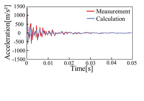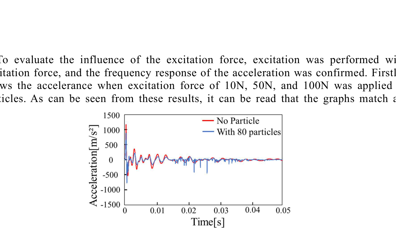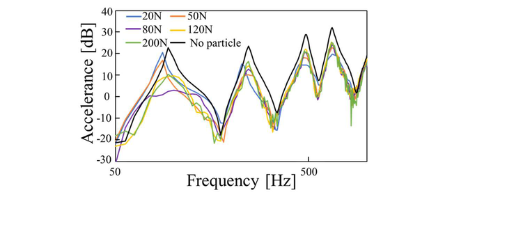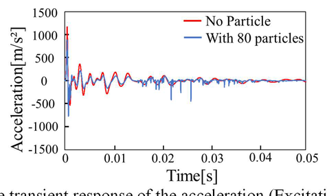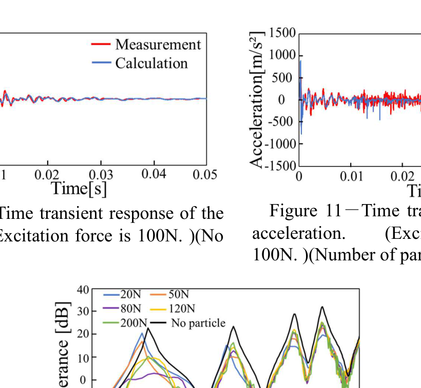 A A A Volume : 44 Part : 2 Numerical simulation of vibration damping by granular materials Takumi Asakura 1 Tokyo University of Science, Graduate School of Science and Technology 2641, Noda, Chiba, JapanABSTRACT In recent years, there have been examples of efforts related to vibration reduction of plate vibration using granular materials, impact dampers, etc. On the other hand, as a means of analyzing the influence of the application of granular material on the vibration characteristics of the plate-shaped structure, it is currently said that little knowledge has been obtained. In this report, a simulation method of the damping effect of bending oscillation of the plate by granular material combining following two kinds of methods was proposed. One is the discrete element method (DEM) for analyzing the motion of the granular material. The other is the finite-difference time-domain (FDTD) method for vibration analysis of the thin plate.In this proposed method, influence of the granular material on the plate vibration was considered. Validity of the proposed method was confirmed by comparison between the results of the calculation and the model experiment. Then, this study confirmed the dependency of the damping effect of the plate vibration on the external excitation force caused by the granular material. 1. INTRODUCTIONTechniques of vibration control are one of the most important factors to improve in the quality of our current living environment, and those has been developed in various ways. Among them, the vibration control for plate-like structures such as ceilings and floors in the architectural fields has been well studied and has been also investigated for many years from the viewpoint of a floor-impact sound problem between dwelling units on the upper and lower floors in a residential space. The noise control technique which realizes sufficient damping effect of the ceiling structure by laying charcoal bag on the ceiling board has been reported [1]. In these researches, it is supposed that the damping effect may be caused by the collision of the granular material and the plate-like oscillator. The vibration control effect has been determined experimentally in various papers, but analysis method has not been sufficiently yet investigated. It is difficult to accurately predict the damping effect caused by such granular materials by only considering the vibration analysis of plates, can be realized by combining that simulation method of bending-vibration of plates and particle motion of the granular materials. While various kinds of researches related to vibration damping have been studied, simulation method of such phenomena has not been sufficiently developed. Therefore, it is effective to analyze the motion of particles in addition to the vibration characteristics of the bending vibration of plate- like structures and to efficiently couple them.There are various kinds of methods currently available for vibration analysis of main oscillators, and these methods are classified into energy-based, and wave-based methods. Methods based on energy include practical methods [2, 3] using empirical formulas and1 t_asakura@rs.tus.ac.jpJai. inter noise 21-24 AUGUST SCOTTISH EVENT CAMPUS ? O ? . GLASGOW statistical energy analysis (SEA)[4], which are used as predictions in aerospace engineering [5]and building fields respectively[6, 7]. While SEA can be applied without limitation to high frequencies, it is difficult to obtain accuracy at relatively low frequencies. To address such problems, a hybrid method combining SEA and wave finite element method (FEM) has been applied to the problem of structure propagation noise by Cotoni et al., [8]. On the other hand, methods based the wave are FEM, BEM, FDM, etc. Since these wave numerical analyses include phase information, they make it possible to predict vibration characteristics at low and medium frequencies like building vibrations. On the other hand, the FDTD method has numerical advantages that can easily visualize the wave propagation mechanism, and applied to acoustics and vibration fields [9, 10].On the other hand, to simulate such a motion of granular bodies, DEM (Discrete element method) has been used. DEM was devised by Cundall and Strack [11] to analyze the complex behavior of soil in rock engineering, and it is a method that is still in development [12]. Moreover, analysis using DEM is also carried out in research in a wide field such as research of dampers with particles in the field of mechanical engineering [13].So, in this research, the simulation method which couple the DEM and FDTD method is proposed, and the damping effect caused by the granular material were numerically studied. the detail of the proposed method and validation method were firstly described. Next, the damping effect of the granular material was discussed through the numerical and experimental results. 2. Numerical Analysis2.1. Finite-difference time-domain methodThis study investigates the time domain calculation for bending-vibration analysis of thin plate. The FDTD method is a method of simulating vibration propagation by sequentially performing the time integration on orthogonal meshes. In this study, vibration analysis of thin plate is performed by solving propagation equation of bending wave for thin plate existing in x-y plane by finite differential scheme.2.1.1 Basic schemeEquation (1) shows the governing equation for bending wave propagation.(1)2 2 2 2 2 2 22 2 2 2 2 w w D w D w h h q x y t x y t t Here, out-of-plane displacement of bending wave vibration w , density 𝜌 , thickness h , flexural rigidity D (𝐷= 𝐸ℎ ଷ /12(1 −𝜐 ଶ )) , loss factor of material 𝜇 and 𝜉 , external force q , respectively.In the FDTD method, the differential term of the governing equation represented by the differential equation is changed into a finite-differential equations, and solve them step-by-step calculation.2.2 Discrete Element MethodDEM is a simulat