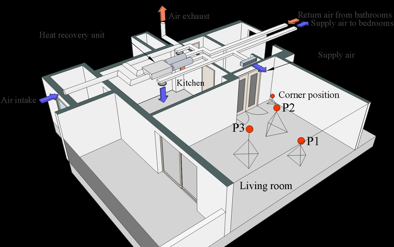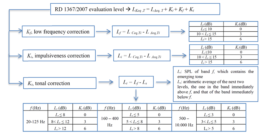 A A A Volume : 44 Part : 2 Applying Spanish Acoustic Regulations to Mechanical Ventilation with Heat Recovery Systems - Case Study Teresa Carrascal 1 Amelia Romero Fernández 2 Belén Casla Herguedas 3 Eduardo Torroja Institute for Construction Science, IETcc- CSIC Serrano Galvache 4 Madrid 28033. SPAINABSTRACT Due to recent changes in IAQ (Indoor Air Quality) and energy efficiency requirements, MVHR (Me- chanical Ventilation with Heat Recovery) has become increasingly common in Spanish new build dwellings. Regarding acoustics, Spanish Decree RD 1367/2007 sets out limits for sound pressure levels due to building services and describes the noise measurement and assessment procedure, which applies also to ventilation noise. The assessment procedure consists of a series of measurements of different noise parameters and the calculation of corrections due to tonal, low frequency and impul- sive components. This paper shows an example of a MVHR fan unit installed in the ceiling of a common dwelling, where some measurements were performed. Based on these measurements, this paper discusses the noise measurement and assessment procedures and proposes some improvements for the Spanish acoustic regulations. In addition, it also analyses the available calculation methods (ASHRAE and VDI 2081) and their application to comply with Spanish requirements 1. INTRODUCTIONThe aim of this paper is to analyse the application of Spanish Decree RD 1367/2007 [1] to Me- chanical Ventilation with Heat Recovery systems (MVHR) in dwellings. This decree is an environ- mental law transposed from [2], which applies to all environmental noise sources, including building services. RD 1367/2007 includes the requirements for sound pressure levels in dwellings due to building ser- vice equipment. It also specifies the measurement and assessment procedure which will be introduced in paragraph 2, which consists of several sound pressure level measurements and the application of corrections for tonal, impulsive and low frequency noise components.1 tcarrascal@ietcc.csic.es2 aromero@ietcc.csic.es3 belench@ietcc.csic.esinter.noise 2-24 august scornsuevearcanmus )())D MVHR systems have become increasingly common in new build homes because they ensure an adequate airflow with minimum thermal losses specially in winter time. These ventilation systems work continuously, 24 hours, 7 days a week, and they consist of a heat recovery unit, equipped with a pair of fans which distribute fresh air to sensitive rooms, such as bedrooms and living rooms, while extracting air from toilet rooms and kitchens. Noise produced by the unit can be transmitted to the rooms though the ductwork and grilles.This paper shows the work of the Quality in Construction Unit to measure the noise produced by a typical MVHR system in a dwelling and the suitability of the of RD 1367/2007 [1] for the assess- ment of service equipment noise. In this work, measurements using the ISO 16032 [3] were per- formed too, because this standard is referenced in the regulations of several European countries. In addition, calculations were also performed to predict noise using [4], [5], [6] and the difficulties to assess components using the available manufacture data are shown.This paper does not intend to characterise noise produced by a particular ventilation system, but to discuss the procedures of Spanish RD 1367/2007 in relation to common MVHR. 2. NOISE REGULATIONS IN SPAINSpanish Building Code, DB HR [7], refers to Spanish Decree RD 1367/2007 [1] which is the environmental law transposed from the Directive 2002/49/CE [2] on assessment and management of environmental noise whose purpose is to prevent and reduce noise pollution.Spanish Decree RD 1367/2007 contains the noise quality objectives applicable indoors that is, the noise limit level allowed in interior spaces, and specifically the noise immission rates for different sources.In addition, RD1367/2007 includes the requirements for sound pressure levels in dwellings due to building service equipment. These requirements are regulated according to articles 24 and 25 of RD 1367/ 2007 and table B.2 of Annex II of RD 1367/2007.Table 1. Noise limit values transmitted in dwellings due to building service equipment. Table B2 from RD 1367/2007.Building use Type of room Noise limits for building service equipment L K,d L K,e L K,nResidential Living rooms 40 40 30 Bedrooms 35 35 25Table 1 considers only the noise transmitted by a certain service equipment to an adjoining area, it deals with the noise level that each service equipment individually must not exceed. It shows the noise index L Keq, T, that is the equivalent continuous sound pressure level weighted A, (L Aeq, T ), cor- rected by the presence of emerging tonal components, low frequency components and noise impul- sive character, according to the following expression:L Keq, T = L Aeq, T + K t + K f + K i (1) Where:- K t is the correction parameter associated with the L Keq, T index to assess the discomfort or ad- verse effects due to the presence of emerging tonal components. - K f is the correction parameter associated with the L Keq, T , index to assess the discomfort or adverse effects due to the presence of low-frequency components. - K i is the correction parameter associated with the L Keq, T , index to assess the discomfort or harmful effects by the presence of impulsive noise. The maximum value of the correction resulting from the sum K t + K f + K i will not be greater than 9 dB. Figure 1 shows the procedure to obtain corrections: K f , low frequency correction, K i , impulsive correction and K t , tonal correction. Figure 1. L Keq,T evaluation level and correction calculations according to RD 1367/2007.3. DESCRIPTION OF THE SYSTEMDecentralized ventilation systems are usually installed in multifamily dwellings in Spain, the HR unit is usually installed inside the ceiling of certain rooms, which are usually the non-sensitive rooms, such as corridors, halls or ki