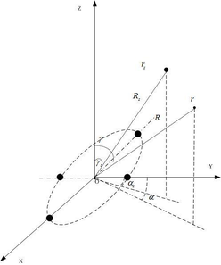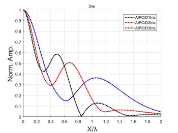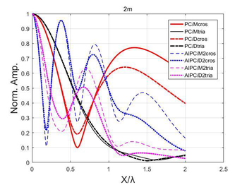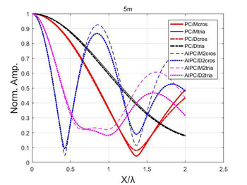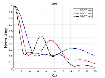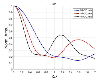 A A A Volume : 44 Part : 2 Four-element planar arrays focus a point-like source based on the artificial iterative phase conjugated processingTing Li 1 Department of underwater weaponry and chemical defense, Dalian Naval AcademyDalian China Yi Zhang Department of underwater weaponry and chemical defense, Dalian Naval AcademyDalian China Liufang Fu Department of underwater weaponry and chemical defense, Dalian Naval AcademyDalian ChinaABSTRACT The artificial iterative phase conjugated processing is an improved algorithm of phase con- jugation and has been proven to focus a sharp focal spot using linear array. Because cross- shaped four-element planar array and triangular four-element planar array are widely used in the situation of little acoustic measuring points, their focal patterns by the artificial itera- tive phase conjugated processing are discussed in this paper. Numerical simulations gives conclusions. Based on the artificial iterative phase conjugated processing, two arrays focus a smaller focal spot than that by phase conjugation. As their iteration number increases, focal spot size decreases but the side-lobe amplitude becomes big. Considering the focal spot size and side-lobe interference, the triangular four-element array has a clearer pattern than the cross-shaped one.1. INTRODUCTIONBecause a sharp focal spot can provide an exact location of the source, it is always a popular top- ic to reduce the focus for noise imaging and location domain [1-9], especially for low-frequency case[10].Phase conjugation is also referred to as time reversal in time domain. It can refocus the incident wave back and further achieving self-adaptive focusing. However, because of the diffrac- tion limitation, focal spot size focused by phase conjugation is larger than half a wavelength. Artifi- cial iterative phase conjugated processing (AIPCP) has been proven to enhance the focus and the diffraction limitation is overcome using uniform linear array[11]. Cross-shaped four-element planar array and triangular four-element planar array are widely used in the situation of little acoustic measuring points[12]. It may be an interesting study on their focal patterns by phase conjugation method (PCM) and artificial iterative phase conjugated processing (AIPCP). In this paper, we em- ploy two kinds of four-element planar arrays to focus a point-like source in the free space using1 litingyouxiang@sina.comworm 2022 PCM and AIPCP. Research is done by numerical simulation. Conclusions come out that focal spot calculated by artificial iterative phase conjugated processing is smaller than that calculated by phase conjugation. Increasing the iteration number, focal spot becomes sharp but the side-lobe disturbance increasing. The dipole form of AIPCP using triangular four-element array has a sharp focus and an acceptable side-lobe disturbance with a small iteration number. 2. ARTIFICIAL ITERATIVE PHASE CONJUGATED PROCESSINGs r In an infinite, homogeneous and isotropic medium, the point-like source is located at in Car- tesian coordinates in figure 1. Figure 1 takes the cross-shaped four-element planar array for exam-j r ple. The array is placed on XOY plane in Cartesian coordinates. Element j is located at and re- ceives the sound from the source.worm 2022Figure 1: Sketch map of the four-element planar array, source, and field points There are two forms of PCM, the monopole one and the dipole one. The pressure received by transducer j are conjugated and then sent by monopole transducers. This monopole form is called PC/M. , , , , , , * / r r r r r r j j s j G G I M jPC (1)The asterisk denotes a complex conjugation. The normal derivate of pressure is conjugated and emitted by dipole sources. This array form of PCM is called PC/D. r r r r r r*, ,, , , ,G G I jPC (2)j j s jD / nnIn AIPCP, each receiver does a PCM in one iteration loop. Outputs of all transducers are summed together after each transducer has finished their iteration loops [11]. According to the two forms of PCM, there are two forms of AIPCP, the monopole one and the di- pole one described as follows after N iteration loops[11]: r r r r r r j j s j G G I PC (3)1 N * M / j N , , , , , , 1 *N G G I r r r r r r, ,, , , ,j j s j (4)N jPC/D nn where denotes the normal derivative operator of the array.n 3. FOCUSING ANALYSIS BY NUMERICAL SIMULATIONworm 2022In this section, a point-like source locates at the origin of the Cartesian coordinate system in the free space. Two kinds of four-element planar arrays are employed to focus the source, their sketch map are shown in figures 2 and 3. Focal spot size by PCM and AIPCP using planar arrays is dis- cussed in quite near distance, near field and far field of the source. Effects of iteration number are also discussed for AIPCP.Figure 2: Sketch map of cross-shaped four-element planar arrayFigure 3: Sketch map of triangular four-element array3.1. Criterion of near field and far fieldThe twin-line planar array has two linear arrays that parallel to the X-axis and has Z-axis sym- metry as shown in figure 2. The scale of planar array is 2 meters. A point-like source located at the origin of the Cartesian coordinates sends a single frequency wave at 344Hz and the wavelength is 1 meter. According to the criterion of near field and far field shown as follows:1.356 Z L Quite near field: 2 1.356 L L Z Near field:1.356 L Z L 2 Far field:3.2. Comparisons between PCM and AIPCPCoordinates of the cross-shaped four-element planar array are (1,0), (0,1), (-1,0), (0,-1). Coordi-2 22 2 nates of the triangular four-element array are ( ,-0.5), (0,1), (- ,-0.5), (0,0).The array locatesat 2m, 5m and 30m away from the source. They are corresponding to a quite near distance, a near field and a far field away from source according to the criterion in section 3.1. In the legend, “PC/Dcros” means the focus is calculated by PC/D using the cross-shaped four-element planar ar- ray. “AIPC/M2tria” means the focus is calculated by AIPC/M usi