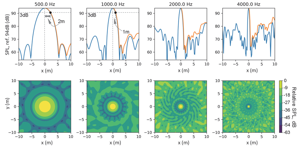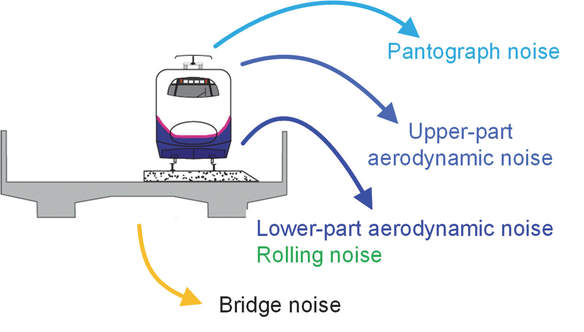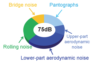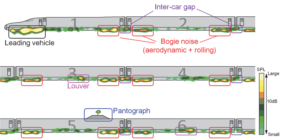 A A A Volume : 44 Part : 2 Sound source distribution of high-speed trains and reduction of aerodynamic bogie noise Toki Uda 1 Railway Technical Research Institute 2-8-38 Hikari-cho, Kokubunji-shi, Tokyo, 185-8540 Japan Mariko Akutsu 2 Railway Technical Research Institute 2-8-38 Hikari-cho, Kokubunji-shi, Tokyo, 185-8540 Japan Tsugutoshi Kawaguchi 3 Railway Technical Research Institute 2-8-38 Hikari-cho, Kokubunji-shi, Tokyo, 185-8540 Japan Yukie Ogata 4 Railway Technical Research Institute 2-8-38 Hikari-cho, Kokubunji-shi, Tokyo, 185-8540 Japan ABSTRACT The distribution of noise sources around a Japanese Shinkansen train was measured using a micro- phone array. By applying a deconvolution method to improve the spatial resolution of the microphone array signal processing, it was found that the main aerodynamic noise sources of the entire train distribute in the lower part of the leading vehicle, the pantographs, the bogies, and the inter-car gaps. Wind tunnel tests were conducted to verify measures for reducing aerodynamic noise generated from the bogie section. It was found that the combination of noise insulation measures by flat undercover and cavity noise reduction measures by rounding the corners of the cavity can reduce the bogie- section aerodynamic noise by approximately 3 dB. 1. INTRODUCTIONWayside noise is one of the most important issues in a railway environment. The Japanese high-speed trains known as Shinkansen are subject to the environmental noise standard, 70 dB in residential areas and 75 dB in commercial and industrial areas (both at the maximum A-weighted level with time- weighting S). The evaluation point is usually 25 m away from the nearest track. Railroad operators apply various noise reduction techniques, such as noise barrier, to vehicles and ground equipment to1 uda.toki.92@rtri.or.jp 2 akutsu.mariko.82@rtri.or.jp 3 kawaguchi.tsugutoshi.00@rtri.or.jp 4 ogata.yukie.96@rtri.or.jp‘linter.noise 21-24 AUGUST SCOTTISH EVENT CAMPUS ‘GLASGOW comply with this environmental noise standard. In general, vehicle improvement is less expensive, so the priority is to consider techniques applied to the vehicle side. In considering noise reduction measures for the train vehicle, it is necessary to understand the contribution of each noise source to the total noise level and to reduce larger noise sources. Here, a noise prediction model is proposed for a Japanese Shinkansen that places four sources around the vehicle and structure, as shown in Figure 1 (left). With this model, the contribution of each sound source is estimated at 320 km/h [1], as shown in Figure 1 (right). The blue color in the figure indicates aerodynamic noise, and the green color indicates rolling noise. The contribution of aerodynamic noise reaches 60% of the total noise at 320 km/h and approximately 70% at 360 km/h. This is because the power of aerodynamic noise generated from bogies and pantographs is proportional to the 6th power of the train speed, while the power of rolling and bridge noise is proportional to the 2nd to 3rd power of the train speed; the impact of aerodynamic noise on wayside noise increases at high-speed. There- fore, reducing the aerodynamic noise of vehicle is necessary, which is investigated by verifying low- noise measures using wind tunnel experiments.(b) Figure 1: (a) Noise source model of a Shinkansen. (b) Predicted contribution ratio of noise sources for a train running at 320 km/h on the wayside total noise at 25-m away from the nearest track with noise barrier of R.L.+2 m. 2. NOISE SOURCE IDENTIFICATION BY FIELD TESTvara noise = oN -_ Upper-part — aerodynamic noise peter te Lower-part aerodynamic noise \ Rolling noise Bridge noise(a)To reduce the noise level of vehicle, it is necessary to determine the noise source distribution, which indicates the levels and locations of sound sources. The Railway Technical Research Institute (RTRI) has designed and fabricated a two-dimensional microphone array that is portable and easy to install in a variety of field conditions. This section describes the details of this array.2.1. Microphone Array Design Concept A two-dimensional microphone array was designed and fabricated. As shown in Figure 2, the array has 72 microphones (GRASS 40PH) arranged on a plane to enable two-dimensional noise source identification and is circular with an outer diameter of 3 m and an inner diameter of 0.6 m. Eight microphones are arranged at equal intervals from the center in the radial direction along nine spiral arms from the inner circle (multi-arm spiral array [2]). The array consists of six sections, making it possible to install the array in a limited space and at various field locations. The microphone cables are bundled with LEMO cables and input into a data recorder (TEAC WX-7096). The passing train speed was determined using a ground vibration meter by autocorrelation analysis of the vibration acceleration level. The error of speed calculation by this method was approximately within 0.3%. Optical sensors detected the position of the train.2.2. Microphone Array Directivity Characteristics Fixing the outer diameter and the number of microphones, array simulations were performed by changing parameters such as the inner diameter, the number of spiral arms, and the spiral angle. TheBridge noise Pantographs Upper-part aerodynamic Rolling noise noise Lower-part aerodynamic noise array performance was evaluated with the maximum sidelobe level for the directivity characteristics and spatial resolution in the 250 Hz to 6.3 kHz band as shown in Figure 3. The blue lines show the directivity characteristics along the y = 0 line, and the orange lines show the maximum level along with concentric circles from the array center. The spatial resolution width (3 dB per side) at 500 Hz is approximately 2 m and at 1kHz it is approximately 1 m, indicating that the system can separate sound sources near the front and rear axles of a bogie (2500 mm).Center of the rail 3400