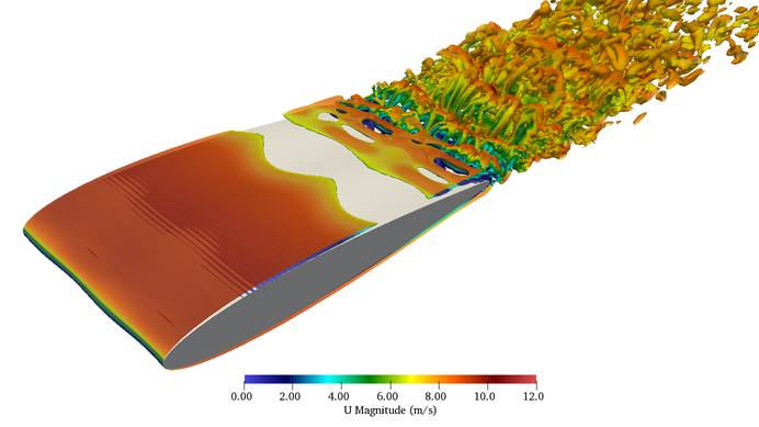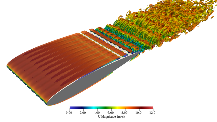A A A Volume : 44 Part : 2 Application of wavy geometries for reducing trailing edge instability noiseTom A. Smith 1Dept. Mechanical Engineering, University College London Gower Street, London, WC1E 7JE, United KingdomYiannis Ventikos 2Dept. Mechanical Engineering, University College London Gower Street, London, WC1E 7JE, United KingdomABSTRACT Trailing edge noise from lifting surfaces occurs across a wide range of applications, and there is a clear desire to reduce it. At moderate Reynolds numbers, high amplitude instability noise can occur where instability waves in the boundary layer are amplified close to the trailing edge before they scatter as acoustic waves. In this work, aero-acoustic simulations are conducted to demonstrate how wavy wings can be used to reduce trailing edge noise at moderate Reynolds numbers. The simulations are conducted using a hybrid aero-acoustic model, where large eddy simulations are used to compute the acoustic source terms for the acoustic perturbation equations. Wavy wings with di ff erent wavelengths are considered to understand how this a ff ects the sound levels. The results show that modest reductions of 4 dB are achieved for wings with a spanwise sinusoidal variation but a substantial reduction of nearly 18 dB is achieved for a wing with a more random spanwise variation. It is further shown that the wavy wings can reduce the drag compared to a smooth wing for the operating condition considered. These preliminary results show that a wavy wing has substantial potential to reduce noise and drag and this warrants further investigation.1. INTRODUCTIONTrailing edge instability noise commonly occurs for wings and other lifting bodies operating at moderate Reynolds numbers, when the boundary layer on at least one side is transitional. In the presence of a small separated region immediately upstream of the trailing edge, Tollmien-Schlichting (T-S) instability waves in the boundary layer can be amplified, before scattering as acoustic waves of the same frequency. The phenomenon has been studied for many decades, and a wealth of research can be found on the underlying physical mechanisms, as well as methods for predicting the frequencies of the noise based on analytical or semi-empirical methods [1–6].1 tom.smith.17@ucl.ac.uk2 y.ventikos@ucl.ac.uka slaty. inter.noise 21-24 AUGUST SCOTTISH EVENT CAMPUS O ¥, ? GLASGOW Due to the high amplitude of this type of noise and its prevalence in a number of practical applications including wind turbine blades, numerous e ff orts have been made to reduce it. Serrated edges [7–10], porous edges and surfaces [11–13], and also surface ridges [14] have been considered. Serrated edges work by breaking up the coherent tubular vortices associated with the T-S waves, thus reducing the spanwise correlation. Furthermore, they can act to prevent or reduce the separated region upstream of the trailing edge. Porous edges and surfaces can also act to reduce the correlation of a transitional or turbulent boundary layer, as well as reducing the convection velocity inside the boundary layer. Inspired by natural geometries, a wing with surface ridges and trailing edge serrations [14] was found to produce significantly less noise than a smooth wing, but with a small increase in the drag. This represents a challenge when trying to reduce noise, as many techniques to reduce instability noise will increase the drag. Indeed, one of the easiest ways to remove instability noise is to force the boundary layer to transition to turbulence before it reaches the trailing edge. This has been shown to be highly e ff ective at reducing the sound pressure level, but it reduces the wing performance by increasing the drag [15].Therefore, there is a desire to develop geometries that have a superior acoustic performance but without an increase in drag. To this end, a wavy wing has a number of potential benefits. Firstly, it can reduce the spanwise correlation of the flow as shown by [14], thus reducing the trailing edge noise. Secondly, if leading edge noise is present, there is the potential for the wavy surface to reduce the noise produced by turbulence scattering at the leading edge, as demonstrated by [16,17]. Riblets and grooves inspired by shark skin have been used to reduce drag from turbulent boundary layers [18] and these share similarities with surface waves. It therefore seems possible that a wing incorporating surface waves or riblets might be developed that exhibits a superior acoustic characteristics without any degradation in performance in terms of lift and drag. Such a geometry could be used in a wide range of applications, including wind turbines, marine propellers, and other areas where lifting body noise is problematic.In this work, a hybrid aero-acoustic model [19] is used to investigate the trailing edge noise produced by a series of wavy wings at a Reynolds number of Re = 64000 and an angle of attack of α = 1 ◦ . Large eddy simulations are coupled with the acoustic perturbation equations to obtain the far-field acoustic pressure resulting from the flow over each wing. Alongside the standard NACA0012 wing, four variants are considered which have spanwise sinusoidal variations. The first three variants have a spanwise wave with a single frequency whereas the fourth has a wave consisting of the sum of two sine waves to create a more random variation in the surface geometry. The heights of the surface waves are small relative to the geometry, at 4% of the maximum wing thickness. This is to investigate whether or not a spanwise variation can be e ff ective at reducing the noise without inducing a premature transition of the boundary layer. Whilst this would reduce the noise due to turbulent boundary layers being less e ffi cient acoustic sources than transitional ones [20], it would also lead to a sharp increase in drag.Validation of the overall method, as well as for the far-field noise for the smooth foil at Re = 64000 can be fo