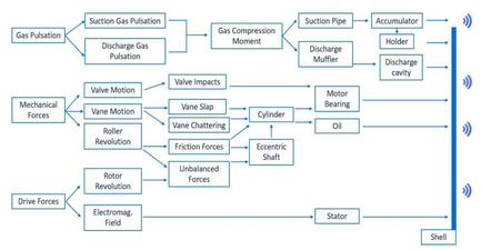 A A A Volume : 44 Part : 2 Analysis of high frequency noise sources on air conditioning variable speed compressors Vitor Almeida 1 Tecumseh do Brasil LTDA Rua Cel Augusto de Oliveira Salles, 478, São Carlos Osmar Pinheiro 2 Tecumseh do Brasil LTDA Rua Cel Augusto de Oliveira Salles, 478, São CarlosABSTRACTThe improvement on energy consumption requires application of new technologies in existing products. On the past decades, optimization of power consumption on variable speed rotary compressors for air conditioning applications was achieved by replacing induction mo- tors to permanent magnets (PM) motors driven by a frequency inverter. Besides the positive impact of improving the compressor efficiency changing the electric motor type, the acoustic problems on the compressor became more complex. This article makes a revision of the main noise generation mechanism by PM motors of an air conditioning compressor via numerical finite element and experimental analysis aiming a noise reduction on a tonal component around 8 kHz band. Results indicate harmonic components on the forces exciting some specific reso- nance frequencies of the stator. The harmonic components show up in the force signals via pulse width modulation of the electronic controller. The structure-born noise is radiated through the compressor shell. Among the possibilities to mitigate the noise issues, it was chosen to optimize the electronic control, reducing the excitation levels of the stator and the tonal component of 8 kHz band in about 10 dB improving the sound quality of the compressor.1. INTRODUCTIONEnergy saving have always been a concern on refrigeration industry. On the past decades, the inverter technology based on the variable speed compressors shows up as an efficient solution on refrigeration industry. By an electronic inverter this technology converts the household AC power supply current, with fixed frequency of 50Hz or 60Hz, to a DC current and using a pulse width mod- ulation (PWM), then the inverter generates an AC in a specific frequency [1]. On this design, to apply the inverter technology, the usual induction motors of the compressors are replaced to Permanent Magnet Synchronous Motor (PMSM) based on Interior Permanent Magnets (IPM).On air conditioning devices, the major amount of energy consumption is due to the rotary compressor. The application of variable speed technology makes possible to vary the rotation of the compressor from low rpms until high speeds, such as 7000 rpms. The electronic controller changes the compressor speed according to the thermal loads, prioritizing low rotations, regions in which the1 vitor.almeida@tecumseh.com2 osmar.pinehiro@tecumseh.comworm 2022 compressor is more efficient. On the other hand, in household appliances, the noise levels generated is a key point for the final customer, making the noise characteristics of the product so important as the energy consumption. Thus, the project of a rotary compressor must aim both characteristics: en- ergy consumption and noise levels.Besides the several advantages of IPM motors, this type of motor has more possible noise sources than other motor types, being a set of excitations straightly attached to the compressor shell and other compressor parts [2] [3].This paper brings a case study of an inverter rotary compressor with accentuated noise level on 8 kHz band. Starting from the characterization of the issue and contextualization to theoretical background of electromagnetic noise sources, this paper maps the main noise and vibration transmis- sion paths of rotary compressors. Numerical finite element method (FEM) and experimental data provides guidelines to a deep understanding of the noise source around a frequency of 8 kHz, sup- porting several proposals to mitigate noise sources due electromagnetic phenomena.2. OVERVIEW OF NOISE ISSUEDuring the development of a new rotary variable speed compressor, it was noticed a tonal component in the third-octave band of 8 kHz. This unusual behavior hazards the sound quality of the product and is identified as an issue to be mitigated. Figure 1 shows the sound power levels measured according to ISO3744 standard. Although the middle frequency (between 800 Hz to 1600 Hz) has similar levels compared to 8 kHz band, the tonal behavior of the last one is a key point for product quality.worm 2022Figure 1: Sound power level of a rotary compressor. On the rotary compressor, the three main natures of noise sources which make the overall compressor noise are the gas pulsation on the suction and discharge pipelines; the mechanical forces and moments which appear due the movement of the parts during the compression cycle; the driven forces of the motor due to the electromagnetic field on the stator. Figure 2 summarize the main noise generation path on the rotary compressor. Understanding the mechanism of noise generation is crucial on troubleshooting of noise, vibration, and harshness (NVH) issues.‘swt [2B] 108 PPPEPSORPEEPPEPIEPOEP Frequency) Figure 2: Noise generation path. Measurements of noise, vibration and suction and discharge pressure under different condi- tions point to a problem related to the compressor motor. 3. THEORETICAL BACKGROUNDworm 2022The noise sources on IPM motors can be divided in three types: (a) Cogging Torque; (b) Rip- ples of mutual and reluctance torque; (c) Fluctuations of radial magnetic attractive forces between rotor and stator.3.1. Electromagnetic ForcesThe electromagnetic forces on an IPM motor can be calculated by the Maxwell stress tensor method [4]. The time and angle dependence of the forces and flux densities (t, α) are suppressed for the sake of notation.𝑓 𝑟 = 12 − 𝐵 𝜃2 ൯ ,൫𝐵 𝑟(1)2 𝜇 0𝑓 𝜃 = 𝐵 𝑟 𝐵 𝜃,(2)𝜇 0where 𝑓 𝑟 and 𝑓 𝜃 are the radial and tangential forces, B r and B θ are the radial and tangential flux den- sities and µ 0 the permeability of free space. The radial forces take more attention 