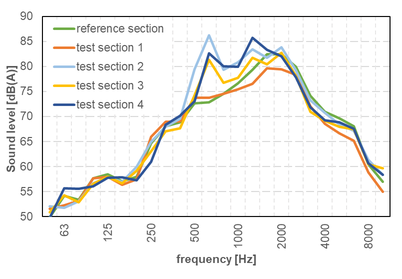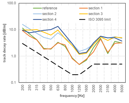A A A Volume : 44 Part : 2 Acoustical properties of alternative sleepers: experimental testing Wout Schwanen 1 M+P consulting engineers Vught, The Netherlands Nils Yntema 2 ProRail Utrecht, The NetherlandsABSTRACT ProRail, the Dutch infrastructure manager , started a project to test alternative, sustainable, sleepers. A test setup was achieved along the line from Zwolle to Heino in the Netherlands, where six test sections were constructed. Two reference sections with standard concrete sleepers and four sections with alternative sleepers. For one day we performed simultaneous sound pass-by measurements at the six test sections. In addition, we measured the rail roughness and the track decay rate of each test section. The results clearly show that an alternative sleeper influences the track decay rate of the track. This difference in track decay rate leads to different pass-by sound levels. This paper shows the results of the experiments.1. INTRODUCTIONProRail, the Dutch infrastructure manager, started a project to test, alternative, sustainable sleepers. Therefore, a test set up was achieved with six test sections next to each other. The goal of the research is to gain insight in the performance of the alternative sleepers in comparison with the standard concrete sleepers with respect to CO 2 -emission, vibrations and sound emission. The goal of the current research is to determine the effect of the sleeper on the rolling noise. Therefore, pass-by measurements are performed simultaneously at all test sections. In addition, we measured the rail roughness and the track decay rate at each test section.3. TEST LOCATIONThe test location is situated in the northeastern part of the Netherlands. The location has a single track, with trains running in both directions. The location consists of six test sections: two reference sections and four sections with the alternative sleepers. The reference sections consist of the standard concrete sleepers. The four other sections consist of alternative sleepers with different materials and/or different geometry. Each test section has a length of 100 meters. Pictures of the alternative sleepers are shown in figure 1.1 WoutSchwanen@mp.nl 2 Nils.Yntema@prorail.nl Figure 1: The alternative sleepers under testing 4 TRACK PROPERTIES4.1. Rail roughness At each section the rail roughness was measured according to the method in EN 15610 [1]. The resulting rail roughness spectra are shown in the figure below. As a reference, also the Dutch average rail roughness [4] is depicted. The results reveal small differences in rail roughness levels between the various sections.Figure 2: Rail roughness levels of the six sections. As a reference also the Dutch average rail roughness (‘NL-avg’) is depicted20 roughnesslovel [4B re tym] section 1 —section 2 —seation 3 section 4 —section 0 (reference) — section 5 (reference) — Ntaw 16 8 4 2 wavelength fom] 1 0s 0.28 The results of the sound measurements will be corrected for the difference in roughness levels between the section according to the procedure in the Dutch calculation scheme. There is a direct spectral relationship between the combined wheel and rail roughness on one hand and the change in noise emission on the other hand.𝛥𝐿 𝑝,𝑖 = (𝐿 𝑟,track,𝑖 ⊕𝐿 𝑟,vehicle,𝑖 ) −(𝐿 𝑟,track,average,𝑖 ⊕𝐿 𝑟,vehicle,𝑖 ) , (1)with ΔL p as the noise emission change between test track and average track, L r ,vehicle as the wheel roughness level, L r ,track as the rail roughness level, ⊕ denoting energetic summation, and i denoting a certain frequency band. Since roughness is usually known as a function of wavelength λ and noise level difference is expressed as a function of frequency f , a spectral transformation f i = v/ λ is made, which depends on vehicle speed v . In this case the L r ,track,average is the Dutch average roughness. The assumed wheel roughness is taken from the national noise impact calculation method.4.2. Track decay rate For each test section we determined the track decay rate in vertical and transversal direction according to EN 15461+A1:2011 [2]. The track decay rate was measured on both rails and the results were averaged arithmetically. The figures below depict the track decay rate in vertical and lateral direction for each section. The results for section 0 and section 5 are averaged, labelled as reference. Also depicted is the limit curve from the ISO 3095 standard [3].Figure 3: Track decay rate in vertical direction for the alternative sleeperstrack decay rate [dB/m] 100.0 10.0 aaen aus eens tn ae ee a Soest 1 2288888888882 88 frequency [Hz] Figure 4: Track decay rate in lateral direction for the alternative sleepers In general, we can conclude that all sections are well damped as the track decay rate is above the ISO limit values for almost all sections. Only sections 2 and 4 have a track decay rate below the limit value in vertical direction for 400 and 500 Hz. However, the results also show clear differences in track decay rates for the various sleeper types in both directions. The track decay rate for section 1 is almost equal to the track decay rate of the reference. For sections 2 to 4 the track decay rate in vertical direction is lower than the track decay rate of the reference except for the higher frequencies. On the other hand, in lateral direction, we observe that the track decay rate of section 2 to 4 is higher than the track decay rate of the reference for the whole frequency range. 5. SOUND MEASUREMENTS5.1. Test setup We performed pass-by measurements to determine the noise reduction of the alternative sleepers. Microphones were placed at 5m from the center of the track at a height of 1.2m. During each pass- by we recorded the A-weighted sound level in third octave bands, the vehicle speed, the vehicle type and the number of cars. A total of eleven pass-bys of passenger trains were recorded. The trains drove in both directions with 