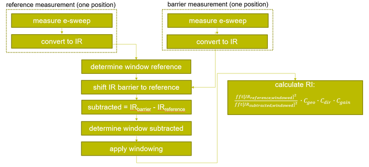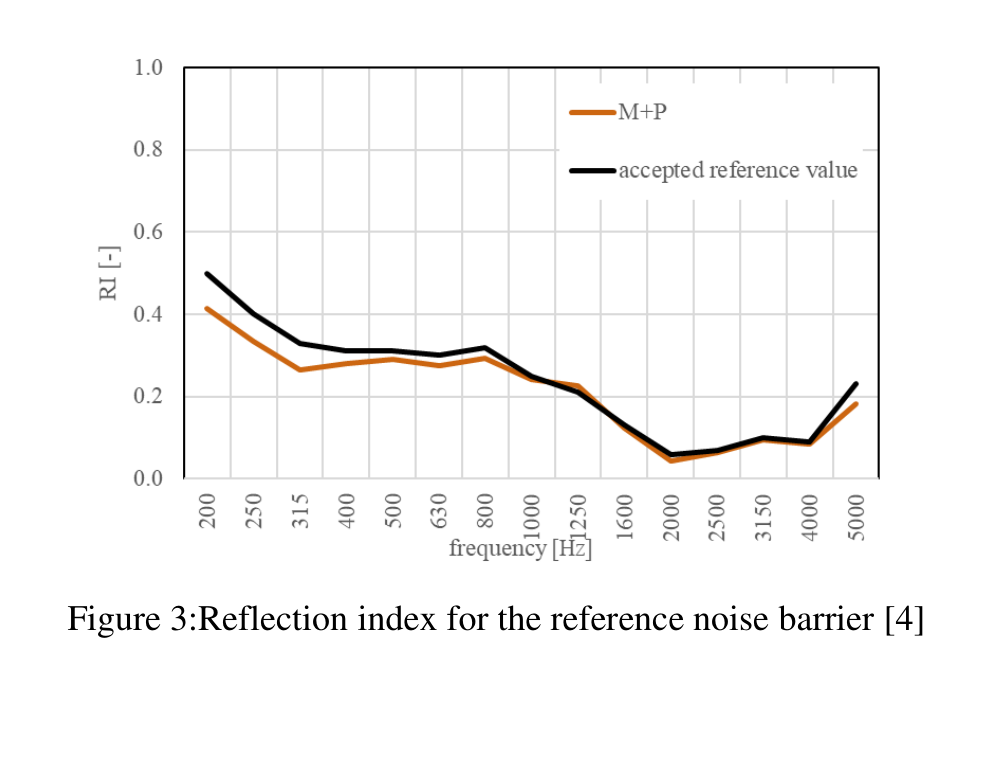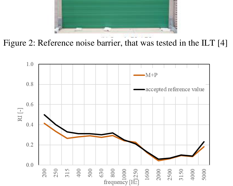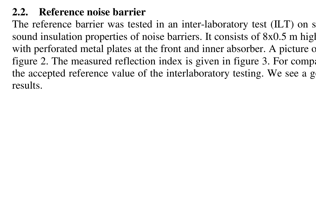 A A A Volume : 44 Part : 2 Application of sound absorption measurements according to EN 1793-5 on gabion walls Wout Schwanen 1 M+P consulting engineers Vught, the Netherlands WillemJan van Vliet 2 Rijkswaterstaat Grote Projecten en Onderhoud Utrecht, the NetherlandsABSTRACT The standard EN 1793-5 describes a method to determine the sound reflection index of road traffic noise reducing devices under direct sound field conditions in-situ. The method is commonly used to assess the intrinsic characteristics of conventional, absorptive noise barriers and yields results with a limited measurement uncertainty. Recently, the sound reflection index of a gabion wall was determined by means of the in-situ measurement method leading to unexpected results. An in-depth analysis was made of the results of the in-situ measurements on a conventional noise barrier and on a gabion wall. The main conclusion of this comparison is that application of the in-situ method on a gabion wall has a much higher measurement uncertainty than to be expected.1. INTRODUCTIONThe European standard EN 1793-5 describes a measurement method to determine the sound reflection of noise barriers in-situ. An array of nine microphones is used to measure incoming and reflected sound waves emitted by an external sound source. The amount of energy that is reflected from the barrier is a measure of the absorptive properties of a noise barrier. A filtering technique based on the expected path lengths of parasitic reflections (like ground reflections and reflections from other objects) in the impulse response domain is used to isolate the reflections from the barrier under test. For simple barrier geometries, the expected path lengths can be calculated easily. When measuring more complex geometries, like Gabion walls, these calculations become more complex. Gabion walls are typically composed of a solid concrete core, surrounded by a metal grid filled with stones of different sizes. In this case, the effective distance of the microphone array to the barrier can be largely frequency dependent. Low frequencies sound waves are expected to not be very much impacted by the stones, while higher frequencies waves are expected to scatter due to the stones. 2. CURRENT RESEARCHM+P has been using the EN 1793-5 method for over five years now to measure the absorptive properties of noise barriers [2], [3]. We have participated in the inter laboratory test in 2018, organized1 WoutSchwanen@mp.nl 2 WillemJan.Van.Vliet@rws.nl; by the Austrian Institute of Technology (AIT). The current research compares the results of the various analysis steps of a simple absorptive barrier with a gabion wall and illustrate the difficulties that may arise when analyzing the results of measurements on a gabion wall. 3. DESCRIPTION OF THE NOISE BARRIERS3.1. Gabion wall The gabion wall under testing is located along the railway track in the southwest of the Netherlands. It has a height of 3.5 meters and a thickness of approximately 1 meter. Inside the noise barrier a solid core of 20 cm thickness is present to improve the insulation of the gabion wall. The gabion is filled with rubble. Figure 1 shows several pictures of the gabion wall.Figure 1: Gabion wall under testing2.2. Reference noise barrier The reference barrier was tested in an inter-laboratory test (ILT) on sound reflection and airborne sound insulation properties of noise barriers. It consists of 8x0.5 m high stacked aluminum cassettes with perforated metal plates at the front and inner absorber. A picture of the noise barrier is given in figure 2. The measured reflection index is given in figure 3. For comparison this graph also depicts the accepted reference value of the interlaboratory testing. We see a good agreement between both results. Figure 2: Reference noise barrier, that was tested in the ILT [4]Figure 3:Reflection index for the reference noise barrier [4]4. SOUND REFLECTION INDEX MEASUREMENTS4.1. General principle The EN 1793-5 standard describes the method how to determine the sound reflection index in-situ. A simplified version of the process is schematically represented in the figure below.ee os accepted reference value frequensy (12) Figure 4: Schematic representation of the method for in-situ determination of the reflection indexaccording to EN 1793-5 A sound source emits a transient sound wave that travels past the measurement grid (microphone) position to the device under test and is then reflected. Each microphone that is placed between the sound source and the device under test receives both the direct sound pressure wave travelling from the sound source to the device under test and the sound pressure wave reflected (including scattering) by the device under test. The direct sound pressure wave can be better acquired with a separate free field measurement (reference measurement). The power spectra of the direct and the reflected components provides the basis for calculating the sound reflection index.4.2. Calculation of impulse response The sound source emits an exponential sine sweep (e-sweep), which is later converted into an impulse response. Paragraph 5.4.2 of EN 1793-5 states that the sound source should have a smooth magnitude of the frequency response without sharp irregularities throughout the measurement frequency range, resulting in an impulse response under free-field conditions with a length not greater than 3 ms. Therefore, we calculated the amount of energy within 3 ms in comparison to the total amount of energy for microphone 5. For both the reference noise barrier and the gabion wall 99.9% of the total energy is within 3 ms.Figure 5: Impulse response under free-field conditions. Left: Reference noise barrier. Right: Gabionwallmeasure e-sweep convert to IR determine window reference measure e-sweep convert to IR shift IR barrier to reference subtracted = IRparier ~ !Rreterence determine window subtracted apply windowing calculate RI: 4.3. Window placement and subtraction techniq