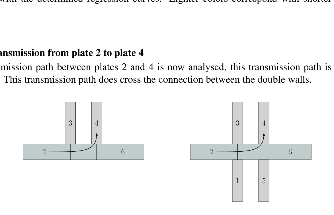 A A A Volume : 44 Part : 2 Prediction of vibration transmission across finite double wall junctions using a hybrid di ff use-deterministic approachWannes Stalmans 1 , Cédric Van hoorickx 2 and Edwin Reynders 3KU Leuven Kasteelpark Arenberg 40, 3001 Leuven, BelgiumABSTRACT Predicting the sound insulation between two rooms is a complex problem since not only the direct path through the separating element but also the flanking transmission paths can largely influence the sound insulation of the system. An important parameter for calculating flanking transmission is the vibration reduction index, which relates to the transmission coe ffi cient between the connected plates. The international building acoustics standard ISO 12354-1 / 2 provides prediction formulas for the vibration reduction index of single wall junctions, but not for double wall junctions. A new hybrid di ff use-deterministic approach is proposed to calculate flanking transmission across double wall junctions. The walls and floors are modelled as di ff use subsystems while the connection between the double wall is modelled deterministically. In the derivation of the transmission coe ffi cient between two di ff use subsystems, the di ff use field reciprocity relationship is employed, such that the finite size and structural details of the junction are taken into account. The di ff use field reciprocity relationship relates the vibration transmission to the direct field dynamic sti ff ness of the di ff use subsystems (walls and floors), i.e., the dynamic sti ff ness of the equivalent infinite subsystem as observed at the junction. The new approach is applied to di ff erent types of double wall junctions to determine simplified regression formulas for practical sound insulation design.1. INTRODUCTIONE ff ective protection from noise disturbance can be achieved by ensuring su ffi cient sound insulation in buildings. Unfortunately, this is a complex technical problem, since design details and multiple transmission paths can strongly influence the sound insulation [1]. Both the direct transmission through the element (partition wall or floor) as well as flanking transmission impacts the overall sound insulation between two rooms. In the international building acoustics standard ISO 12354-1 / 2, the vibration reduction index is used to take into account flanking transmission in the sound insulation of a system. For single wall junctions, the standard provides empirical formulas based on the surface mass ratio of the walls and / or floors as well as regression formulas determined by finite element simulations which are based on the1 wannes.stalmans@kuleuven.be2 cedric.vanhoorickx@kuleuven.be3 edwin.reynders@kuleuven.bea slaty. inter.noise 21-24 AUGUST SCOTTISH EVENT CAMPUS O ¥, ? GLASGOW ratio of bending impedances of the walls and / or floors. For double wall junctions, no such formulas are provided in the international building acoustics standard. In previous work done by Dijckmans [2] vibration transmission across double walls is calculated using wave theory. The walls, floors and connecting junction are modelled analytically using thin plate theory while the junction in assumed to be of infinite extend. Vibration transmission across the double wall junction is calculated by integrating the plane-wave transmission over all possible angles of incidence. Poblet-Puig and Guigou-Carter applied spectral finite elements to calculate vibration transmission across di ff erent types of finite junctions [3]. Amongst the di ff erent types of junctions, a set of double wall H-junctions is calculated and from these results regression formulas are determined for the vibration reduction index. A new hybrid di ff use-deterministic approach is proposed here to e ffi ciently calculate flanking transmission across double wall junctions while accounting for the finite length of the junction. With this new approach, the walls and / or floors are modelled as di ff use subsystems while the connection between the double wall junctions is modelled deterministically. This new approach is based on the the di ff use field reciprocity relationship which relates the blocked reverberant forces in a a vibrating subsystem at the junction to the direct field dynamic sti ff ness [4], i.e., the dynamic sti ff ness of the equivalent unbounded subsystem as observed at the finite junction. The direct field dynamic sti ff ness matrices in the wavenumber domain can be analytically derived for thin, isotropic, semi-infinite plates, as described by Langley and Heron [5]. A correction for ba ffl ed boundary conditions is used to transform these results to the spatial domain while taking into account the finite length of the junction [6]. Shell finite elements are used to model the connection between the double walls. In the presented work, this new approach is used to determine the structural transmission loss between the walls and floors of double wall junctions since the transmission loss can easily be related to the vibration reduction index. A set of double wall junctions is simulated to investigate the influence of di ff erent parameters on the transmission loss of di ff erent transmission paths while also determining regression formulas for practical sound insulation design.2. METHODOLOGY2.1. Determination of the vibration reduction index Two types of double wall junctions are considered in the presented work, Π - and H-junctions, as shown in figure 1. The junctions have a finite junction length L .4 34 3LL26 265 1Figure 1: Π - and H-junction.To take into account flanking transmission in the sound insulation of a system, the direction averaged vibration reduction index is used in the international standard ISO 12354-1 / 2, which is defined here as follows [7]:K jl = 1 R s , jl + R s , l j (1)2 in which R s , jl is the structural transmission loss between plates j and l . The structural transmission loss can be calculated based on the di ff use field transmission c