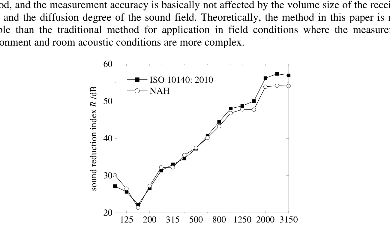 A A A Volume : 44 Part : 2 Measurement of airborne sound insulation of building components by near-field acoustic holography Wei Xiong 1 School of Architecture, South China University of Technology 381 Wushan Road, Tianhe District, Guangzhou City, Guangdong Province, China Hongwei Wang 2 School of Architecture, South China University of Technology 381 Wushan Road, Tianhe District, Guangzhou City, Guangdong Province, China Guangyao Zhang 3 School of Architecture, South China University of Technology 381 Wushan Road, Tianhe District, Guangzhou City, Guangdong Province, ChinaABSTRACT A new method of sound insulation measurement of building components based on near-field acoustic holography is proposed in the paper. First, multi-channel measurements are performed at the near- field position of the member using a microphone array, and the measured holographic surface complex sound pressure is reconstructed by a spatial sound field transformation algorithm to find the normal sound intensity distribution on the surface of the member. Then, a window function is applied in the wave number domain to separate the propagating and swift waves to obtain the normal sound intensity distribution of the propagating waves on the surface of the component, and then calculate the magnitude of the sound power radiated from the component to the receiving room; finally, the radiated sound power of the component is converted to the incident sound power of the source room to obtain the frequency characteristics of the airborne sound insulation of the component, and the sound insulation defects of the component are detected based on the acoustic image. The basic principle of the near-field acoustic holographic sound insulation measurement method is explained in the paper, and the accuracy and validity of the method are verified through experiments.1. INTRODUCTIONAirborne sound insulation is an important parameter that reflects the ability and characteristics of building components to isolate noise transmission. Accurate field measurement of airborne sound insulation can be more scientifically, reasonably and intuitively evaluated for the actual application of the components, which is of great importance in noise control and acoustic design. The current widely used sound insulation measurement methods, such as those based on sound pressure1 973136186@qq.com 2 578084450@qq.com 3 545666085@qq.com measurement and sound intensity measurement, have been relatively mature and have formed relevant measurement standards [1-3]. However, the application of traditional sound insulation measurement methods in practical engineering is still subject to many limitations due to the complexity of sound radiation from on-site structural vibration, the instability of the test environment, and the increasing test requirements. How to quickly and accurately measure sound insulation in the field has been a hot issue for research in the field of building acoustics.Near-field acoustic holography (NAH) is one of the sound field visualization techniques based on multichannel simultaneous measurement and processing, which can calculate acoustic quantities at arbitrary field points throughout space from holographic data (sound pressure or particle velocity) measured in the near field, as well as reconstruct the sound field distribution on the surface of the vibrating source [4-5]. Currently, the NAH technique has been widely used in the fields of noise source identification [6-7], mechanical fault diagnosis [8-9], and sound field visualization [10-11], but it has rarely been applied in the sound insulation measurement of building components. In recent years, some scholars have initially explored the feasibility of applying NAH technology to sound insulation measurements through experimental studies, and certain results have been achieved [12- 13]. According to the principle of sound insulation testing, the test member is excited by the diffuse sound field in the source chamber and vibrates, and then radiates sound energy to the receiving chamber and forms the corresponding sound field distribution in space. If the complex sound pressure distribution is measured in the near field of the component, and then the spatial sound field transformation algorithm of NAH is applied to the reconstruction of the radiated sound field of the component, then not only the magnitude of the sound power radiated to the receiving chamber by the component can be calculated from the reconstructed normal sound intensity, but also the comprehensive and subtle features related to sound leakage can be extracted from the acoustic image of the surface of the component, so that the sound insulation frequency characteristics and the location of sound insulation defects of the test component can be determined In addition, the NAH technique has the advantage of being multi-functional. In addition, NAH technology also has the advantages of multi-channel measurement, background noise suppression and sound field visualization. According to the above characteristics, NAH technology has a large application prospect in the field measurement of sound insulation. Therefore, it is necessary to conduct an in-depth study of this sound insulation test method.This study proposes the application of NAH technique to measure the sound insulation characteristics of building components. Its main contributions are the application of the spatial sound field transformation algorithm of NAH to the reconstruction of radiated sound power in sound insulation measurement and the application of the spatial distribution information of the sound field to the detection of sound insulation defects, and a new method of airborne sound insulation measurement of building components based on NAH theory is systematically proposed. In this study, a 16-channel microphone line array is used to experimentally validate the method for measuring sound insulation and detecting sound insulation defects.2. NAH-BASED SOUND