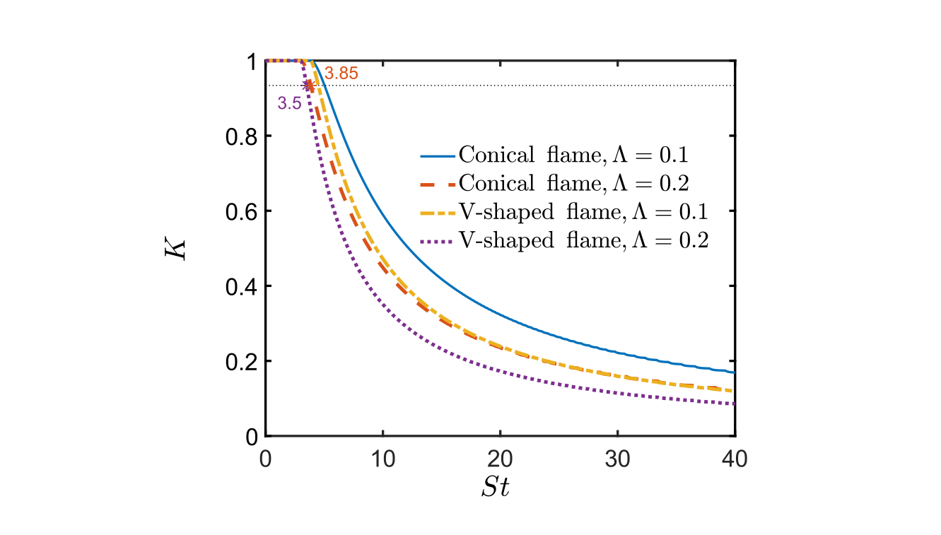 A A A Volume : 44 Part : 2 Nonlinear response of laminar premixed flames to dual-input harmonic disturbancesXiaozhen Jiang School of Astronautics, Beihang University Beijing 102206, ChinaJingxuan Li 1School of Astronautics, Beihang University Beijing 102206, China Aircraft and Propulsion Laboratory, Ningbo Institute of Technology, Beihang University Ningbo 315100, ChinaAimee S. Morgans Department of Mechanical Engineering, Imperial College London South Kensington Campus, London SW7 2AZ, UKLijun Yang School of Astronautics, Beihang University Beijing 102206, China Aircraft and Propulsion Laboratory, Ningbo Institute of Technology, Beihang University Ningbo 315100, ChinaABSTRACT The two-way interaction between the flame and acoustic waves leads to combustion instability. To understand and quantify the response of the flame to acoustic waves, studies have typically considered single-harmonic forcing of the flame, which assumes a dynamically linear or weakly nonlinear flame response. This study extends this approach by introducing an additional disturbance at the frequency S t 2 to influence the flame nonlinear response to the first perturbation at the frequency S t 1 to gain further insight into these associated combustion instabilities. The spatial front-tracking of premixed flames were derived from the analytical and numerical solutions of the G-equation model. The nonlinear behavior of flame response was presented and the related mechanism of that was also elucidated. Due to the flame propagating forward normal to itself, from the near-order asymptotic analysis point of view, the third-order nonlinear interaction of the additional and first perturbations induces an external flame response related to S t 1 . It significantly a ff ects the first fundamental frequency response of the flame.1 jingxuanli@buaa.edu.cna slaty. inter.noise 21-24 AUGUST SCOTTISH EVENT CAMPUS O ¥, ? GLASGOW 1. INTRODUCTIONHigh-thrust rocket engines, lean-combustion aero-engines and land-based gas turbines often su ff er from combustion instabilities, causing serious damage [1–4]. To predict combustion instability, it is key to understand the flame response to inflow perturbations [5, 6]. As a simpler alternative to experiments [7] and numerical simulations [8], the flame dynamic model based on the G -equation proposed by Markstein [9] for tracking infinitely thin flame fronts is able to to quantify the premixed laminar or weakly turbulent flame response to harmonic disturbances [5, 10–13]. However, the obtained results of most previous research were limited to the specific case where the flame is disturbed by a pure single harmonic disturbance. The nonlinear response of the the flame can be better characterised by consider perturbations with dual or even multiple harmonics. This phenomena have been confirmed from experimental observations [14–17] and results of numerical simulations [18–20]. In recent research, Han et al [21] numerically investigated the e ff ect of two perturbations at 160 Hz and 320 Hz on the flame nonlinear response and the interaction of a lean premixed flame forced externally by strong input velocity oscillations. The introduction of a higher harmonic significantly changes the heat release rate fluctuation; the level of flame response at the fundamental frequency is reduced by 70% compared to the flame response subjected to only a single frequency perturbation. However, these results are limited to the case that the second frequency is double the fundamental frequency. As shown in the experiments conducted by Lamraoui et al. [14], the second frequency in general is uncorrelated with the first one. Orchini and Juniper [11] presented the computation of a non-static flame dual-input description function (FDIDF) based on the G -equation in the case of a laminar conical flame. The results show that FDIDF improves the stability prediction, which predicts the onset of the Neimark-Sacker bifurcation and determines the frequency of oscillations around the unsteady limit cycle. It should be noticed that, Orchini and Juniper [11] treated the flame module as a “black box” embedded in the thermoacoustic network, which neglected the specific formation mechanism of the flame nonlinear response under two input perturbations. As mentioned above, the introduction of additional perturbation at the frequency S t 2 results in an interaction of the flame nonlinear response at S t 2 and the first perturbation frequency S t 1 . It significantly a ff ects the flame response at S t 1 . The objective of this work is to investigate how additional harmonic perturbations a ff ect the flame response at S t 1 and to further elucidate the corresponding mechanisms in a general case, where the frequency and magnitude of the additional perturbation are independent on those of the first one.2. FORMULATIONLaminar premixed conical and V-shaped flames considered in this work, and they are anchored on the burner rim as shown in figure 1 ( a ) and ( b ) respectively, The symmetrical flames are subjected to two velocity perturbations u ′ 1 and u ′ 2 with di ff erent frequencies. The flame front kinematics quantified based on the G -equation model is given by∂ G∂ t + u · ∇ G = S L |∇ G | (1)where, u and S L are respectively the local velocity vector and the laminar flame displacement speed. G is a level-set function, where G = 0 indicates the flame front separating the reactants ( G < 0) and products ( G > 0). Equation 1 is validated under following assumptions (it is similar to our previous researches [22,23]): (i) The flame front is infinity thin; (ii) The flame laminar displacement speed is assumed constant; (iii) The flow condition upstream of the flame is pre-defined; (iv) The flame front is considered as a single-value function of the spatial location. xx( ) , r t ( ) , r t rr1 u 2 u 1 u 2 u uu( a ) ( b )Figure 1: Schematic of ( a ) the conical flame and ( b ) the V-shaped flame subjected to dual-input ha