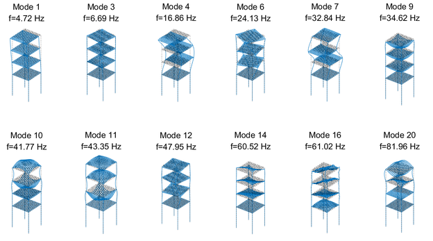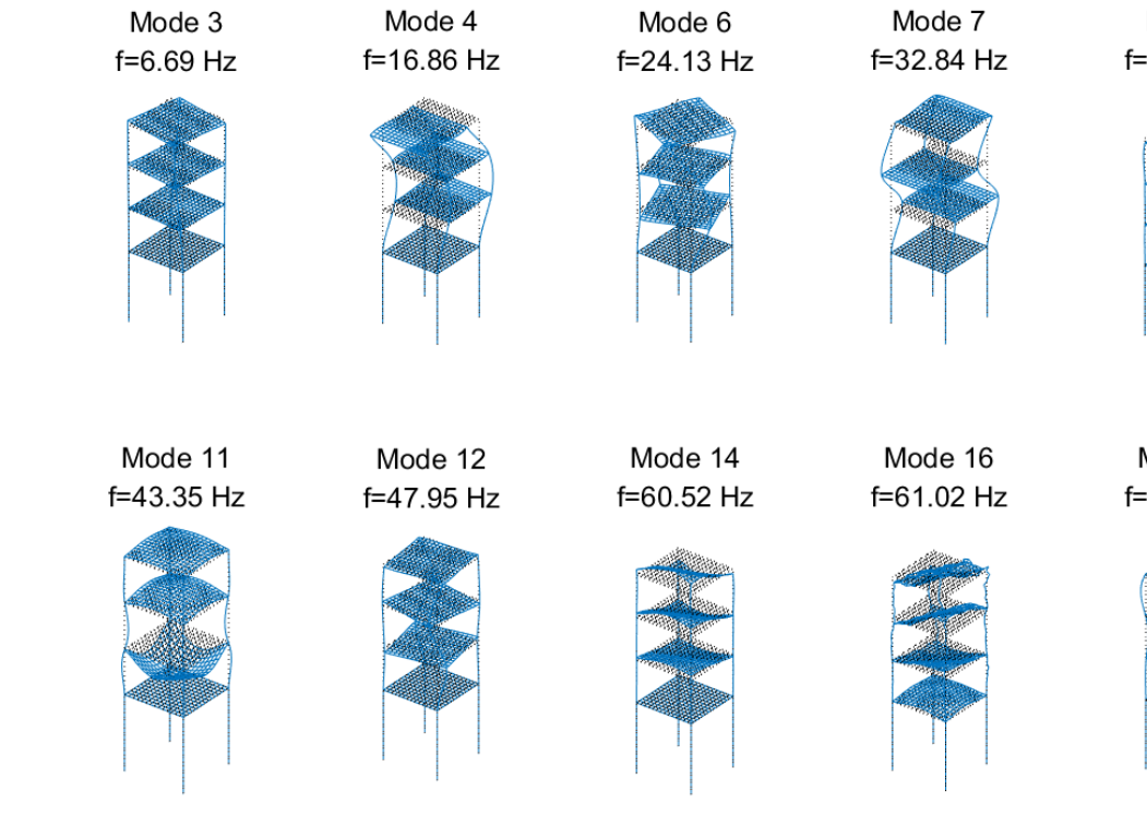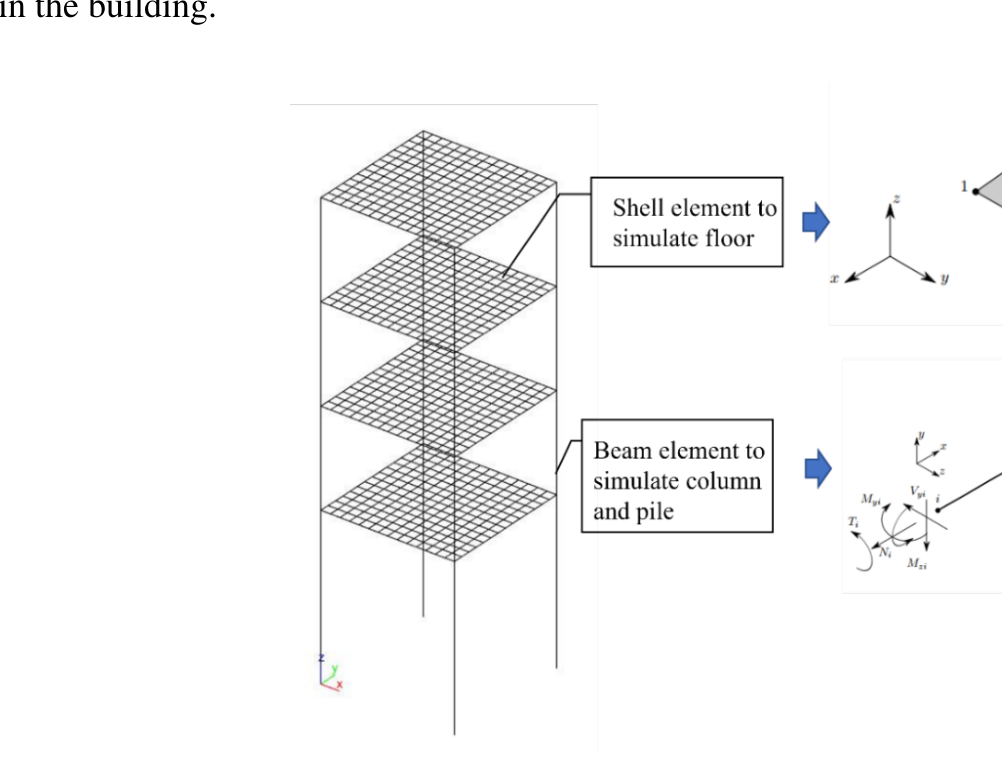 A A A Volume : 44 Part : 2 The influence of the modes of surrounding buildings on the ground vibration from railways Xiangyu Qu 1 , David Thompson, Evangelos Ntotsios and Giacomo Squicciarini Institute of Sound and Vibration Research, University of Southampton, University Road, Southampton, SO17 1BJ, UKABSTRACT To improve the accuracy of railway induced ground vibration predictions, the influence of surround- ing buildings should be considered. For this reason, a fast semi-analytical model is developed to investigate the vibration of the ground and the influence of a nearby building. The model contains two sub models: a finite element model which can simulate the building, and a semi-analytical model which can simulate the infinite free-field ground. The dynamic stiffness matrix method is used to simulate the ground as a homogeneous or layered half-space. The ground model works in the fre- quency-wavenumber domain and is based on the Green’s functions developed for a half-space. Fo- cusing on a building with a piled foundation, the coupling forces due to soil-structure interaction at coupled pile nodes are calculated assuming that the soil and pile displacements are identical. The results from the proposed model show that the vertical modes of the building, especially those that involve the vertical movement of the floors, can significantly influence the vibration of the surround- ing ground. The findings suggest that when predicting the ground surface response induced by the railway, the surrounding buildings and their vertical modes should be included in the calculations.1. INTRODUCTIONRailway-induced ground vibration in an urban environment is affected by the existence of the surrounding buildings between the load position and target building. Current prediction models for railway-induced vibration generally divide the problem into the vibration source, transmission path, and the receiver [1]. While the soil-structure interaction [2] and coupling loss [3] of the receiver structure are often considered, the transmission path is usually seen as the free field. In other words, the current prediction models neglect the effects of neighbouring structures. However, due to the soil- structure interaction, the vibration of the free field is affected by the vibration of the buildings. The effect of adjacent buildings should therefore be taken into account to increase the accuracy of railway- induced ground vibration predictions.In this study, a rapid semi-analytical model is built to analyse the effect of a neighbouring structure on train-induced ground vibration. In this model, the dynamic stiffness matrix (DSM) method in the wavenumber-frequency domain [4] is used to simulate the ground response. The building structure is viewed as a column-plate system that can be modelled using a finite element (FE) model; for this the Stabil FE MATLAB toolbox is used [5] which can calculate the building modal frequencies and mode1 xq2n20@soton.ac.uk21-24 auGUST Scortsi event Cas La inter.noise | ee 2022 shapes conveniently. The DSM and FE models are coupled in the frequency domain at the node points of the FE model that coincide with the ground. The whole model approach is described first, followed by details on each sub-model, and then model validation and results from a case study.2. METHODOLOGYThe problem studied is illustrated in Figure 1. A unit harmonic load is applied to the ground surface and the vibration response at a receiver point behind a building is determined. This can be seen as the superposition of two parts: the response in the free field to the unit load, and the response due to the reaction forces caused by the building at the coupled nodes (coupling the soil and the foundation). The effects of these reaction forces are equivalent to the influence of the building on the ground.Figure 1: Schematic diagram of the modelling approach The sub-models are introduced in the following, including the building structure FE model and the ground frequency-wavenumber domain semi-analytical model based on DSM.2.1. Sub-modelsThe building is simulated by an FE model and consists of columns represented by beam elements and floor plates represented by shell elements. More details of these elements are provided in refer- ences [5], [6] and [7]. The beam elements include bending in two directions and axial extension. The building model is shown schematically in Figure 2. The beam elements below the ground floor are considered to be piles buried in the ground. Those above the ground are used to simulate the columns in the building.Figure 2: Building model sketch The ground is considered here as a layered half-space, for which the response is calculated based on Green’s functions which are used to construct a dynamic stiffness matrix of the soil [4]. In the example in Section 3 all the layers have the same properties to represent a homogeneous half-space. The response is expressed in terms of wavenumbers k x and k y in the two horizontal directions, x and y , and is transformed to the spatial domain using a double Fourier transform. The global stiffness matrix of the layered soil can be assembled from the element stiffness matrix of each layer so that the dynamic equation of the soil model can be expressed as + + + 1 1 1 1 11 12u p K K2 2 1 1 2 2 21 22 11 12u p K K K K(1)=3 3 2 2 3 3 21 22 11 12u p K K K K4 4 3 3 4 21 22 11u p K K K5 5u pe ij K where refers to the element stiffness matrix of the e th layered element that relates the displace-i pi ument at interface j due to the load at interface i . and denote the displacement and force at in- terface i respectively. The tilde over each symbol means that value is in the wavenumber-frequency domain. This approach yields the stiffness matrix of the soil, as well as the displacement response of any point in the soil when boundary conditions are applied.2.2. Transfer matrix of the modelThe total displacement at a response point ( x 0 , y 0 , z 0 ) induced by