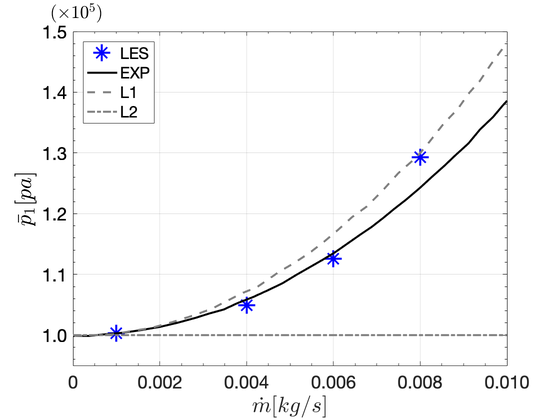 A A A Volume : 44 Part : 2 Large Eddy Simulation of compositional indirect noises generated in a non-isentropic nozzleYu Gong 1Imperial College LondonWilliam Jones 2Imperial College LondonAndrew Marquis 3Imperial College LondonABSTRACT In the present work, noises generated by compositional disturbances in a non-isotropic convergent nozzle is studied using Large Eddy Simulation (LES). The disturbances are created by a cross-flow pulse injection of a secondary gas with a different composition. The experiments are designed to feature two configurations, which enables the separation of direct and indirect noises. Compressible LES code BOFFIN-LES is utilised to account for noise generation and propagation effect. Different injecting positions, main jet mass flow rates and injection gases corresponding to the experiments are studied. The results revealed that the processes of direct and indirect noise generation are successfully reproduced in the LES, with the noise magnitudes in good agreement with those in the measurements. Injection of gases with smaller (He) and larger (CO2) molar masses compared to air is found to generate negative and positive indirect noises, respectively, in the LES, which is consistent with the experimental findings. The effect of different air mass flow rates is also investigated and discussed, and the direct noise and indirect noise amplitudes are both found to be closely related to the air mass flow rate. The predicted noise amplitudes were found to be closely related to the losses in the system, which was over-predicted in the simulation when the Mach number in the nozzle approaching unity.1. INTRODUCTIONCombustion noise is a potential major contributor to aircraft engines and gas turbine noise and has become an increasingly important topic over the last several decades [1]. There are two main categories of combustion noise: direct combustion noise and indirect combustion noise. Direct noise is caused by volumetric expansion and contraction due to unsteady heat released by unsteady1 y.gong@imperial.ac.uk2 w.jones@imperial.ac.uk3 a.marquis@imperial.ac.uka slaty. inter.noise 21-24 AUGUST SCOTTISH EVENT CAMPUS O ¥, ? GLASGOW combustion. The unsteady heat release rate is also accompanied by temperature, compositional and vortical perturbations, which if accelerated can eventually generate acoustic noise, known as the indirect noise [2]. In real engines, indirect noise is generated at the nozzle or the first stage of the turbine, and propagates both downstream and upstream back into the combustor. Those travelling back can contribute to the triggering of thermo-acoustic instability in the combustion chamber [3] and may lead to significant damage to the combustor structure and even engine failure [4]. Recently in Cambridge University, an Entropy Wave Generator (EWG) rig has been set up to investigate indirect noises caused by entropic and compositional inhomogeneities [5, 6]. The pressure signal upstream of the nozzle was recorded with various designs, successfully separating and identifying the direct and indirect noise. This work was further extended by [7] to account for the effect of non-isentropicity on the noise generation by compositional disturbances. A further step is to take account of the non-uniform distribution of entropic and compositional waves and the dispersion and convection of these waves inside the system: high accuracy simulations, which provides a three-dimensional description of the flow and turbulence, is a natural means whereby this can be achieved. Morgans et al. [8] performed incompressible DNS on a combustor channel flow to investigate the effect of flow advection of entropy waves, where dissipation effects were found to be negligible and that dispersion may not be sufficiently fast. Hence significant entropy wave strength remained at the combustor exit. Giusti et al. [9] applied incompressible LES to study entropy waves and found that the waves decayed as a function of a local Helmholtz number based on the wavelength and axial distance. Moreau et al. [10] performed compressible LES of the DLR EWG configuration, successfully reproducing the measured pressure signals and confirmed that the amplitude and shape of the entropy spot (temperature fluctuation caused by the heating device) was distorted especially when convected over a long distance in the downstream duct, while Rodrigues et al. [11] utilised URANS (unsteady RANS) to study the details of entropic and compositional waves generated by thermal and compositional perturbations in an open-end pipe without noise generation. The specific objective of the present work is to investigate the noise generated by compositional perturbations in the Cambridge EWG with a non-isentropic subsonic nozzle. Compressible LES has been performed on the 360 ◦ EWG configuration. Different injecting positions, main jet mass flow rates and injection gases corresponding to the experiments, are studied and the upstream pressure signal is monitored to separate and identify the direct and indirect noises.2. CASE DESCRIPTIONThe target experiments of the present work are a series of test cases conducted with the Cambridge University EGW rig. The experimental configuration is shown schematically in Fig. 1. Acoustics noise, compositional wave and entropic wave are denoted by P , ξ and κ respectively. The subscript d and i represent direct and indirect noises, and the superscript + and − represent the propagation directions of the acoustic waves respectively. The blues arrows represent the acoustic waves propagating at the speed of sound c , and the black arrows denote the jet flow rate at which the compositional and entropic waves travel downstream. A flow of air with a controlled mass flow rate is fed into the duct through the inlet on the left of the duct upstream of the nozzle. A pulse of secondary flow is injected perpendicular to the main air flow. The primary airflow is supplied through a long flexible hose