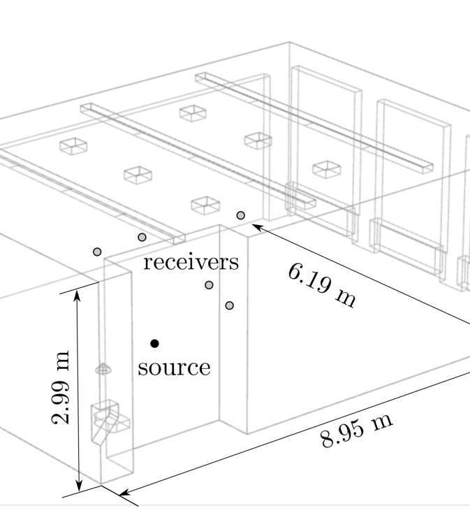 A A A Volume : 44 Part : 2 A benchmark study on room acoustic simulations with various material inputsYue Li 1Siemens Digital Industries Software Interleuvenlaan 68, B-3001 Leuven, BelgiumJulie Meyer 2Department of Computer Science, Aalto University Konemiehentie 29, FI-02150 Espoo, FinlandTapio Lokki Department of Signal Processing and Acoustics, Aalto University Maarintie 8, FI-02150 Espoo, FinlandJacques Cuenca Siemens Digital Industries Software Interleuvenlaan 68, B-3001 Leuven, BelgiumOnur Atak Siemens Digital Industries Software Interleuvenlaan 68, B-3001 Leuven, BelgiumWim Desmet Department of Mechanical Engineering, KU Leuven Celestijnenlaan 300, B-3001 Leuven, BelgiumABSTRACT This work investigates and evaluates the capabilities of an explicit finite-di ff erence time-domain (FDTD), a fast multipole indirect boundary element method (FMBEM), and a ray acoustic solver in the context of room acoustic modeling and simulations. In room acoustic simulations, the wave-based FDTD and FMBEM methods are known for generating accurate results at low frequencies, while the ray acoustic technique is in principle more valid at higher frequencies. The numerical aspects of setting up the solution for each solver are discussed. Special attention is given to the influence of material input data of various degrees of detail. Single / multiple frequency-independent / dependent materials are considered in the model setup. The modeling capabilities of the three solvers in handling material input with various complexities are analyzed. Numerical results are evaluated in1 li.yue@siemens.com2 julie.meyer@aalto.fia slaty. inter.noise 21-24 AUGUST SCOTTISH EVENT CAMPUS O ¥, ? GLASGOW both frequency and time domains. Room acoustic parameters, including the reverberation time, early decay time, clarity, and definition, are compared. These results are also compared with available measurement data. Last but not least, the computational e ffi ciencies of the three solvers are briefly discussed.1. INTRODUCTIONIn the era of digitization, acoustic simulations are useful to design, analyze and predict complex real-world acoustic scenarios. They can, for example, serve as an alternative to acoustical measurements. As such, acoustic solvers are useful tools in many application areas such as room acoustic and architectural design. Depending on the applications, various numerical techniques could be considered, ranging from wave-based simulations, ray-like approximations, to energy-based estimations. The selection of an appropriate solver normally relies on the physical size of the problem, frequency range of interest, precision requirement and available computational resources. For low / mid frequency acoustic phenomena such as the seat-dip e ff ect [1] or room modes [2], wave-based methods are normally preferred compared to others considering their high accuracy. A major limitation of wave-based methods, such as finite-di ff erence time-domain (FDTD) and fast multipole boundary element method (FMBEM), comes from their high computational demand in terms of memory and time. Ray-like acoustic solvers simplify the acoustic waves as rays which could significantly improve the computation e ffi ciency. However, such an assumption is in principle only valid at relatively high frequencies where the wave phenomena are less significant [3]. Besides, the recreation of real-world room acoustics plays an important role especially in the development of virtual reality and Metaverse. Such cases pose challenges and requirements on the numerical solvers in handling complex scenarios including complex material properties. This work presents a study on room acoustic simulation in mid-low frequency range with particular focus on complex material inputs. Two wave-based numerical solvers i.e. FDTD and FMBEM are the main focus of the study. A ray acoustic solver is also presented as a supplement in the comparison. The material input covers single / multiple frequency-independent / dependent properties.2. NUMERICAL METHODS2.1. Finite-di ff erence time-domain method The FDTD method can be used to solve the homogeneous scalar wave equation which can be expressed in the 3D Cartesian coordinate system as follows∂ 2 p∂ t 2 = c 2 ∂ 2 p∂ x 2 + ∂ 2 p∂ y 2 + ∂ 2 p! , (1)∂ z 2where p ( x , y , z , t ) is the acoustic pressure, and c is the speed of sound in the fluid. Considering the widely-used explicit standard rectilinear (SRL) scheme, the discretization of Eq. (1) in space and time leads toδ 2 t p n l , m , i = λ 2 ( δ 2 x + δ 2 y + δ 2 z ) p n l , m , i , (2)where λ = cT / X is the Courant number (set to the stability limit of the SRL scheme, i.e. λ = 1 / √3) with time step T = 1 / f s , where f s denotes the temporal sampling frequency, and spatial grid spacing X . p n l , m , i ≡ p ( x , y , z , t ) | x = lX , y = mX , z = iX , t = nT is the update variable, n denotes the time index and l , m , and i are the spatial indices in the x -, y -, and z -direction, respectively. δ 2 t , δ 2 x , δ 2 y , δ 2 z are the second-order derivative centered finite-di ff erence operators. A key input simulation parameter controlling the accuracy of the FDTD simulation results is the temporal sampling frequency f s (inversely proportional to the spatial grid spacing X ) of the simulation. Interestingly, there is no general consensus on how to choose this parameter such that “accurate- enough” simulation results can be obtained. This is mostly due to the facts that the accuracy criterion is strongly context- or application-dependent, and that the computational resources are limited in practice. In room acoustics and related fields, dispersion analysis is the most commonly employed method for error analysis [4]. Several di ff erent accuracy criteria were used in previous studies using the dispersion analysis method. For example, in Ref. [5], the phase velocity error was limited to 2% whereas in Ref. [6], the error was limited t