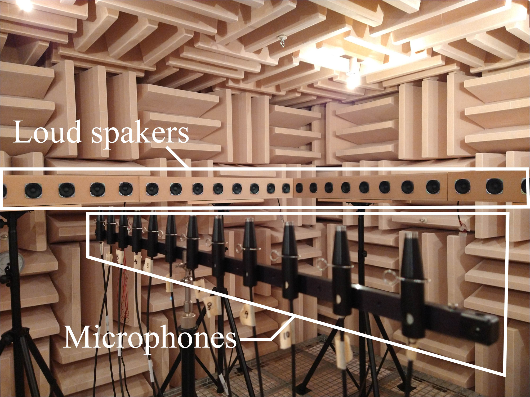 A A A Volume : 44 Part : 2 Sound Field Reproduction Based on Pressure Matching with Transfer Functions Modeled by Equivalent Sources and Image SourcesYukika Suzuki 1Tokyo Denki university 5 Senju-Asahi-Cho, Adachi-ku, Tokyo, JAPANHaruka Matsuhashi 2Tokyo Denki university 5 Senju-Asahi-Cho, Adachi-ku, Tokyo, JAPANIzumi Tsunokuni 3Tokyo Denki university 5 Senju-Asahi-Cho, Adachi-ku, Tokyo, JAPANYusuke Ikeda 4Tokyo Denki university 5 Senju-Asahi-Cho, Adachi-ku, Tokyo, JAPANABSTRACT Pressure matching (PM) is an e ff ective method for sound field reproduction. In the PM method, the controlled area is discretized as control points, and the sound pressures at the control points are controlled using the transfer functions between the control points and loudspeakers. However, room impulse responses at several control points from many loudspeakers are required. Previously, we developed the reproduction method based on the modeling of the transfer functions of only the direct sounds generated by the loudspeakers. By modeling transfer functions, many transfer functions can be obtained from a few microphones for PM. However, in actual environments, the sound is reflected by the enclosures of the loudspeakers. In this study, we devised a sound field reproduction method based on the modeling of the transfer functions of direct sounds and primary reflective sounds. We conducted measurement experiments using a 96-ch rectangular loudspeaker array. The proposed method was compared with the PM method that does not consider primary reflective sounds while modeling room impulse responses.1 22fmi26@ms.dendai.ac.jp2 21fmi18@ms.dendai.ac.jp3 21udc02@ms.dendai.ac.jp4 yusuke.ikeda@mail.dendai.ac.jpa slaty. inter.noise 21-24 AUGUST SCOTTISH EVENT CAMPUS O ¥, ? GLASGOW 1. INTRODUCTIONVarious sound field synthesis and reproduction / control methods with multiple loudspeakers have been proposed [1] [2] [3] [4]. The pressure matching (PM) method is one of the e ff ective methods of sound field control. It controls the sound field by matching the sound pressures at discretized control points inside the reproduction area with desired sound pressures [5]. Although the PM method can control the sound field with high precision by compensating loudspeaker characteristics and room reverberation, the transfer functions between the loudspeakers and control points are required to be measured in advance. However, handling a large number of measurement points becomes challenging as the numbers of loudspeakers and control points increase. Previously [6], we proposed a PM method based on the estimation of transfer functions based on a few measurements obtained using the equivalent source method (ESM) [7]. Bokai et. al. ( [8]) proposed a multizone sound field reproduction method by controlling the dark zone using the ESM. In the previous studies based on the ESM, only the direct sounds from the loudspeakers were considered. However, the transfer functions of loudspeakers generally include sound reflections such as the sound reflected by the enclosures of the loudspeakers. To estimate the sound field including reflected sounds, a modeling method based on the sparse ESM and image source method have been proposed [9]. In this study, we developed a PM method based on the ESM and image source method by considering the sounds reflected by the enclosures of loudspeakers. For evaluation, we compared the reproduction accuracies of the proposed method with and without the consideration of reflected sounds for sound fields that include direct sound and primary sound reflections.2. METHOD2.1. Modeling transfer functions using image source and equivalent source methods To obtain the transfer functions between loudspeakers and control points, we model the transfer functions considering the direct and reflected sounds by using the measurements obtained via a small number of microphones. For simplicity, sound reflections that include only primary reflective sounds are considered. First, we assume that the approximate positions of the loudspeaker and microphones are known. In the frequency domain, the transfer function from a loudspeaker to the m -th microphone ( m = 1 , . . . , M ), including the primary reflective sound, is represented byy m = y (0) m + · · · + y ( l ) m + · · · + y ( L ) m , (1)where y (0) m is the direct sound component and y ( l ) m is the component of the primary sound reflected by the l -th wall. Based on the ESM, the transfer function of the direct sound y (0) m is represented by the sum of the transfer functions of point sources placed around the loudspeaker. Thus, the transfer function of the m -th microphone at x ′ m from the loudspeaker, including the primary sound reflected by the l -th wall, is represented asy ( l ) m z ( l ) m w ( l ) ( l = 0 , 2 , ..., L ) , (2)z ( l ) m h Z ( x ′ m , x ( l ) 1 ) , . . . , Z ( x ′ m , x ( l ) N ) i , (3)w ( l ) [ w ( l ) 1 , . . . , w ( l ) N ] T , (4)where z ( l ) m ( ∈ C 1 × N ) is the transfer function vector from the equivalent source ( n = 1 , . . . , N ) placed around the loudspeaker to the m -th microphone. This can be calculated using the Green’s function under free-field condition. w ( l ) m is the weight coe ffi cient vector of the equivalent source, and l = 0 indicates the direct sound. Equation (2) is valid in case of the direct sound and all primary reflections, for all microphones. Thus, it can be represented in the matrix form as follows:y Zw (5) y [ y 1 , . . . , y M ] T (6)z (0) 1 · · · , z ( L ) 1 ... ... ...Z(7)z (0) M · · · z ( L ) Mw [ w (0)T , . . . , w ( l )T , . . . , w ( L )T ] T (8) (9)where y denotes the vector of the microphone signals, Z ( ∈ C M × ( N × ( L + 1)) ) is the matrix of the transfer functions from the equivalent sources to the microphones, and w ( ∈ C ( N × ( L + 1)) × 1 ) denotes the vector of the weight coe ffi cients. As the sound and image sources in the space are sparse, the sparsity is assumed for the weigh