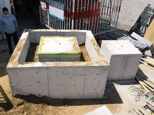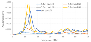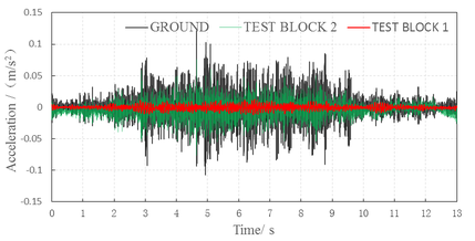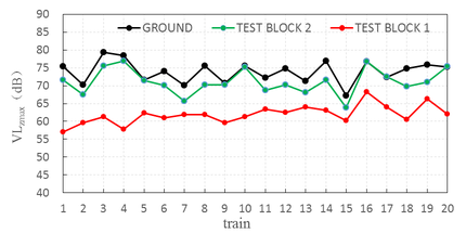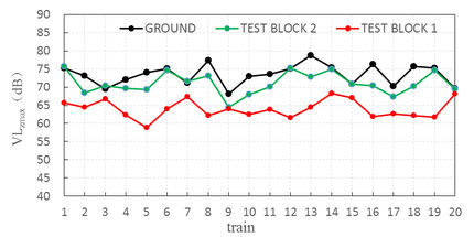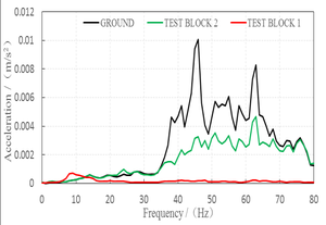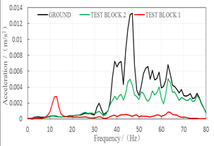 A A A Volume : 44 Part : 2 Model test analysis of control effect of building foundation elastic pad on subway environmental vibration Yubin Wu, Ruixiang Song, yanan Wu 1 , Lei He, Bideng Liu, Qiong Wu, Dan Wu, Jing Zhang Institute of Urban Safety and Environmental Science, Beijing Academy of Science and Technology No.55, Taoranting Rd, Xicheng, Beijing, 100054, PR. ChinaABSTRACT Building foundation elastic pad is one of the important measures for subway vibration control. In order to understand the subway vibration control effect of elastic pad on superstructure, two identical concrete test blocks were poured on site near a subway line. Taking the real subway vibration load as the input source strength, the vibration isolation effect of elastic pad on upper concrete mass block was compared and analyzed; At the same time, the influence of the backfill around the underground foundation of the building on the vibration isolation effect is simulated and analyzed. The backfill has a non negligible restraint effect on the building, improves the vertical natural frequency of the "building - elastic pad" system, and then reduces the vibration isolation effect of the elastic pad. Therefore, the influence of surrounding soil on vibration isolation effect should be fully considered in the application design of building foundation elastic pad engineering.1. INTRODUCTIONThe rapid development of urban rail transit has brought serious vibration and noise pollution to the surrounding environment [1] . Building foundation elastic pad is one of the important control measures of subway vibration [2-3] , At present, hundreds of buildings around the world have adopted this kind of vibration control measure, but there are few reports on the environmental vibration control effect and influencing factors of building foundation elastic pad, people still use the single degree of freedom vibration isolation theory to simply estimate the control effect.In fact, the “building - elastic pad – soil” is a complex coupling system. The underground foundation of the building is constrained by the surrounding soil, and the lateral pressure generated by the soil around the underground foundation will inevitably affect the vertical natural frequency of the "building - elastic pad" system, so as to reduce the vibration isolation effect of the elastic pad on the superstructure, At the same time, the surrounding soil, as the propagation medium of vibration elastic wave, has an impact on the vibration response of buildings.This paper systematically studies the influence law of the surrounding soil of building foundation on the vibration isolation effect by using the method of field model test. The research results can provide reference for engineering application.2. MODEL TEST SCHEMEConcrete mass blocks with the same geometric dimensions are poured near the subway line site. Polyurethane elastic pads are pasted at the bottom and four sides of one mass block to simulate the building structure with elastic pad vibration isolation measures (referred to as test block 1 in this paper), and the other mass block is not paved with any elastic pads for comparison of vibration1 854718393@qq.com isolation effect and reference object (referred to as test block 2 in this paper). The length, width and height of the test block are respectively 1m × 1m × 1m, square concrete test box is poured around the outside of test block 1, with wall thickness of 0.2m and height of 1.1m; The inner wall of the test chamber is 0.5m away from the test block, and the middle is filled with backfill material. The site photos of concrete test block and test box are shown in Figure 1. There are two subway lines in operation around the model test site. The subway train running on the ground shows that it has a very obvious impact of environmental vibration. This test takes the actual subway environmental vibration as the excitation load, which can truly reflect the vibration isolation effect of the elastic pad under the subway vibration load.Test block2 Test block 1Test boxBack fillTest boxTest block1Test block2Side padBottom padFigure 1: Test model Figure 2: Schematic diagram of model test Based on the mass of the model test block and the physical and mechanical properties of the elastic pad, the experimental design of the vibration isolation performance of the elastic pad is carried out. The concrete test mass is about 2400Kg. Polyurethane elastic pads with side length of 13.4cm are laid at the four corners of the bottom of the concrete test block, and the thickness of the elastic pad is 5cm. Figure 2 is the schematic diagram of the model test. The maximum static load limit of the tested elastic pad material is 0.35N/mm 2 , the maximum short-time overload limit is 4N / mm 2 , the mechanical loss factor is 0.07, the static elastic modulus is 2.55N/mm 2 , and the dynamic elastic modulus is 3.35N/mm 2 . Figure 3 shows the stress deformation relationship curve of the elastic pad when the elastic pad is laid (shape factor q = 1.5), and Figure 4 is the relationship curve between the compressive stress of the elastic pad and the natural frequency. It can be seen from Figure 3 and Figure 4 that the compressive stress of the elastic pad in the model test in this paper is about 0.334 N / mm 2 , and the design load is within the reasonable working range of the elastic pad. Under the same load pressure, the thicker the elastic pad, the lower the natural frequency of the vibration isolation system. When the compressive stress in the model test in this paper is 0.334N/mm 2 and the thickness of the elastic pad is 5cm, the natural frequency of the vibration isolation system can reach 7Hz. In order to simulate the damping effect of the side pad of the underground foundation in the actual project, polyurethane and polystyrene board protective materials are pasted around the concrete test block.Specific load / (N/mm 2 )Specific load / (N/mm 2 )Deflection / mmNatural frequenc