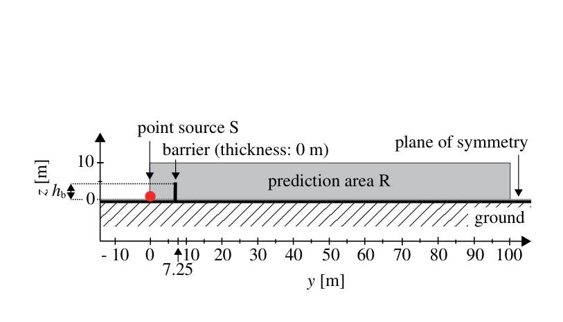 A A A Volume : 44 Part : 2 Wave-based numerical investigation on di ff raction correction for a low-height barrier in energy-based sound propagation model for road tra ffi c noiseYosuke Yasuda 1Faculty of Architecture and Building Engineering, Kanagawa University 3-27-1 Rokkakubashi, Kanagawa-ku, Yokohama, 221-8686 JapanYu Kamiya 2Graduate School of Engineering, Kanagawa University 3-27-1 Rokkakubashi, Kanagawa-ku, Yokohama, 221-8686 Japan Technical Research & Development Institute, Kumagai Gumi Co., Ltd. 1043 Onigakubo, Tsukuba-shi, Ibaraki, 300-2651 JapanMakoto Morinaga 3Faculty of Architecture and Building Engineering, Kanagawa University 3-27-1 Rokkakubashi, Kanagawa-ku, Yokohama, 221-8686 JapanABSTRACT In energy-based noise propagation prediction models such as CNOSSOS-EU in Europe and ASJ RTN-Model in Japan, sound propagation is calculated considering the noise attenuation by the geometrical divergence of the sound power from a sound source with various attenuation corrections such as di ff raction e ff ect and ground e ff ect. In ASJ RTN-Model, the insertion loss of a semi-infinite barrier with respect to a free field is generally used for the di ff raction correction for a single barrier, whereas the di ff raction correction for a low-height barrier is di ff erently defined; it is given as the insertion loss of the low-height barrier with respect to a semi-infinite barrier, the top height of which is at the ground surface level. The di ff raction correction is zero when the low-height barrier is 0 m high. However, its range of application is not clear. In this paper, the di ff raction correction for a low-height barrier is discussed by comparing the calculation results based on ASJ RTN-Model with the above-mentioned two di ff raction corrections and results based on a three-dimensional wave-based numerical analysis.1. INTRODUCTIONEnergy-based noise propagation prediction models, such as CNOSSOS-EU [1] in Europe and ASJ RTN-Model [2] in Japan, are generally based on the formula for distance attenuation due to1 yyasuda@kanagawa-u.ac.jp2 yu.kamiya@ku.kumagaigumi.co.jp3 m-morinaga@kanagawa-u.ac.jp point source Splane of symmetry barrier (thickness: 0 m) 10z [m]h b prediction area R0ground0 - 10 10 20 30 40 50 60 100 90 70 80 7.25y [m]Figure 1: Analysis model: cross-section ( yz plane).plane of symmetry10030prediction area R20y [m]barrier (height: h b , thickness: 0 m)107.25point source S00 10 20 30 40 50 60 100 90 70 80 x [m]Figure 2: Analysis model: plan ( xy plane).geometrical divergence from the sound source, to which various corrections such as di ff raction attenuation and ground surface attenuation are added. In ASJ RTN-Model, the di ff raction correction for semi-infinite barriers (Maekawa’s chart) [3,4] is used for di ff raction calculations for single and double barriers that can be considered knife wedges. On the other hand, for di ff raction calculations for low-height barriers, a di ff erent correction is given from that for general ones. This is given as the insertion loss when a low-height barrier is installed against a semi-infinite barrier whose top edge is at the ground surface level, and is designed so that the di ff raction correction is zero when the height of the low-height barrier is 0 m. However, its application range is not so clear. ASJ RTN-Model states that this correction is for “a barrier with a height of 1 m or less in flat terrain [2],” but does not explicitly state the basis or concept of this correction. In this paper, we clarify the characteristics of the di ff raction correction for a “low-height sound barrier,” which is calculated as the insertion loss with respect to the semi-infinite barrier, and discuss its range of application. We compare the results of road tra ffi c noise predictions for sound fields with a barrier calculated based on ASJ RTN-Model with di ff raction corrections for general barriers and for low-height barriers and those calculated based on a three-dimensional wave-based numerical analysis. The height of the barrier is varied to understand the characteristics of the di ff raction field for each height, as well as the characteristics of the above two types of di ff raction correction. Finally, we propose a specific application range of di ff raction correction for low-height sound barriers, taking into account practical aspects.2. CALCULATION SETUP2.1. Analysis Model Figures 1 and 2 show a cross-section and plan of the analysis model, respectively. A rigid barrier with zero thickness and infinite length (limited to 200 m in the three-dimensional wave-based numerical analysis described below) and a point source S (0 , 0 , 0) are placed on an infinite rigid plane that simulates the ground surface. The height of the barrier is varied from 0 to 4 m. The point source has the A-weighted sound power spectrum of a passenger car running at a steady speed of 60 m / h on a dense asphalt pavement road, the calculation formuli for which are shown in ASJ RTN-Model 2013 [5]. Prediction points are placed in the range of 0 ≤ x ≤ 100 m, 0 ≤ y ≤ 100 m, and 0 ≤ z ≤ 10 m with 2 m intervals. Near the ground surface 0 ≤ z ≤ 2 m, the interval is 0.1 m to examine the sound pressure level distributions in detail.2.2. Calculation Using ASJ RTN-Model Direct calculation for overall valuesBasic equation The A-weighted sound pressure level L A [dB] for noise propagation from the source (vehicle) position to the prediction point is calculated asL A = L W A − 8 − 20 log 10 r + ∆ L dif , (1)where L W A is the A-weighted sound power level [dB] of a single running vehicle at the source position, and r is the direct distance [m] from the source position to the prediction point. ∆ L dif is the correction term for di ff raction [dB], which is replaced as ∆ L dif = ∆ L d , k or ∆ L dif = ∆ L dif , low , depending on the acoustical obstacle.Correction term for di ff raction around a barrier ∆ L d , k The correction term for d