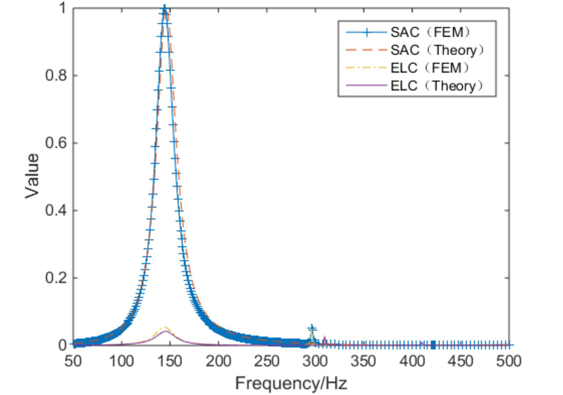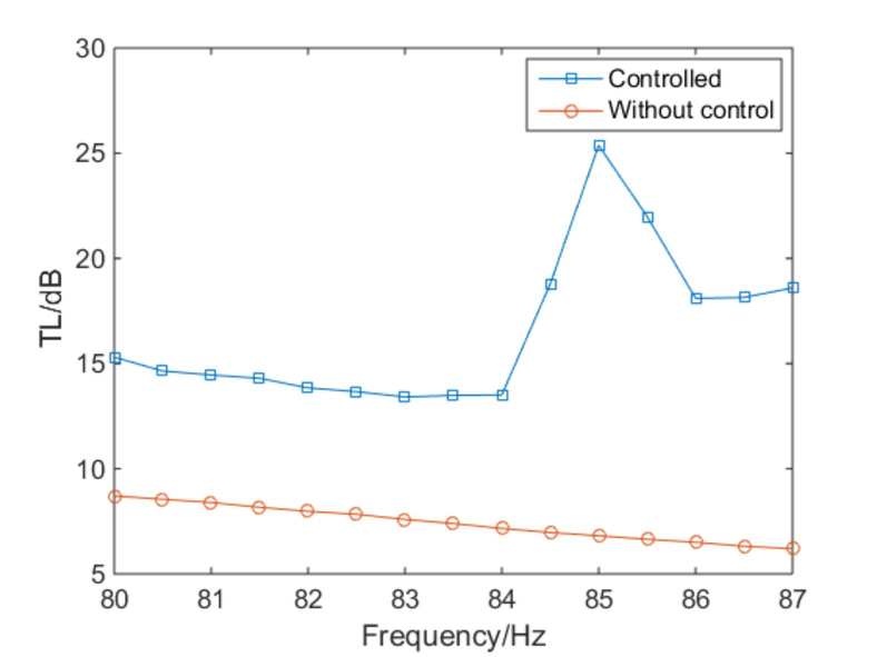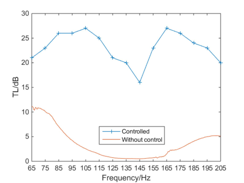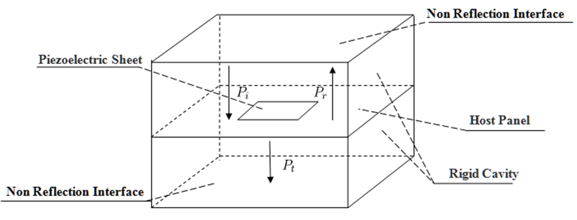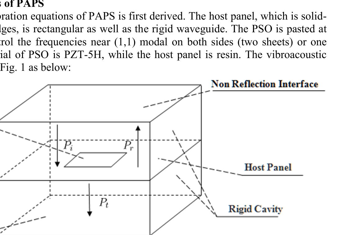 A A A Volume : 44 Part : 2 Vibration and acoustic radiation control of a panel attached to piezoe- lectric shunt oscillators Yongyuan Zhang 1 1.Key Laboratory of Noise and Vibration Research, Institute of Acoustics, Chinese Academy of Sciences, No. 21 North 4th Ring Road, Haidian District, Beijing 100190, China; 2.University of Chinese Academy of Sciences, Beijing 100049, China Daoqing Chang 2 1.Key Laboratory of Noise and Vibration Research, Institute of Acoustics, Chinese Academy of Sciences, No. 21 North 4th Ring Road, Haidian District, Beijing 100190, China; 2.University of Chinese Academy of Sciences, Beijing 100049, ChinaABSTRACT In this work, the vibration of a single-panel attached with piezoelectric shunt oscillators (PAPS) and its acoustic radiation are modeled theoretically. The vibration equations are derived based on the principle of minimum potential energy and acoustic impedance of PAPS. The sound absorption coefficient (SAC), energy loss coefficient (ELC), and transmission loss(TL) of PAPS are calculated based on the acoustic impedance and displacement response of PAPS. Then theoretical results are compared with those of finite element simulation, and the results are relatively consistent. Finally, sound absorption and isolation experiments of PAPS at non-eigenfrequency near (1,1) modal are conducted in a standing wave tube.1. INTRODUCTIONIt is well known that most of the noise affecting people's daily life comes from the vibration of structures, while flexible structures are the main part of the sound source and propagation path. Single-panel system is a common model of flexible structures in real life such as windows or exte- rior barriers of automobiles, and it is a foundation to study double-panel system, flexible cavity sys- tem and so on. Further study about the theoretical modeling, experiments and regulation rules of single-panel system's sound absorption and sound isolation is realistic demand.Medium and high frequency sound absorption and sound insulation of single-panel system can be solved by traditional means, such as acoustic cotton, acoustic tip split, foam metal, sound insula- tion walls and passive vibration isolators, etc .However, vibroacoustic control of traditional means are facing challenges of poor effect or good effect with high cost at low frequencies. In recent years, low-frequency passive acoustic structures and low-frequency acoustic metamaterial, have received considerable attention and achieved lots of theoretical and experimental results. Among them, Pie- zoelectric Shunt Oscillator (PSO) is widely used in passive and semi-active control of flexible1 969677926@qq.com2 changdq@mail.ioa.ac.cninter.noise SCOTTISH EVENT CAMPUS ? O ? ? structures, due to its high electromechanical coupling coefficients, robustness, effectiveness and adjustability at low frequencies[1-4].A single-panel system attached with piezoelectric shunt oscillator (PAPS) can be effectively controlled by adjusting the circuit parameters at low frequencies. There have been many researches about theory and experiments of single-panel attached to piezoelectric shunt oscillator(PAPS). As for sound absorption, Kim J combined PAPS with sound-absorbing material to achieve noise con- trol in a wide frequency band for plate structures [5]. Zhao and Kim J investigated physical parame- ters' effects on the acoustic radiation of PAPS [6].Liu studied the reflection coefficient of a cavity whose bottom is composed of PAPS [7]. Chang studied the sound absorption coefficient of PAPS backed by a rigid cavity[8].Numerical calculation and experimental verification were given after- wards[9].Moreover, Chang studied the SAC of a structure composed of a micro-perforated plate, a rigid cavity and a PAPS, which has two sound absorption peaks [10]. Gardonio proposed a broad- band circuit parameter control algorithm based on monitoring the current magnitude in the piezoe- lectric shunt circuit[11]. As for sound insulation, Aboelsooud established a finite element numerical model of PAPS and used PSO to control the vibration of an aluminum panel[12]. Later Chen inves- tigated the modeling method, frequency characteristics, and electromechanical coupling characteris- tics of piezoelectric network panels[13]. Zhang investigated the TL of PAPS using equivalent me- dium method and finite element simulation[14].It can be seen that the PAPS can be used for both low-frequency sound absorption and low- frequency sound insulation. The difference is mainly in the selection of shunt impedance, which can affect the electromechanical stiffness and damping of PAPS caused by piezoelectric effect. So in this work, a precise vibroacoustic vibration equation is established to numerically study the TL, SAC and ELC of PAPS. Then FEM and experiment results are compared with theoretical results and the regulation rules of PAPS at non-eigenfrequency are studied.inter.noise SCOTTISH EVENT CAMPUS ? O ? ?2. Theoretical Modeling of PAPS2.1. Vibration equations of PAPSIn this chapter, the vibration equations of PAPS is first derived. The host panel, which is solid- supported at all the four edges, is rectangular as well as the rigid waveguide. The PSO is pasted at the center of panel to control the frequencies near (1,1) modal on both sides (two sheets) or one side(one sheet). The material of PSO is PZT-5H, while the host panel is resin. The vibroacoustic model of PAPS is given in Fig. 1 as below:Figure 1: Vibroacoustic Model of PAPSNon Reflection Interface Piezoelectric Sheet ee Host Panel \\ Rigid Cavity Non Reflection Interface inter.noise SCOTTISH EVENT CAMPUS ? O ? ?6U = DX >, K,,(4, J )ajda; j=1 i=1In Fig. 1,is a pure plane acoustic wave formed in the rigid waveguide below its cut-off frequen- cy, and thus forces PAPS to vibrate and generate transmission sound.is the scattered sound while is the radiated sound. The bottom of the rigid waveguide is a none-reflection interface as well as the top, letting2h. A4 2h. A424. 2h. A4