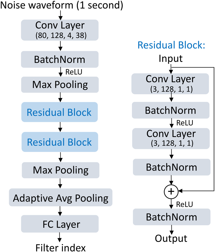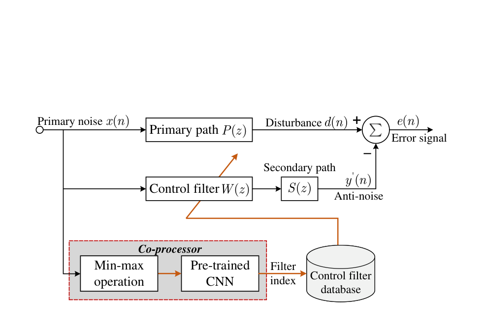 A A A Volume : 44 Part : 2 Performance Evaluation of Selective Fixed-filter Active Noise Control based on Di ff erent Convolutional Neural NetworksZhengding Luo 1 , Dongyuan Shi 2 , Woon-Seng Gan 3School of Electrical and Electronic Engineering, Nanyang Technological University, Singapore.Libin Zhang 4Huawei Technologies Co., Ltd.Qirui Huang 5Huawei International Pte. Ltd.ABSTRACT Due to its rapid response time and a high degree of robustness, the selective fixed-filter active noise control (SFANC) method appears to be a viable candidate for widespread use in a variety of practical active noise control (ANC) systems. In comparison to conventional fixed-filter ANC methods, SFANC can select the pre-trained control filters for di ff erent types of noise. Deep learning technologies, thus, can be used in SFANC methods to enable a more flexible selection of the most appropriate control filters for attenuating various noises. Furthermore, with the assistance of a deep neural network, the selecting strategy can be learned automatically from noise data rather than through trial and error, which significantly simplifies and improves the practicability of ANC design. Therefore, this paper investigates the performance of SFANC based on di ff erent one-dimensional and two-dimensional convolutional neural networks. Additionally, we conducted comparative analyses of several network training strategies and discovered that fine-tuning could improve selection performance.1. INTRODUCTIONAcoustic noise problems are becoming more prevalent as the quantity of industrial equipment increases [1]. The attenuation of low-frequency noises is quite di ffi cult and expensive for passive noise control techniques such as enclosures, barriers, silencers, etc. Di ff erent from passive techniques, active noise control (ANC) involves the electro-acoustic generation of a sound field to cancel an unwanted existing sound field [2]. Moreover, ANC can o ff er a possible lower-cost alternative for the control of low-frequency noises. Thus, it attracts much interest from the industry. When dealing1 luoz0021@e.ntu.edu.sg2 dongyuan.shi@ntu.edu.sg3 ewsgan@ntu.edu.sg4 zhanglibin@huawei.com5 huang.qirui@huawei.coma slaty. inter.noise 21-24 AUGUST SCOTTISH EVENT CAMPUS O ¥, ? GLASGOW Error signal +( ) x n Primary noise ( ) e n( ) d n DisturbancePrimary path ( ) P z_' ( ) y n Secondary pathControl filter ( ) W z ( ) S zAnti-noiseCo-processorMin-max operationPre-trainedFilter indexCNN Control filterdatabase Control filterdatabaseFigure 1: Block diagram of the CNN-based SFANC algorithm.with di ff erent types of noises, traditional ANC systems typically use adaptive algorithms to adjust control filter coe ffi cients to minimize the error signal [3]. Among adaptive algorithms, the filtered-X least mean square (FxLMS) and filtered-X normalized least-mean-square (FxNLMS) algorithm are commonly used since they can compensate for the delay involved by the secondary path to increase the system robustness [4]. However, due to the least mean square (LMS) based algorithms’ inherent slow convergence and poor tracking ability [5], FxLMS and FxNLMS are less capable of dealing with rapidly varying or non-stationary noises. Their slow responses to noises may impact customers’ perceptions of the noise reduction e ff ect [6]. Fixed-filter ANC methods [7] can be adopted to tackle slow convergence, where the control filter coe ffi cients are pre-trained rather than adaptive updated. However, the pre- trained control filter is only suitable for a specific noise type, resulting in the degradation of noise reduction performance for other types of noises. To rapidly select di ff erent pre-trained control filters given di ff erent noise types, a selective fixed-filter active noise control (SFANC) method based on the frequency band matching was proposed in [8]. Though the SFANC method [8] selects the most suitable pre-trained control filters in response to di ff erent noise types, several critical parameters of the method can only be determined through trials and errors. Considering the limitations, deep learning techniques, particularly convolutional neural networks (CNNs) [9–12], appear to be powerful in classifying noises in SFANC methods. Automatic learning of the SFANC algorithm’s critical parameters based on deep learning would broaden its applications in real-world scenarios. With the learning ability of CNN models, the SFANC algorithm can automatically learn its parameters from noise datasets and select the best control filter given di ff erent noise types without resorting to extra-human e ff orts [13]. Additionally, a CNN model implemented on a co-processor can decouple the computational load from the real-time noise controller. Therefore, in this paper, we compared the performance of several one-dimensional (1D) CNNs and two-dimensional (2D) CNNs in the SFANC method. Also, di ff erent network training strategies are tried to choose the best one for training the networks. Experiments show that the SFANC method based on CNN not only achieves faster responses than FxLMS and FxNLMS but also exhibits good robustness. Thus, it is expected to be used for attenuating dynamic noises such as tra ffi c noises and urban noises, etc.2. CNN-BASED SFANC ALGORITHMThe overall architecture of the CNN-based SFANC algorithm is depicted in Figure 1. Throughout the control process, the real-time controller conducts filtering to generate anti-noise while simultaneously sending the primary noise to a co-processor (e.g., a mobile phone). Given the primary noise, the co- processor employs a pre-trained CNN to produce the index for the most appropriate control filter and Figure 2: Markov model of the ANC progress.delivers it to the real-time controller. The controller then adjusts the control filter coe ffi cients based on the received filter index. Notably, if the network is a 1D CNN, its input is the raw waveform [14]. However, if the network is a 2D CNN, its input i