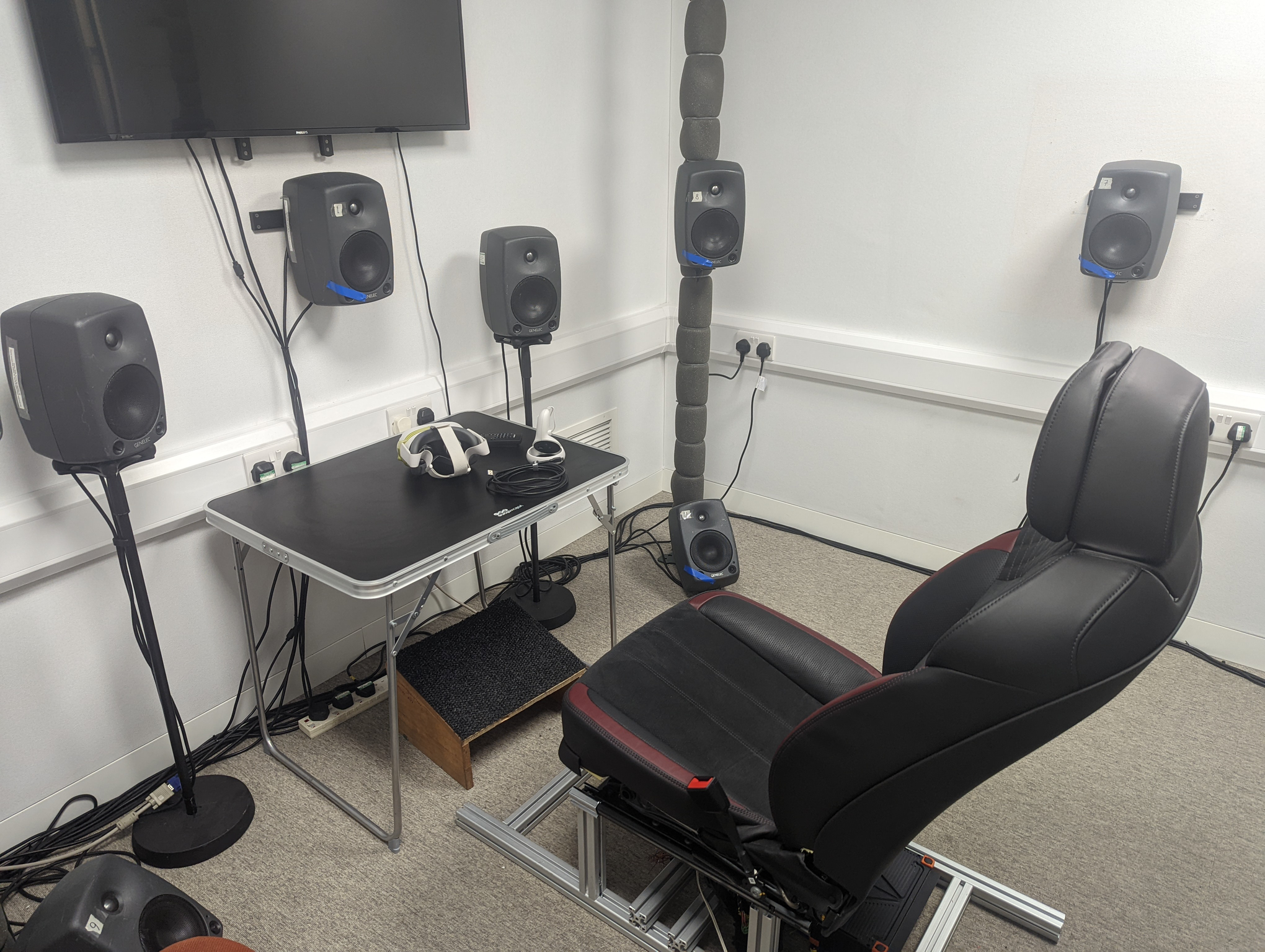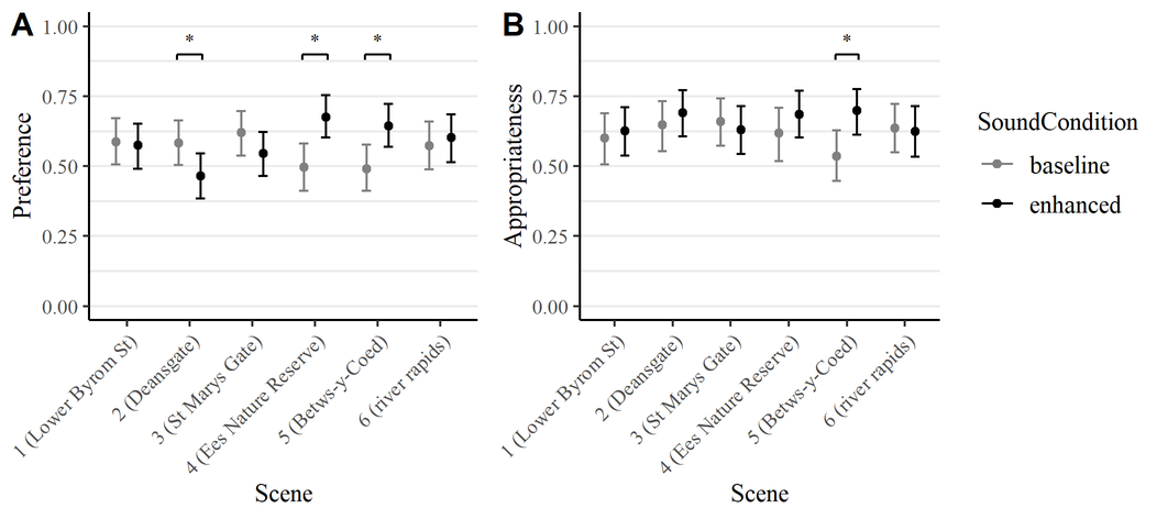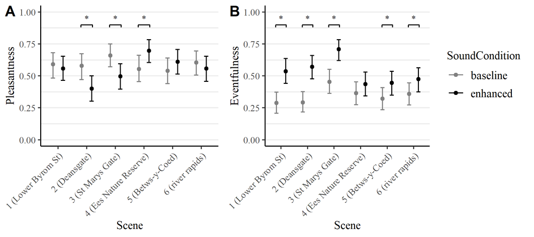 A A A Volume : 44 Part : 2 Audio augmentation of car journeys to improve occupants’ well-beingZuzanna Podwinska 1Acoustics Research Centre, University of Salford The Crescent, Salford M5 4WT, EnglandLara Harris Acoustics Research Centre, University of Salford The Crescent, Salford M5 4WT, EnglandAndrew Jackson Bentley Motors Pyms Lane, Crewe, Cheshire, CW1 3PL, EnglandConnor Welham Acoustics Research Centre, University of Salford The Crescent, Salford M5 4WT, EnglandAndrew Elliott Acoustics Research Centre, University of Salford The Crescent, Salford M5 4WT, EnglandABSTRACT Car interiors are often designed with the aim of being as quiet as possible. This has the benefit of eliminating most of the unwanted sound such as engine or tyre noise, but it also blocks out environmental sounds which might be perceived as positive and even desirable. Bringing in some of these positive sounds – particularly of nature or human activity – could enhance the experience of both the driver and the passengers. The literature has shown that being exposed to pleasant soundscapes has the potential to aid recovery from stress and is associated with lower heart rate than being exposed to unpleasant soundscapes. Therefore, increasing pleasantness of the sound environment in the car could lead to improved well-being. This paper reports on an immersive audio-visual listening experiment investigating how listeners perceive journeys augmented with realistic soundscapes. To increase realism and ecological validity, the experiment uses spatial audio, 360-degree videos presented through a virtual reality headset, and a car seat with vibrations corresponding to the presented drive.1 z.m.podwinska@salford.ac.uka slaty. inter.noise 21-24 AUGUST SCOTTISH EVENT CAMPUS O ¥, ? GLASGOW 1. INTRODUCTIONReducing unwanted sound has long been a focus of engineering activity in the automotive industry, typically referred to as NVH (noise, vibration, and harshness). It is now possible to achieve an acoustic environment inside the vehicle cabin that e ff ectively excludes most external sound through purely passive means. It is usually desirable to exclude sounds such as tyre, wind, and engine noise. Other sounds that are prevented from reaching the vehicle occupants may be beneficial to preserve, either to improve the journey experience, or for other reasons such as enhanced situational awareness. The study described here investigates the first of these use-cases, exploring the use of sound to enhance passenger well-being. Pleasantness is one of the main dimensions on which soundscapes can be described. There is evidence that soundscape pleasantness is related to physiological responses in the body. Being exposed to more unpleasant soundscapes was found to be correlated with heightened heart rate and lowered respiration rate [1]. Also, pleasant soundscapes show a decrease in skin conductance levels after a stress task compared to unpleasant soundscapes, which suggests better recovery from stress [2]. This indicates that there is a well-being benefit to being exposed to pleasant as opposed to unpleasant soundscapes. In this paper, we evaluate if bringing external sounds into the car can increase pleasantness of car journeys. We also assess the eventfulness of those enhanced sound environments, as the second important dimension of soundscapes [3] and whether participants assess them as appropriate in the context of being a passenger in a car.2. METHODS2.1. Recordings and reproduction To simulate the experience of being a passenger in a car, 360-degree video and spatial audio recordings were made inside a test vehicle, while driving through various locations. At the same time, sound was also recorded outside of the car, which was later used to enhance the journeys. Video recordings were made using the Insta360 Pro 2 camera placed on the front passenger seat of the car (see Figure 1a). A SoundField microphone recording 1 st order Ambisonics audio was placed directly below the camera. To record exterior sounds, 2 cardioid microphones were mounted in the centre of the roof of the car. Two calibrated B&K measurement microphones were mounted in the cabin and on the roof, to capture the sound levels for reproduction in the laboratory. Additionally, two accelerometers were mounted on the rails of the driver’s seat to record vibrations during the drive. In the laboratory, participants were seated in a car seat placed in an acoustically-treated room designed for multi-channel spatial audio reproduction (see Figure 1b). The interior sound was directly decoded from B-format recordings to the 16-loudspeaker setup around the listener. The exterior sound was first encoded to left and right position in 1 st order Ambisonics, and then decoded to the same loudspeaker setup. The sound level of the reproduced sound was set to be the same as the actual sound level captured by the measurement microphones during recording. Average LAeq reproduction level between the chosen scenes was 52.7 dB, with the quietest scene being 43.5 dB and the loudest 61.4 dB. The 360-degree videos were stitched from the individual camera lens recordings with the Insta360 Stitcher software and edited with Adobe Premiere Pro. They were then played over an Oculus Quest 2 virtual reality headset. To make the experience even more immersive, vibrations recorded in the car were reproduced with a ButtKicker shaker mounted on an aluminium frame underneath the seat. The frame was custom made to elevate the car seat, so that the average listener ear height was approximately in line with the tweeter of the central loudspeaker array. (a)(b)Figure 1: Recording and reproduction setup: a) 360-degree camera and Ambisonics microphone set up at the passenger seat to capture the audio-visual scenes; b) a car seat set up in an acoustically treated room with a spatial audio loudspeaker setup, where the scenes were reproduced for the experiment.2.2. Experimental procedure The experiment was a f