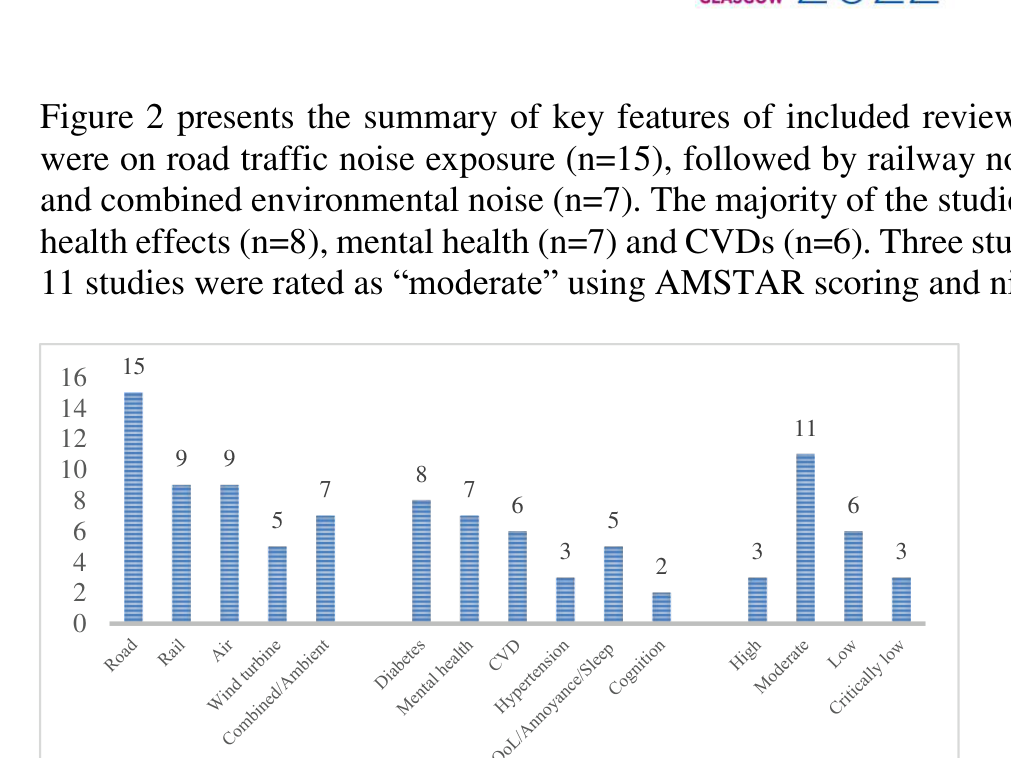 A A A Systematic Review of meta-analyses for noise Yingxin Chen 1 Centre for Environmental Health and Sustainability, University of Leicester University Road, Leicester, LE1 7RH Claire Blackmore 2 Centre for Environmental Health and Sustainability, University of Leicester University Road, Leicester, LE1 7RH Eminson, Katie 3 Centre for Environmental Health and Sustainability, University of Leicester University Road, Leicester, LE1 7RH Xiangpu Gong 4 Centre for Environmental Health and Sustainability, University of Leicester University Road, Leicester, LE1 7RH Anna Hansell 5 Centre for Environmental Health and Sustainability, University of Leicester University Road, Leicester, LE1 7RH ABSTRACT In the context of constructing a burden of disease (BOD) toolkit for noise exposures in England, we sought to identify meta-analyses to provide exposure-response coefficients that would update those available from the WHO Noise Guidelines for the European Region published in 2018. We conducted a systematic review of systematic reviews relating to noise exposure and selected health outcomes published in 2017-20. We used the AMSTAR checklist to score all selected systematic review papers at the same time as data extraction. A new review needed to have at least a moderate score on AM- STAR to be recommended as an alternative/update to the WHO analyses. Twenty-three papers were included in the review, of which 16 studies provide quantitative effects estimates. Eight considered environmental noise associations with metabolic outcomes, seven with mental health outcomes, six with cardiovascular outcomes, and five studies considered wellbeing, sleep, and annoyance. We rec- ommend one new meta-analysis on diabetes and one on hypertension, plus a further new meta-anal- ysis on ischemic heart disease (IHD) to be considered for use in place of the evidence recommended in the 2018 WHO Environmental Noise Guidelines. Our review also suggested there are now enough studies available to conduct a meta-analysis for noise and dementia. 1 yc310@leicester.ac.uk 2 clb91@leicester.ac.uk 3 ke79@leicester.ac.uk 4 xg82@leicester.ac.uk 5 ah618@leicester.ac.uk worm 2022 1. INTRODUCTION In the context of developing a new UK Burden of Disease Toolkit for noise for use by the UK Health Security Agency, this review assessed whether the newer evidence should take precedence over the exposure-response relationships for major outcomes proposed in the WHO systematic reviews on environmental noise. 2. METHODS We conducted a search of PubMed and Medline from 2017 to December 2020. Our search terms named noise sources of interest, the health outcomes of interest, papers that were termed epidemio- logical or health studies, and papers titled included “review”, “meta-analysis”. We limited number of studies using filter “review papers” to identify systematic review studies. A standardized data extrac- tion form was used to collect methodologic variables from each included review. We used the online version AMSTAR checklist to score all selected systematic review papers at the same time as data extraction. 2.1. Paper identification We conducted a search of PubMed and Medline from 2017 to 15 June 2020, that was updated (on 07 Mar 2021) to December 2020. We also searched conference proceedings for the International Con- gress and Exposition on Noise Control Engineering (Inter-noise, 2017-19), Euronoise (2018), Inter- national Commission on Biological Effects of Noise (ICBEN, 2017), The International Commission for Acoustics (ICA, 2019), the International Congress on Sound and Vibration (ICSV, 2017-19). We identified further papers through colleagues and our own reference libraries. Our search terms named noise sources of interest, the health outcomes of interest, papers that were termed epidemiological or health studies, and papers titled included “review”, “meta-analysis”. We limited number of studies using filter “review papers” to identify systematic review studies. Our eligibility criteria are below (See Table 1). Table 1: Eligibility criteria to screen studies for the review. Components Inclusion criteria Exclusion criteria Study type Systematic review and meta-analysis for epidemiological studies. e.g., ecological studies, cross-sectional studies, prospective and retrospective cohort studies, case-control studies and observational or experimental studies of people exposed to environmental noise. Review studies for intervention, in-vitro, toxicological, animal, or controlled exposure studies were excluded. Population Members of the general population as well as specific seg- ments of the population particularly at risk e.g., Children, pregnant women Animals, occupational popula- tions Exposure Environmental noise exposure from road, rail, aircraft, transport, industrial, wind turbine, construction. Studies participants exposed to occupational or laboratory- based noise were excluded Outcome Assessment of serval health outcomes, including effects on sleep, annoyance, cognitive impairment in school children, quality of life, cardiovascular disease (ischemic heart dis- ease, hypertension, stroke), metabolic disease (e.g., Obe- sity, diabetes mellitus). Health outcomes of unclear clin- ical health relevance, e.g., epige- netics, metabolomics, methyla- tion was excluded. worm 2022 Two researchers (CB & YC) scanned titles and read abstracts (sometimes with reference to full paper if not clear) to identify papers for the list for full paper reading. Duplicates, reviews for the WHO Environmental Noise guidelines and papers with no quantitative synthesis of results were excluded, as well as those out of scope (due to exposure or outcome issues). 2.2. Data extraction and preparation A standardized data extraction form (see table 1) was used to collect the following methodologic variables from each included review, conducted by at least two reviewers (YC, CB, AH, KE, XG). This comprised: first author (publication year), type o