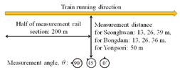 A A A Psychoacoustic Analysis of Various Train Pass-by Noise Using Binaural Recording Youngbeen Chung 1 , Kyunglae Gu 2 , Seongwook Jeon 3 , Gyuyoung Yi 4 Department of Mechanical Engineering, Hanyang University 222 Wangsimri-ro, Seongdong-gu, Seoul 04763, Republic of Korea Junhong Park 5 Department of Mechanical Engineering, Hanyang University 222 Wangsimri-ro, Seongdong-gu, Seoul 04763, Republic of Korea ABSTRACT Due to the recent high speed of railway, noise and vibration generated during operation has emerged as a major social problem. Specially, the internal noise of railway varies depending on various operating conditions such as speed, vehicle crossings, and tunnel entry, and has a great effect on the riding comfort of passengers. In this study, an evaluation method for binaural noise of train pass-by noise and a simple wave field model which can reflect the Doppler effect are examined. To reflect the binaural characteristics of train pass-by noise, binaural measurements were conducted for several types of train, different measurement distances and various measurement angles. The annoyances of measured binaural noises were analyzed using conventional sound pressure level, psychoacoustic metrics, and their rate of change. Also, the noise emitted from high-speed railways was measured and characterized. By its analysis result, moving sounds were synthesized considering an initial frequency and a frequency shift. The synthesized sounds were convolved to reflect binaural condition. Auditory experiments were conducted using the synthesized moving sound stimuli, and the effects of the Doppler frequency shift on annoyance of moving sound sources were obtained. 1. Introduction Traffic noise occupies the largest proportion in environmental noise. Especially for the residents near train tracks, noise emitted from railroad is the most serious. Tracks for high-speed trains are expanding rapidly as green transport systems in Korea. To satisfy the needs of both passengers and residents near tracks and to design high-quality acoustic comfort, sound environment must be characterized and evaluated accurately to reflect the annoyance perceived by both passengers and nearby residents. 1 chung_911@naver.com 2 gkl0677@naver.com 3 xingyu0810@hanmail.net 4 gyutori@naver.com 5 parkj@hanyang.ac.kr Especially, the noise level increases severely when two trains pass each other. These sudden changes in sound pressure influence the perception characteristics significantly and must be investigated to facilitate improved acoustic comfort. Unfortunately, most of the evaluation methods for train pass-by noise use monaural sound only but noise perception strategy of human is binaural. Because train pass-by noise is a kind of moving sound source, interaural level and time difference must be considered for evaluation. Also, since traffic noise sources generally do not stop but move at a high speed, pass-by noises are perceived by adjacent residents with frequency shift caused by the Doppler effect. The Doppler effect is a common phenomenon where the wavelength and the frequency of noise change due to the relative velocity between an observer and a noise source. In the case of high-speed railway noise, the frequency shift effect is very large by the proximity of the railway and at a high speed. For pass-by noise, this study went beyond the limitations of the existing monaural evaluation method and proposed a new noise evaluation method through a binaural noise evaluation method considering a human noise perception model. And to figure out the influence that the Doppler effect of a high-speed running train has on annoyance, this study used a synthesized moving sound source where head-related transfer function was applied to reflect a binaural effect. 2. Evaluation of Pass-by Noise Measurements of train pass-by noises were conducted at several locations. Pass-by noises caused by subways, freight trains, KTX trains, Mugunghwa trains, and Saemaeul and Nooriro trains whose running speed was below 140 km/h were measured in Seonghwan-eup, Cheonan. The pass-by noise caused by KTX and KTX-Sancheon whose running speed was 250~300 km/h was measured in Bongdam-eup, Hwaseong for different distances, and in Yongso-ri, Hwaseong for different measuring angles. Three binaural recorders (Headacoustics, MHS-II) were used for measurement at the same time. Measurement distances from rail were 13, 26 and 39 m perpendicularly for each binaural recorder and measurement angle θ was 0° in Seonghwan and Bongdam-eup. In Yongso-ri, measurement distances from rail were 50 m perpendicularly and measurement angle θ was 0, 45, 90° for each binaural recorder. Measurement height of each binaural recorder was 1 m. To minimize the effect of outdoor wind, wind shields were used for the binaural recorders. Running speed of trains was measured by speed radar (Pocket Radar, PR-1000). Figure 1: Measurement condition using binaural microphones. Through the analysis, it was identified that there is a binaural effect on the annoyance. To reflect the binaural effect on the annoyance, two additional auditory experiments were conducted. As a result, the maximum change rates of difference between left and right channel of loudness and sharpness were proposed to evaluate the annoyance of pass-by noises. 3. Doppler Effect on the Perceived Noise To examine the Doppler frequency shift of moving sound sources, pass-by noises of Korean high- speed train i.e. KTX were measured. The noise measurement was conducted at a distance of 13 m from the rail and a height of 1 m using a microphone installed with a windshield when a KTX train passed by at a speed of 300 km/h. Teainruming destin Halfofmemseement it se 2000 fo Senge 15.26.3908 for Boapda 13.26.3600 foe Yeap $01 wr) The measured noise was analyzed using a commercial program (Headacoustics, Artemis) in the time duration between the start and the end of a sound pressure level which was 30 dB lower from the maximum valu