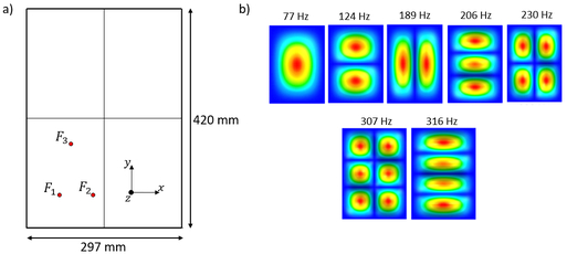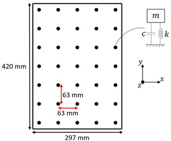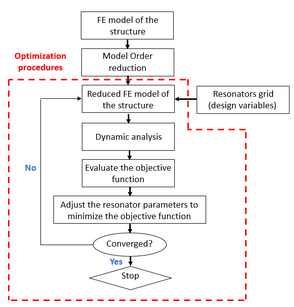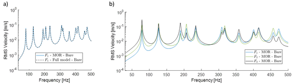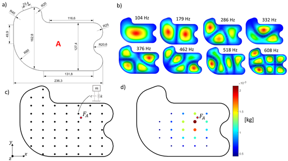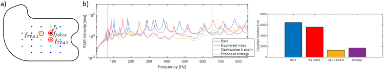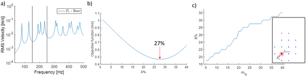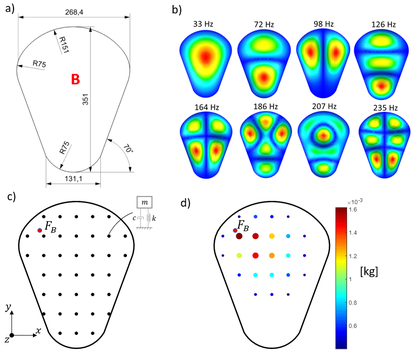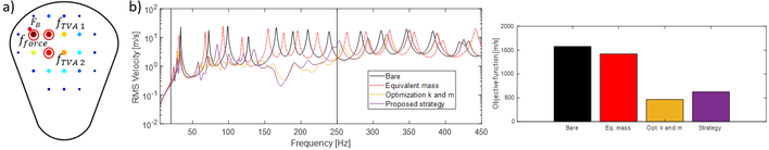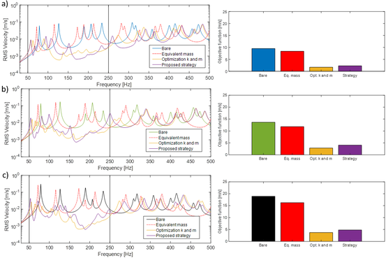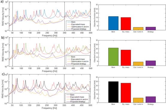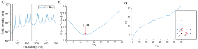 A A A Strategic distribution of resonators’ parameters for broadband vibration mitigation Felipe Alves Pires 1 DMMS Lab Flanders Make / KU Leuven, Department of Mechanical Engineering, Division LMSD Celestijnenlaan 300 B, B-3001, Heverlee, Belgium Régis Fabien Boukadia 2 DMMS Lab Flanders Make / KU Leuven, Department of Mechanical Engineering, Division LMSD Celestijnenlaan 300 B, B-3001, Heverlee, Belgium Elke Deckers 3 DMMS Lab Flanders Make / KU Leuven, Campus Diepenbeek, Department of Mechanical Engineering, Wetenschapspark 27, 3590 Diepenbeek, Belgium Wim Desmet 4 DMMS Lab Flanders Make / KU Leuven, Department of Mechanical Engineering, Division LMSD Celestijnenlaan 300 B, B-3001, Heverlee, Belgium Claus Claeys 5 DMMS Lab Flanders Make / KU Leuven, Department of Mechanical Engineering, Division LMSD Celestijnenlaan 300 B, B-3001, Heverlee, Belgium ABSTRACT Locally resonant metamaterials have recently come to the fore as novel lightweight and compact Noise, Vibration and Harshness (NVH) solutions. They have the potential to create stop bands i.e. frequency regions with superior noise and vibration performance. Nonetheless, these stop bands are typically only e ff ective within a limited frequency region. In order to broaden the frequency range of noise and vibration reduction, an optimization procedure could be applied to obtain the ideal distribution of resonance frequencies and masses to achieve a minimal noise radiation over a frequency range. However, this approach typically requires a considerable computational time. Thus, this paper proposes a set of guidelines that define a strategy to determine resonance frequencies and resonant masses in view of widening the NVH reduction without the use of optimization for systems under point force excitation. The proposed strategy is applied to a finite plate with an a priori determined grid for the resonator positions. The performance of the strategy is numerically analyzed by assessing the plate’s vibration response for multiple excitation locations and within di ff erent frequency ranges containing several modes. The obtained responses are then compared to the plate’s response with an optimized grid of resonators. The study shows that the proposed strategy leads to a reasonable vibration reduction with similar levels with respect to an optimized response. 1 felipe.alvespires@kuleuven.be 2 regis.boukadia@kuleuven.be 3 elke.deckers@kuleuven.be 4 wim.desmet@kuleuven.be 5 claus.claeys@kuleuven.be a slaty. inter.noise 21-24 AUGUST SCOTTISH EVENT CAMPUS O ¥, ? GLASGOW 1. INTRODUCTION Due to stricter economic, ecological and environmental requirements [1], the use of lightweight structures and designs has become an important aspect for a variety of engineering applications. Nonetheless, lightweight structures typically exhibit a poor noise and vibration insulation performance. Classical NVH solutions are typically bulky and heavy, which conflicts with the trends towards lightweight designs. In the past years, novel techniques have been developed to achieve a good noise and vibration insulation performance while maintaining a lightweight design. For example, locally resonant metamaterials have recently come to the fore and proven to hold great potential to improve the vibro-acoustic response of engineering applications [2, 3]. Moreover, the addition of single Tuned Vibration Absorbers (TVAs) has been widely used [4,5]. However, such solutions are only e ff ective within a limited frequency range. To broaden the frequency range of noise and vibration attenuation, multiple TVAs can be optimally tuned [6, 7]. However, performing optimizations if often computationally demanding. Thus, this paper presents a set of guidelines to achieve a noise and vibration attenuation over broader frequency ranges which contain several modes without carrying out optimizations. The strategy is developed to target systems under a point force excitation. The reduction performance of the proposed approach is numerically evaluated by analyzing the vibration response of a finite plate for di ff erent point force locations and frequency ranges, which contain di ff erent mode shapes. Subsequently, the responses are compared to the response of an optimized grid of resonators. In order to accelerate the system’s response evaluations, a model order reduction (MOR) scheme is used, namely the modal coordinate reduction [8]. The paper is structured as follows: Section 2 presents the numerical model of the finite structure used as a reference, the method to compute the responses in the study and the reference grid of resonators. Subsequently, the optimization method used to compute the optimized configurations is presented. In section 3, the strategies for widening the mitigation of vibrations due to point force excitation are introduced. Section 4 presents the numerical results obtained by applying the developed guidelines to the reference plate as well as to structures with complex shapes for di ff erent mass additions. Lastly, section 5 summarizes the main conclusions of the paper. 2. PROBLEM DEFINITION This section introduces the numerical model of the host structure and the grid of resonators used in the investigation. In addition, the optimized configurations to benchmark the non-optimization strategies is presented. 2.1. Host structure In this investigation, the host structure is a steel flat plate with dimensions 297 × 420 × 1 mm, whose material properties are shown in Table 1. The finite element (FE) model of the structure is built by using the commercial FE software NX Nastran [9] and composed of 2520 CQUAD4 linear shell elements. Clamped boundary conditions (BCs) are applied along the boundaries of the plate. Table 1: Material properties of the steel plate. Young’s Modulus Density Poisson’s Ratio Structural damping 210 GPa 7800 kg / m 3 0.3 1% The structure is excited by a harmonic point force of 1 N of magnitude applied to the out-of-plane z direction f