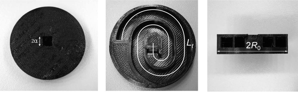 A A A The influence of thermo-hygrometric conditions on metamaterials’ acoustic performance: an investigation on a 3-D printed coiled-up resonator Matteo Cingolani 1 Department of Industrial Engineering, Università di Bologna Viale Risorgimento 2, Bologna, 40136, Italy Gioia Fusaro 2 Department of Industrial Engineering, Università di Bologna Viale Risorgimento 2, Bologna, 40136, Italy Massimo Garai 3 Department of Industrial Engineering, Università di Bologna Viale Risorgimento 2, Bologna, 40136, Italy ABSTRACT In the last decades, coiled-up resonators have become popular within the metamaterial research community for narrow band, low frequency resonances combined to subwavelength thickness. Such structures are particularly suited to one of the most widespread manufacturing processes, i.e. PET-based 3D printing. Acoustic performance of coiled-up resonators depends on the geometrical parameters’ variation, which is influenced by thermo-hygrometric conditions; however, the deformation itself needs to be further investigated. For this reason, the present paper evaluates the correlation between temperature, relative humidity, and the geometrical parameters’ (spiral length and hole diameter) deformations and, consequently, the acoustic performance of a 3D printed coiled-up resonator. A combined approach through analytical, numerical, and experimental measurements quantified the coefficient increasing the temperature (T = 10 – 50 °C) , and the relative humidity (RH = 20 – 50 – 80 %) of the samples. Relative humidity variations turned neglectable discrepancies on sound absorption’s peaks. On the other hand, the increase in temperature caused a frequency peaks’ shift following an exponential trend. This study can be a starting point for practical applications when the thermos-hygrometric variations are of concern. − − 1. INTRODUCTION Metamaterials have become more and more attractive in a wide range of scientific fields. Also in acoustics, the interest in metamaterials is quickly growing due to the variety of possible applications, 1 matteo.cingolani6@unibo.it 2 gioia.fusaro@unibo.it 3 massimo.garai@unibo.it «te a at inter.noise ausust scornsh eve er ca casPus from room acoustics to environmental noise control. AMMs are basically structures made by holes, channels, or resonant cavities [1-4], with specific absorption properties that go beyond the λ/ 4 mechanism and overcome the limitations of classic fibrous and porous materials. Coiled-up resonator is a specific kind of AMM based on the Helmholtz’s resonance phenomenon and its narrow band acoustic behavior is quite sensitive to variation of the geometrical dimensions. The geometry can be affected by deformations due to thermo-hygrometric variations [5] and the unwanted deformations can alter, consequently, the acoustic properties which the metamaterial had been designed for. Previous studies already investigated the relationship between tempera ture fluctuations and AMMs’ sound absorption [6,7] but experimental test focusing on thermal and hygrometric conditions could highlight a suitability and customizability of such systems in engineering applications. The present paper investigates how thermo-hygrometric variations affect the coiled up resonator geometry [8]. First, the analytical model has been used to design a specimen which has been manufactured through PETG 3-D printing. Then, a climate chamber has been employed to alter the specime n’s temperature (T = 10 – 50 °C) and relative humidity (RH = 20 – 50 – 80 %) The alterations in terms of frequency and amplitude of the resonance peaks were reported to quantify the effects of deformations on the sound absorption properties of the metamaterial under study. The outcomes can be a preliminary study for the tuning of AMMs in practical applications when thermo-hygrometric variations are of concern. – − 2. METHOD 2.1. Analytical model The coiled-up resonator is made up of a spiral tube embedded in a rigid circular disk and covered by a front panel and a back terminal layer, as shown in Figure 1. The section of the perforation and the spiral is square. The geometrical parameters the acoustical performances depend on are L t the length of the spiral, 2 a the side of the square perforation, and R 0 the radius of the circular sample. The sound Figure 1: Exploded view of the coiled up resonator: the spiral length L t , the side of the square hole 2 a , and diameter of the sample 2 R 0 are highlighted. absorption coefficient of the coiled-up resonator is defined as: 1 Z in − Z 0 . 2 (1) – Z in + Z 0 . α n = where Z 0 the characteristic impedance of air. Z in is the input specific acoustic impedance, defined as: Z in = Z t Z t = (2 a ) 2 (2) ϕ π R 2 0 where ϕ is the porosity of the front panel and Z t is the acoustic impedance at the opening of a tube with rigid termination (8) which depends on the spiral length L t , the effective density ρ ( ω ) and the effective compressibility C ( ω ). 2.2. 3-D printing Additive manufacturing is a widespread method used in acoustics to design metamaterial’s geometries because of affordable costs and wide variety of polymers that can be used. The coiled-up resonator has been manufactured through Fuse Deposition Modelling (FDM) using PETG. Different printing speeds and different printing qualities have been considered during the manufacturing process. Some printing parameters were kept constant: the extruder temperature (225 ◦ ), the platform temperature (80 ◦ ), the infill percentage (30%) and the infill density (2 mm/s). For all the other printing parameters, the finest setups of the printer have been used to obtain as much accuracy as possible. The variable printing parameters are summarized in Table 1 To obtain the most accuracy Table 1: Values of the variable printing parameters: the slow-fine combination of parameters has been used to print the specimen. Printing speed Slow | Fast Base speed (mm/s) 50 |