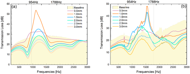 A A A Experimental and Numerical Studies on the Hilbert Fractal Architecture as an Acoustic Metamaterial Gianni Comandini 1 Bristol Composite Institute (BCI), Department of Aerospace Engineering, University of Bristol, UK. Valeska P. Ting2 2 Bristol Composite Institute (BCI), Department of Mechanical Engineering, University of Bristol, UK. Mahdi Azarpeyvand, 3 School of Civil, Aerospace and Mechanical Engineering (CAME) Department of Aerospace Engineering, University of Bristol, UK. Fabrizio Scarpa, 4 Bristol Composite Institute (BCI), Department of Aerospace Engineering, University of Bristol, UK. ABSTRACT We evaluate via experiments and numerical methods the transmission loss behaviour of Hilbert Frac- tal Metamaterials (HFMs)s tested in a four-microphone impedance tube. We explore the effect of the fractal order and widths of the cavity slots of HFMs 3D printed in PLA polymer. The COMSOL Finite Element models used here consider both thermoviscous and lossless domains. Tests and simulations have been carried out between 0.2 kHz and 3.0 kHz, with gap widths parametrised between 0.5 mm and 3.0 mm. A broad agreement is observed between the numerical models and the experimental results. The Hilbert fractal with the highest impact in terms of transmission loss is the one represented by the second order, with an experimental peak of almost 50 dB around 1600 Hz. All the HFMs orders show the presence of multiple TL peaks, with the gap width also a critical parameter to tailor the performance of these metamaterials. 1. INTRODUCTION The Hilbert is perhaps the most evaluated fractal geometrical shape for metamaterial platforms [1]. This peculiar fractal was initially investigated for antenna applications [2]. More recently, this 1 gianni.comandini@bristol.ac.uk 2 v.ting@bristol.ac.uk 3 m.azarpeyvand@bristol.ac.uk 4 f.scarpa@bristol.ac.uk worm 2022 space-filling curve has been the subject of studies related to acoustics [3]. In this work, we present a comprehensive numerical and experimental study of Hilbert fractal-based acoustic metamaterials, starting from fractal at order zero, until the fifth order. Samples have been produced using 3D print- ing of polylactic acid (PLA) material. By using PLA rather than other materials, it is possible to re- duce the environmental footprint of the prototypes made by additive manufacturing. All the samples after the experimental campaign were successfully recycled to produce new PLA filaments. 2. DESIGN AND TESTS The specimens have been designed with an inlet and an outlet on the opposite faces of the samples to allow the acoustic waves to pass through. The test rig used is an impedance tube with four micro- phones and white noise excitation. The test range is between 0.2 kHz and 3.0 kHz. Finite Element simulations have been performed using COMSOL Multiphysics to verify the experimental trends measured, with specific emphasis on the transmission loss (TL) effect provided by the fractal order, plus geometry features like the width of the gaps in the samples. Each fractal sample was produced with six different gap widths. The gap width ranges between 0.5 mm and 3.0 mm, with steps of 0.5 mm. To obtain reliable and statistically robust data, each sample was tested in the impedance tube five times on one side, and another five times by rotating the sample by 180 degrees with respect to the incoming acoustic wave direction. worm 2022 Figure 1: Hilbert fractals of (a) order zero, (b) first order (c) and second order. The design process involves a subdivision of the square area in equal portions with the relative centroid. On the left of each sample (a, b, and c) the process to generate the corresponding fractal geometry that starts from a square area. 3. DATA ANALYSIS The higher peaks of the transmission loss (TL) occur for a gap width of 1.0 mm. The transmission loss increases within the range of frequencies investigated here, for gap values varying from 0.5 mm to 1.0 mm. The values of TL decrease for all the five Hilbert fractal orders investigated, starting from 1.5 mm to 3.0 mm. The TL performance of the fractals is compared with the one of a baseline bulk PLA element with 30% filling volume. The comparison with the baseline underlines a worse insulation effect in all frequencies between 200 Hz and 3000 Hz for a gap width that is not 1.0 mm. In terms of TL, this behaviour happens in both simulations and experiments. According to both experiments and simulations, it appears that open- ings wider than 2.5 mm will perform worse than a simple cube of PLA with the same external dimen- sion (50.8 mm) as the metamaterial one. The peak region shown in Figure 2 is referred to the second- order Hilbert fractal. Between 954Hz and 1788 Hz, a peak with a similar magnitude is also shown by the finite element simulations. The comparison between predictions and experiments follows the same trend, underlining how the peaks broadly occur in the same interval of frequencies. The figures show that the highest contribution to the TL is the gap width (between 0.5 mm and 1.5 mm). After 2000 Hz, the finite element model provides a slightly different behaviour compared to the experi- mental data. Around 3000 Hz, the results converge around a narrow region near the baseline, as shown in Figure 2a. On the other hand, for the experiment, in Figure 2b, the transmission loss output of the experiments around 300 Hz they do not converge as in the COMSOL model. However, the FEM capture with a good approximation of the TL behaviour between 200 Hz and 2500 Hz. Figure 2: In figure (a), transmission loss FEM results of the six gaps width between 0.5 mm and 3.0 mm for the second-order Hilbert fractal and comparison with the baseline that is a cube of PLA. Figure (b) shows the experimental results for the same fractal and gap width. 4. FEM worm 2022 The finite element model used in this work is based on the use of three separate domains. The first one is represented by a mesh with lossless behaviour.