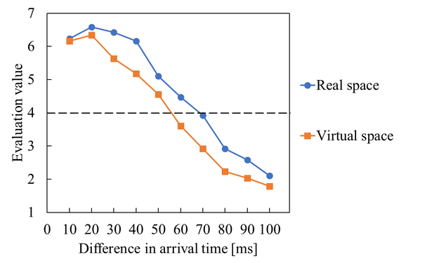 A A A Basic study on voice evacuation guidance system using the precedence effect in a virtual space with wall reverberation Takeru Daimon 1 Department of Electrical Engineering, College of Science and Technology, Nihon University, #1614, 3, Kanda-Surugadai, Chiyoda-ku, Tokyo 101-0062, Japan Ayumu Osumi 2 Department of Electrical Engineering, College of Science and Technology, Nihon University, #1614, 3, Kanda-Surugadai, Chiyoda-ku, Tokyo 101-0062, Japan Youichi Ito 3 Department of Electrical Engineering, College of Science and Technology, Nihon University, #1614, 3, Kanda-Surugadai, Chiyoda-ku, Tokyo 101-0062, Japan ABSTRACT We have studied a voice evacuation guidance system using the precedence effect, which is a psychoacoustic effect. This system can facilitate rapid evacuation to a safety area in environ- ments with poor visibility, such as those with smoke and dust, because it uses voice announce- ments to guide the evacuation. A basic design for the construction of a sound space suitable for the system and for sound adjustment in the field, such as of speaker position and sound pressure level setting, is required when applying this system to a building. In this research, we propose using virtual reality (VR) technology to support the basic design for constructing this system. If the basic design can be performed in the virtual space using VR technology, then the time required for constructing it can be significantly reduced because there is no need to experiment with it physically. In this study, we constructed a virtual space that reproduced the wall rever- beration of a real space and compared the reflection characteristics of wall between the two spaces. We confirmed that we could obtain the same level of evaluation characteristics for the precedence effect in both the real and virtual spaces. 1. INTRODUCTION Disaster prevention in large and complex underground buildings is very important. It is presumed that the psychological turmoil of evacuees increases in such buildings during the event of an earth- quake, fire, or other disaster. Additionally, it is difficult to offer evacuation guidance using only evac- uation guide lights when visibility is poor due to smoke. Under these circumstances, evacuees need to evacuate using their hearing only and without any reliance on sight. 1 cste21019@g.nihon-u.ac.jp 2 osumi.ayumu@nihon-u.ac.jp 3 itou.youichi@nihon-u.ac.jp worm 2022 The focus of this study is to develop an evacuation guidance system that can guide evacuation using sound only. We aim to achieve this by using the precedence effect to give directional sensitivity to the guidance sound [1-6]. The focus of this research is to establish an acoustic design method for implementing this system in various buildings, for example, concert halls, underground malls, etc. Previous studies have suc- cessfully applied this system to straight passages and large interior spaces, confirming that evacuees can be guided in any direction by creating the precedence effect throughout the space [7-8]. On the other hand, when implementing this system in a building, it is necessary to make adjust- ments in the field so that the system can operate optimally under a given set of acoustic characteristics. To address this issue, we seek to achieve the optimal acoustic design for producing the precedence effect by virtually reproducing the sound environment of the building using virtual reality (VR) tech- nology. In previous works, the same reverberation time as in a real space was convolved with the guidance sound in a virtual space to obtain a sound direction sensitivity that is almost the same as the real space [9-10]. As a basic study, we conducted an experiment to evaluate the sound direction sensitivity produced by the precedence effect by simulating it in a virtual space that reproduces the reflection characteris- tics of a wall in a real space. 2. PRINCIPLES OF EVACUATION GUIDANCE SYSTEMS The precedence effect is a psychoacoustic effect produced when the same sound arrives at the ear from two or more sources located at different positions; the sound is only heard from the direction of the source that reaches the ear first. As shown in Figure 1, to generate the precedence effect, the same sound was played from speaker A and then from speaker B with a delay ranging from several milli- seconds to several tens of milliseconds, so that the listener hears the sound from speaker A only. [11- 16]. worm 2022 Figure 1 : Schematic of the precedence effect. Figure 2 shows an image of an evacuation guidance system that uses the precedence effect. At this time in the passage, the guidance sounds from the speakers combine through the precedence effect. As a result, evacuees can hear the guidance sound only from the direction of the emergency exit, no matter where they are located. worm 2022 Figure 2 : Voice evacuation guidance system. 3. EXPERIMENTS FOR EVALUATING THE PRECEDENCE EFFECT IN THE REAL AND VIRTUAL SPACES 3.1. Evaluation experiments in the real space Figure 3 shows the experiment for evaluating the sound direction sensitivity of the precedence effect in the real space, and Figure 4 shows a schematic view of the experiment. Two speakers, speaker A (preceding sound) and speaker B (succeeding sound), were placed on a line collinear with the participant's ears. Figure 5 shows a block diagram of the setup for playing the guidance sounds. The two speakers played the announcements shown in Table 1. The guidance sounds (60 dB) were played at the position corresponding to the center of the head (3 m from the speaker and 7 cm from the headphones). The experiment was conducted near the center of a building space measuring 16 m (length) × 13 m (width) × 3 m (height) (with a reverberation time of about 0.9 s and a background noise of about 37 dB), which is shown in Figure 6. The participants wore a head mounted display (HMD) and were presented with the visual information. Figure 3 : Experimental setup. Figure 4 : 